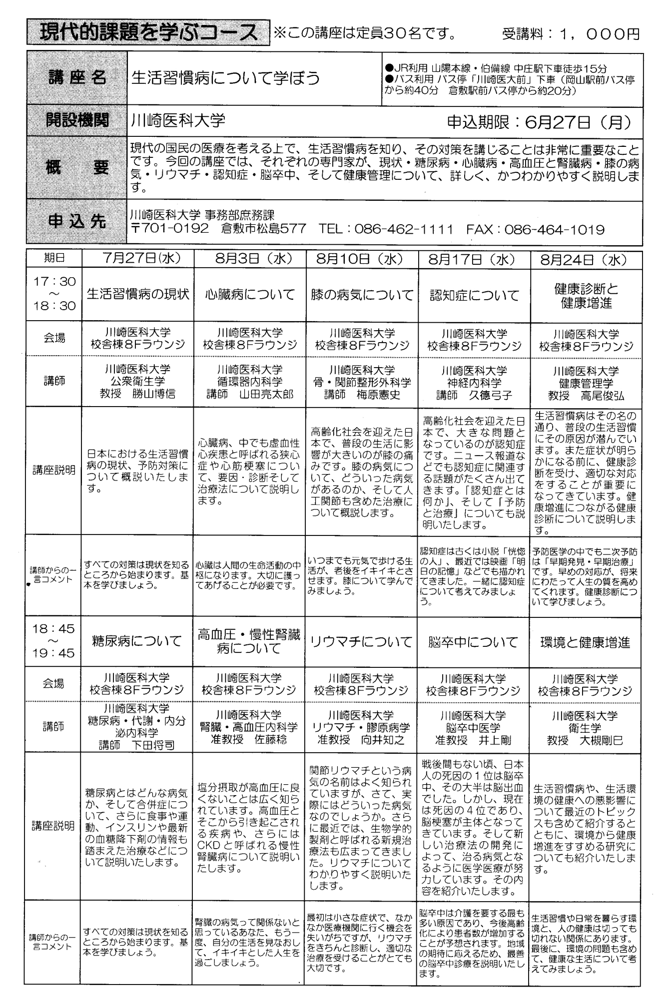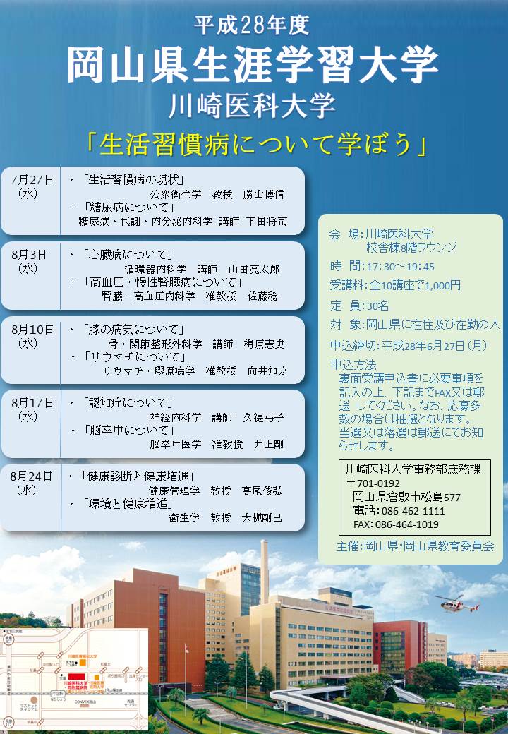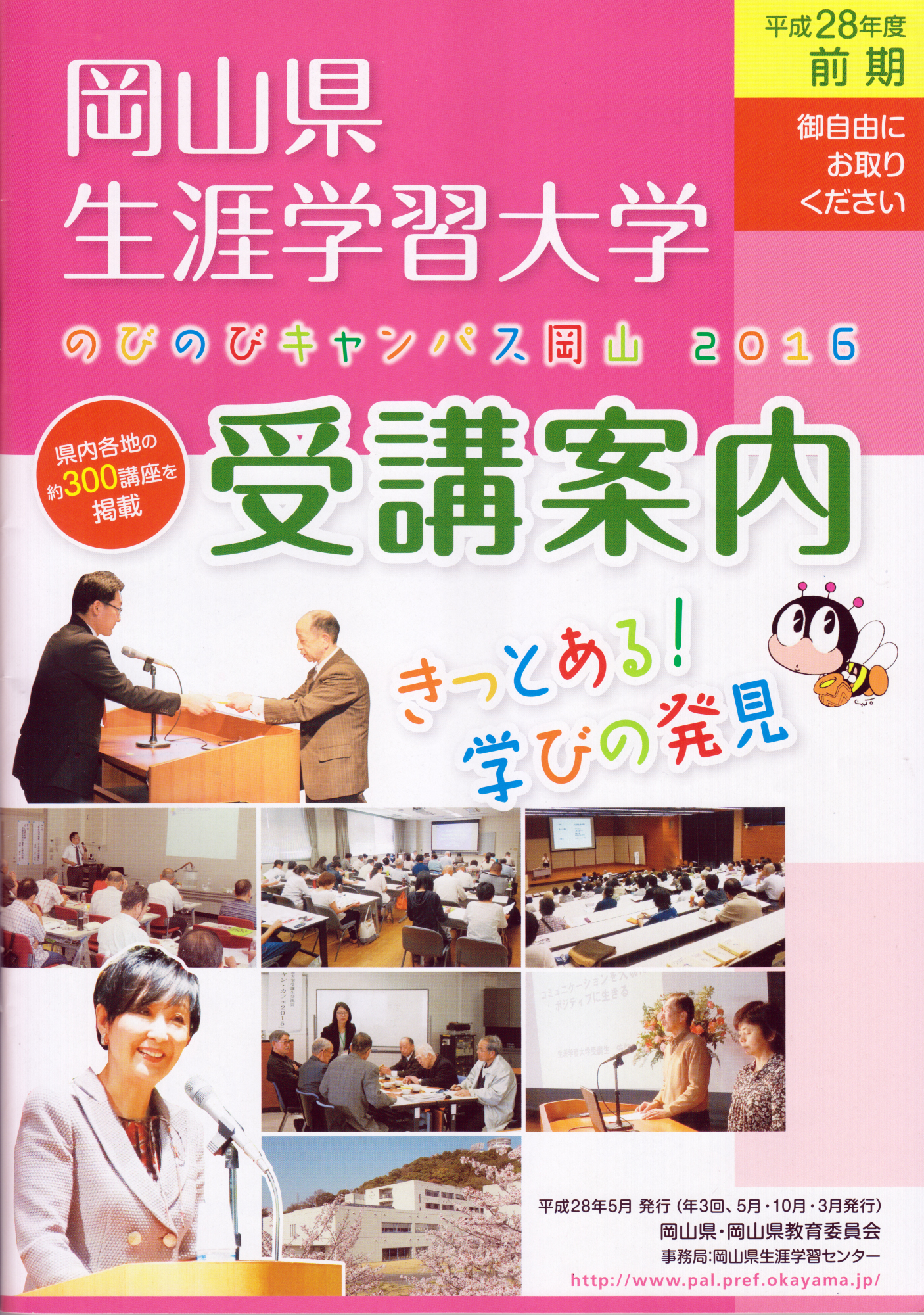 今年度初めて,岡山県が展開されている【岡山県生涯学習大学】に応募して採択されました。川崎医科大学で,一般市民の方を対象に,10コマシリーズの学習講座を設けることで,県から予算も頂戴するシリーズです。かつ,受講者の皆様からは,10コマ全体で1,000円の受講料をお支払いいただいて,それは県に戻すことになるというシステムです。