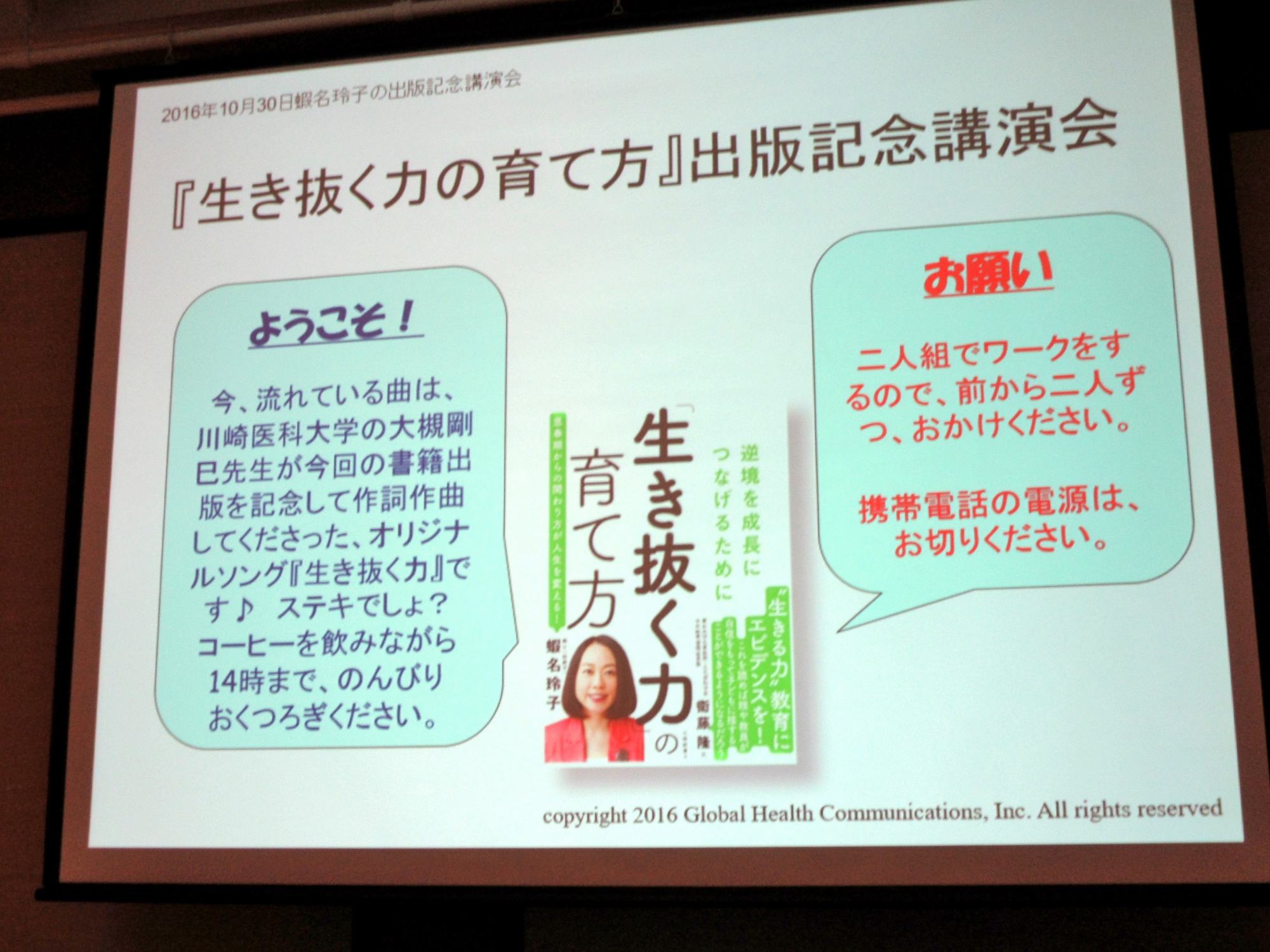 今日は,せっかく,初の出版記念講演会ってことで key term の「生き抜く力」にちなんでオリジナル曲を贈呈!!