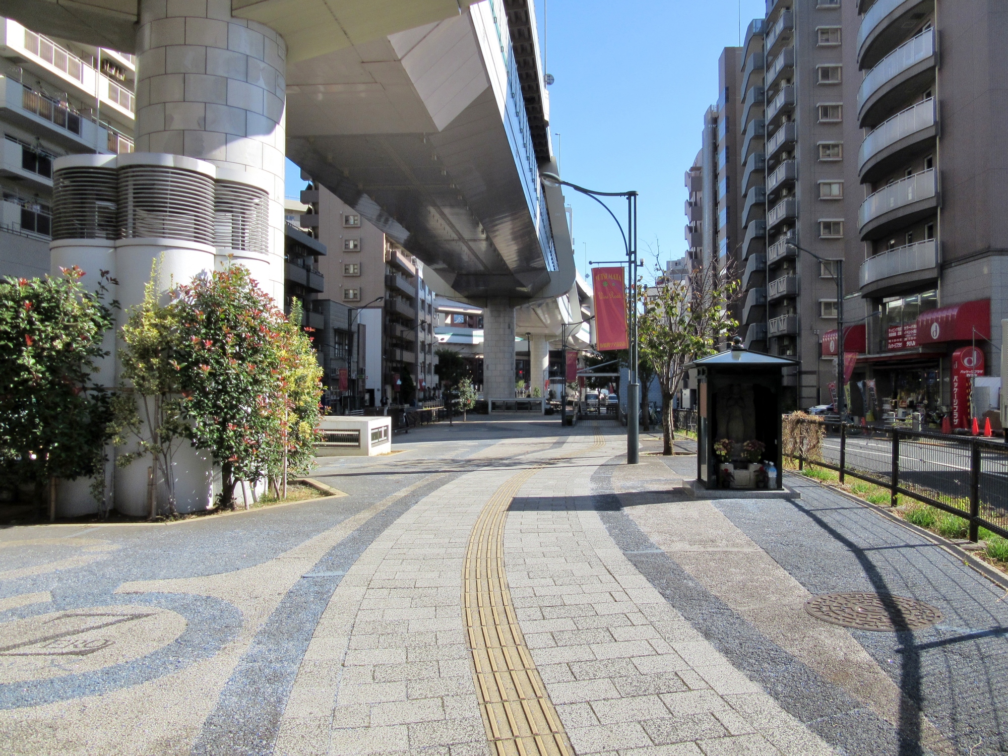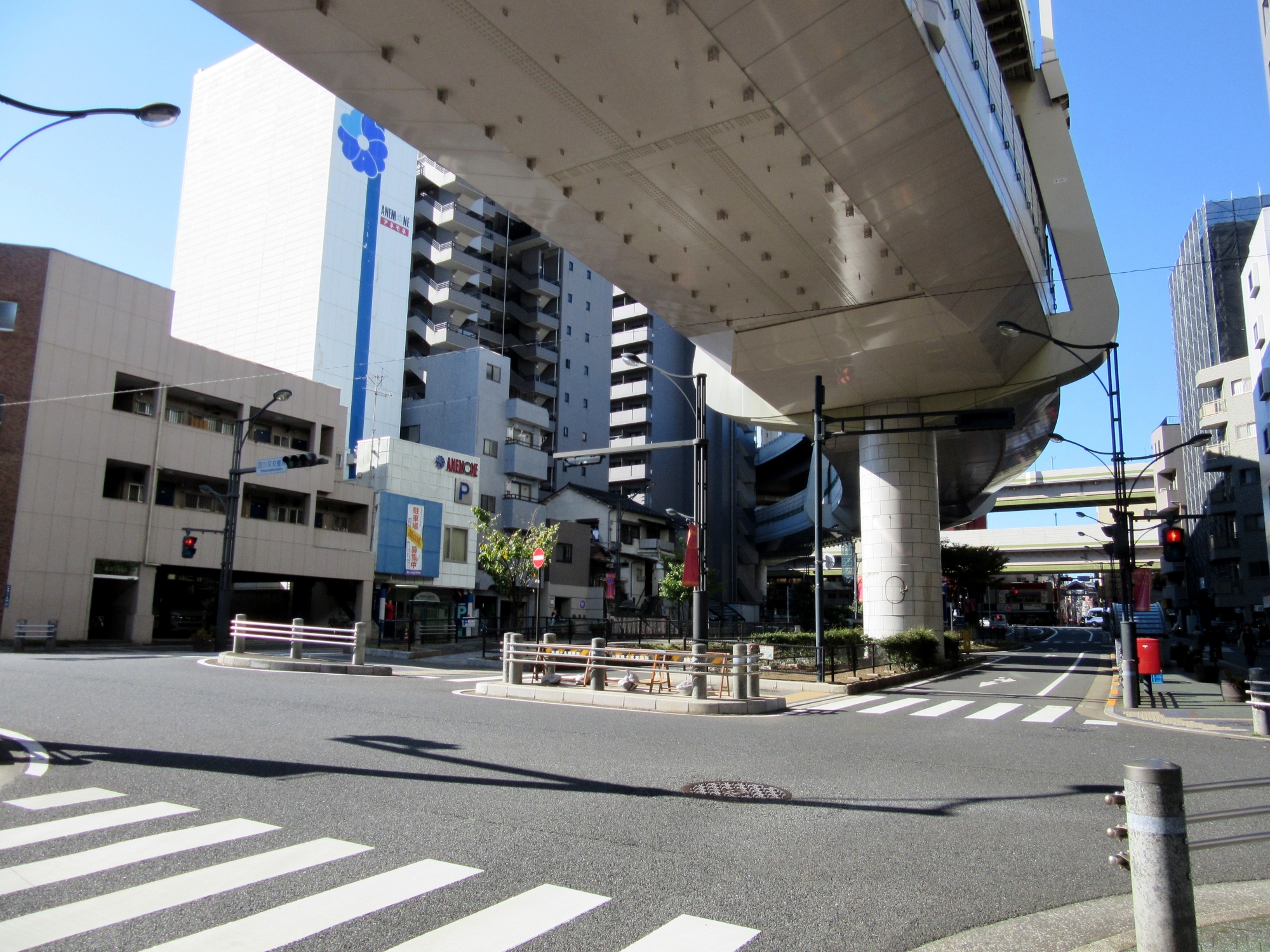 四ツ又交差点,そして旧川越街道! 四ツ又は,旧川越街道と池袋への高田道で,四つってことらしく。でも,今,旧街道は,広い道のど真ん中・・センターラインの代わり的ですが,そこにも四ツ丸馬頭観音もあったり・・・・。首都高の下に,こんな歴史って面白い!