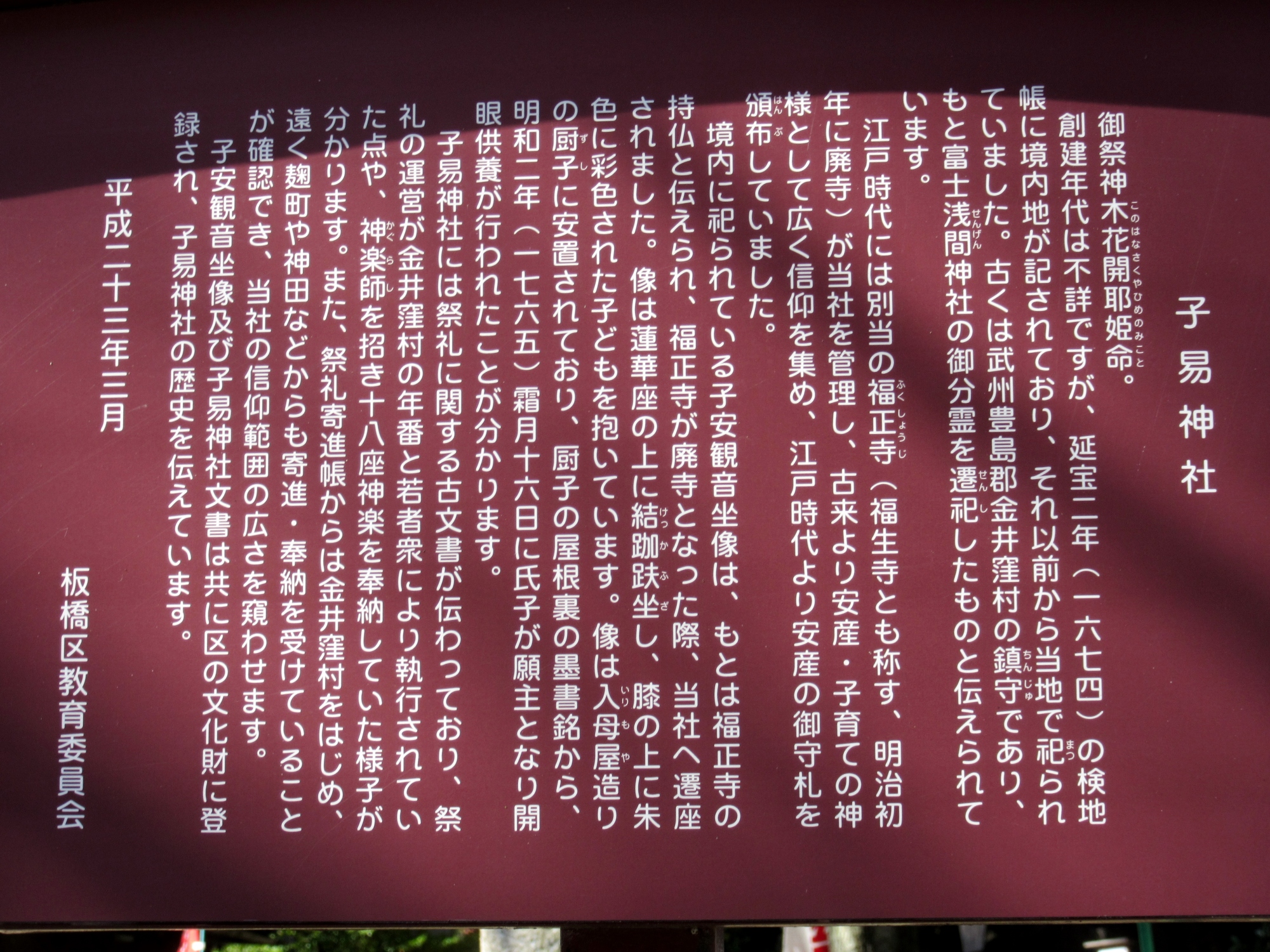 【創建年代不詳なれど、富士浅間神社の分霊を勧請し、江戸時代子安宮又は子安神明とも称し明治初年子易神社と改称、古来より安産、子育、保育として信仰を遠方より集め、家内安全、商売繁栄と共に御神徳を仰ぐ神社である。】です。