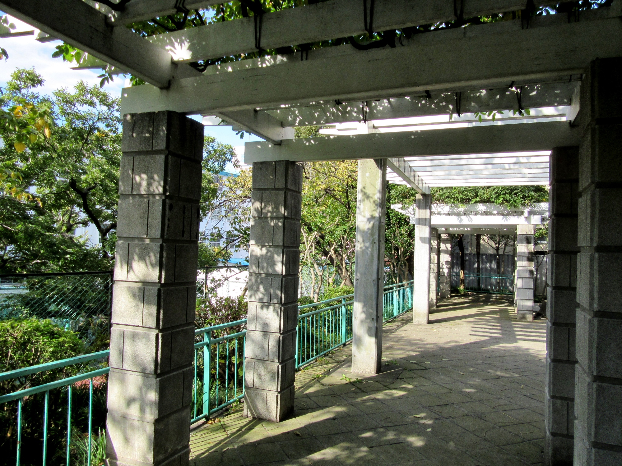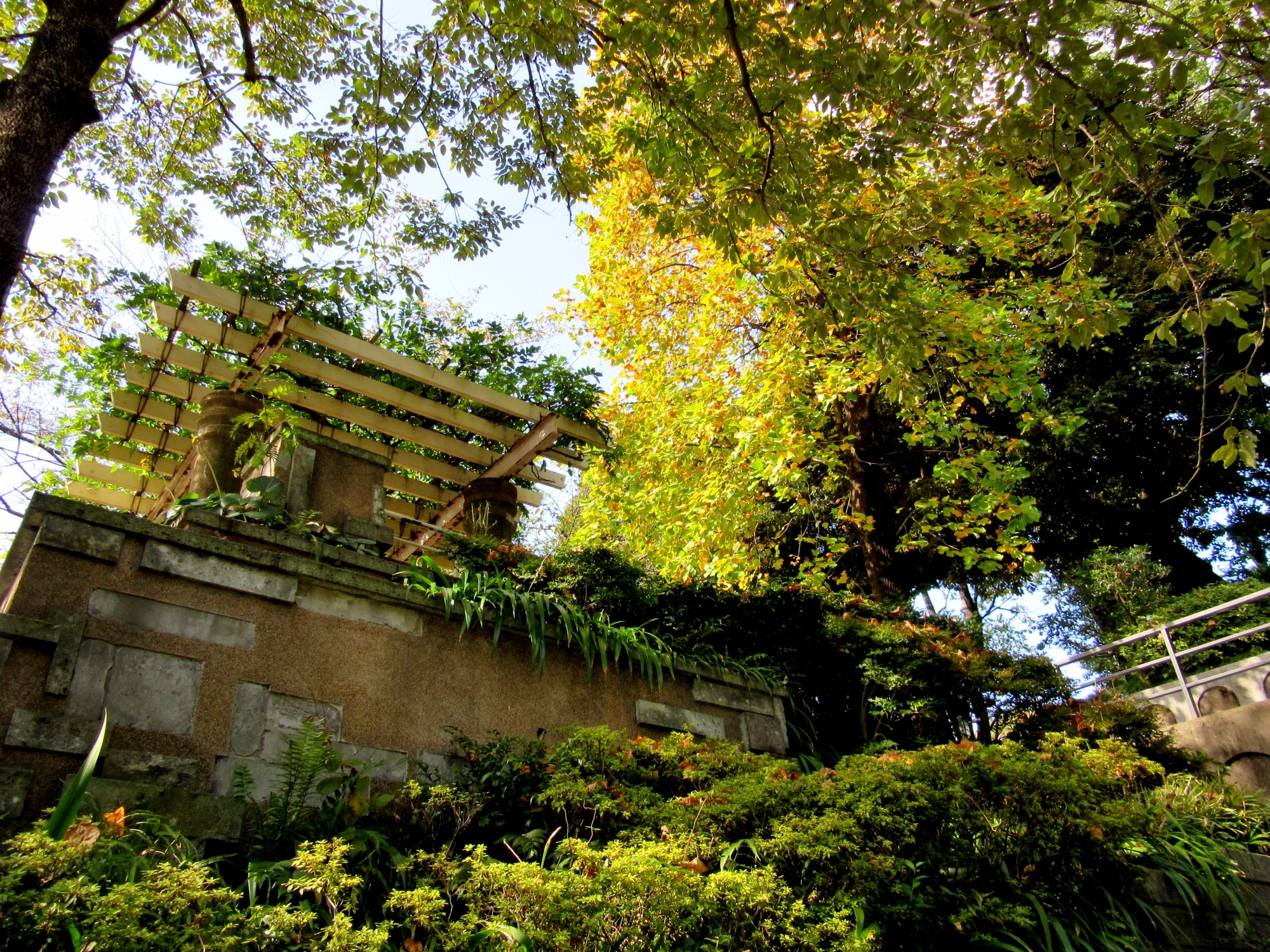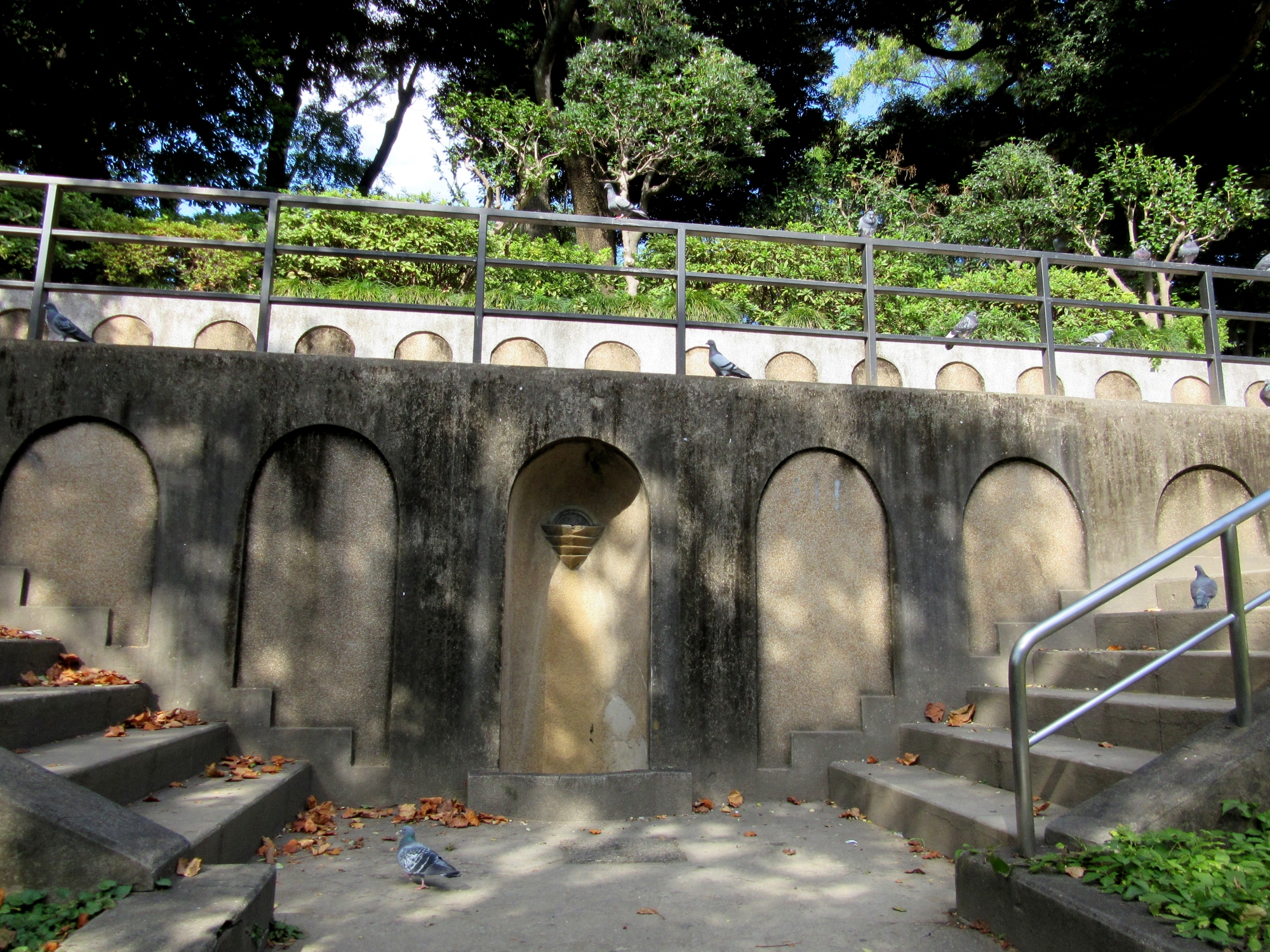 【第二次世界大戦中、金属類の供出により、公園は、鳥小屋、門扉などを失いました。外柵は開園当初、鋳鉄製だったようですが、かわりにコンクリートが使われました。この公園の歴史的価値を見直し、昭和50年代、公園の復原的改修を行いました。外柵は鋳物での復原はできなかったものの、角パイプを加工し、デザインを復原しました。ほかにも、表面仕上げなど当時の図面を参考に改修を行いました。】だそうです。