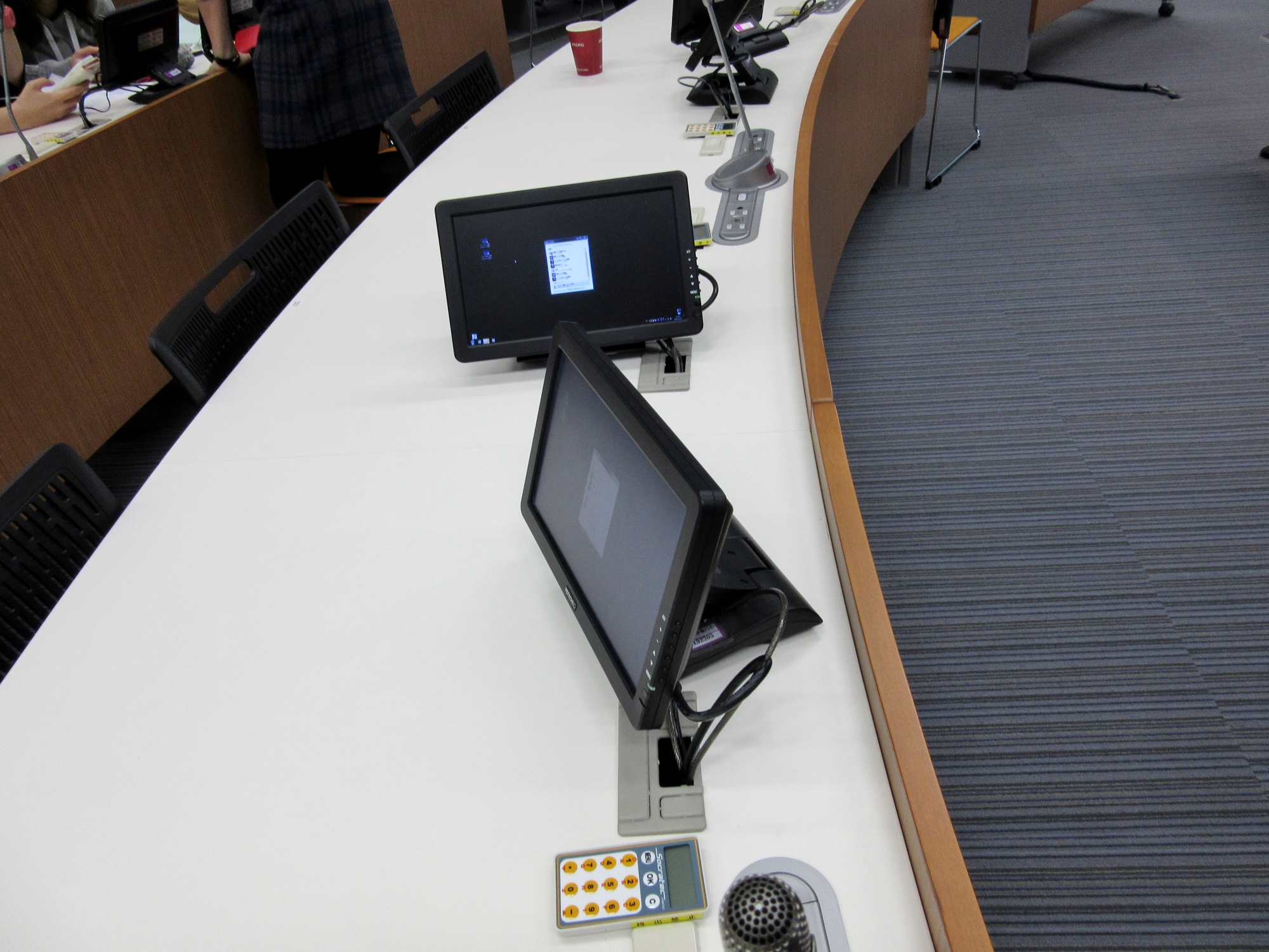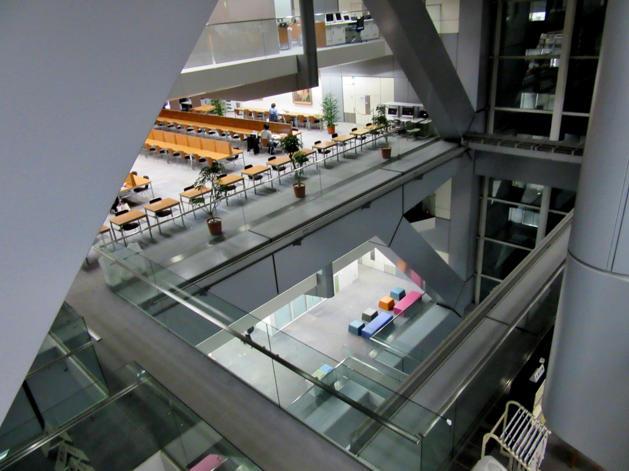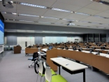 講義室すごい! 全座席にモニターはあるし,吹き抜けで,スクリーンの向こうは図書館かな,とかが見えています!