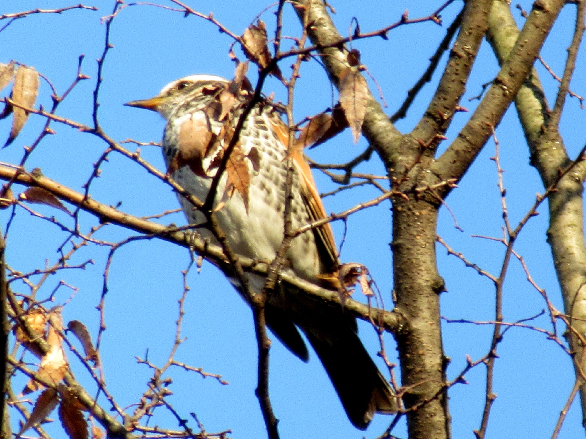 大晦日に仕事を終えて帰宅の病院玄関前の庭の枯れ木に・・鳥が囀っていました。