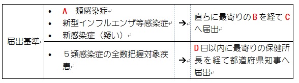 感染症の届出について,表のA,B,C,Dとして正しいのはどれか。