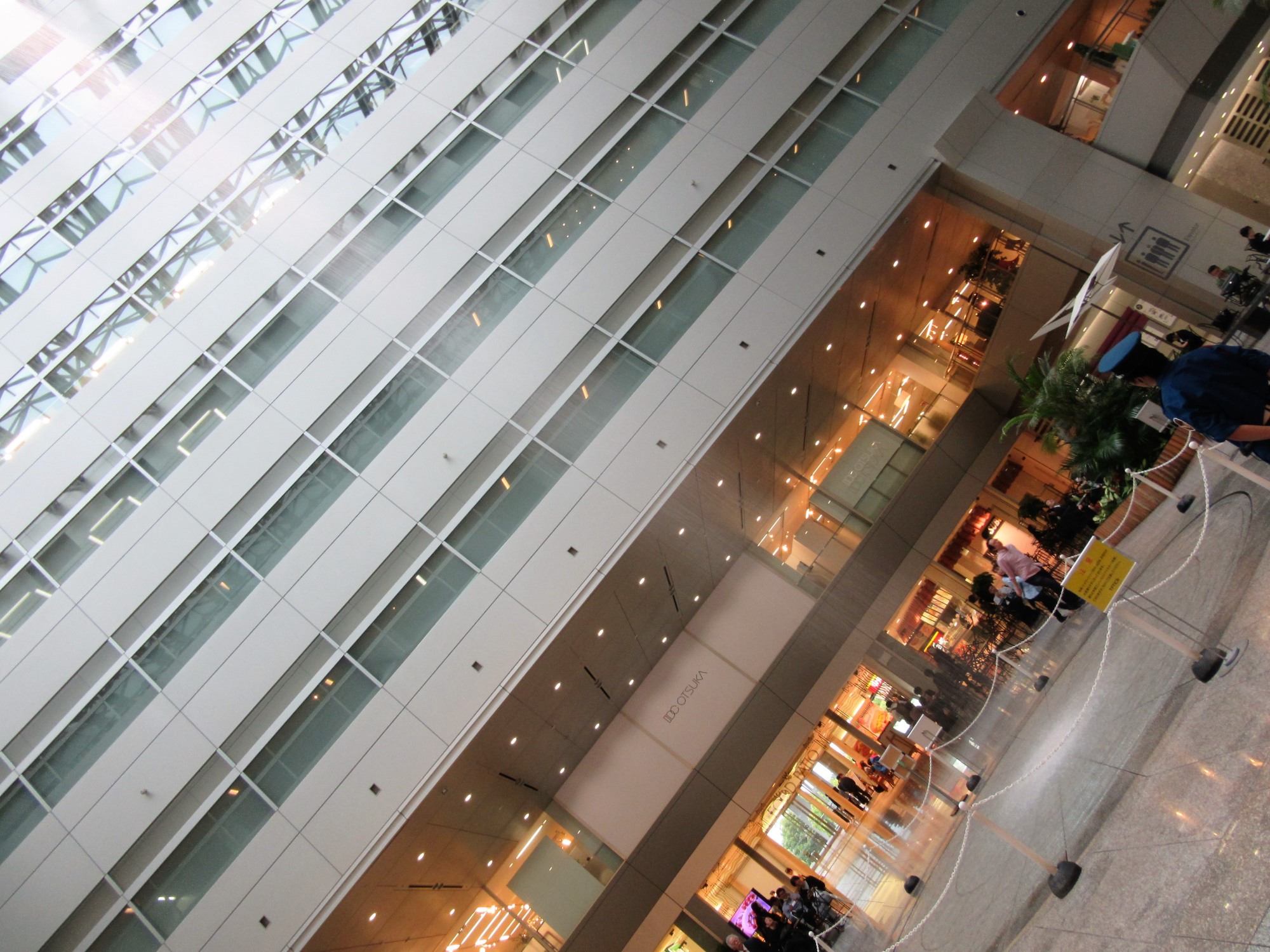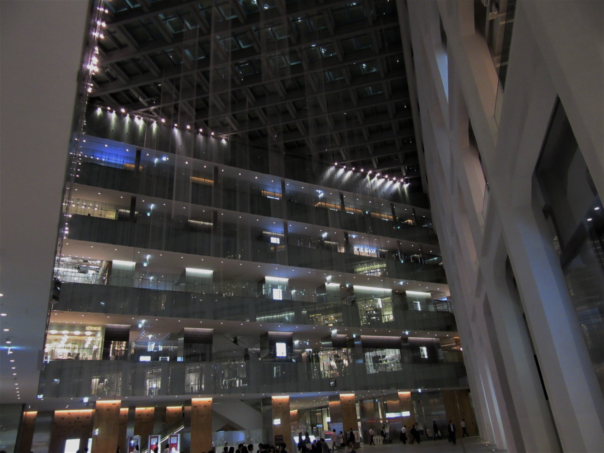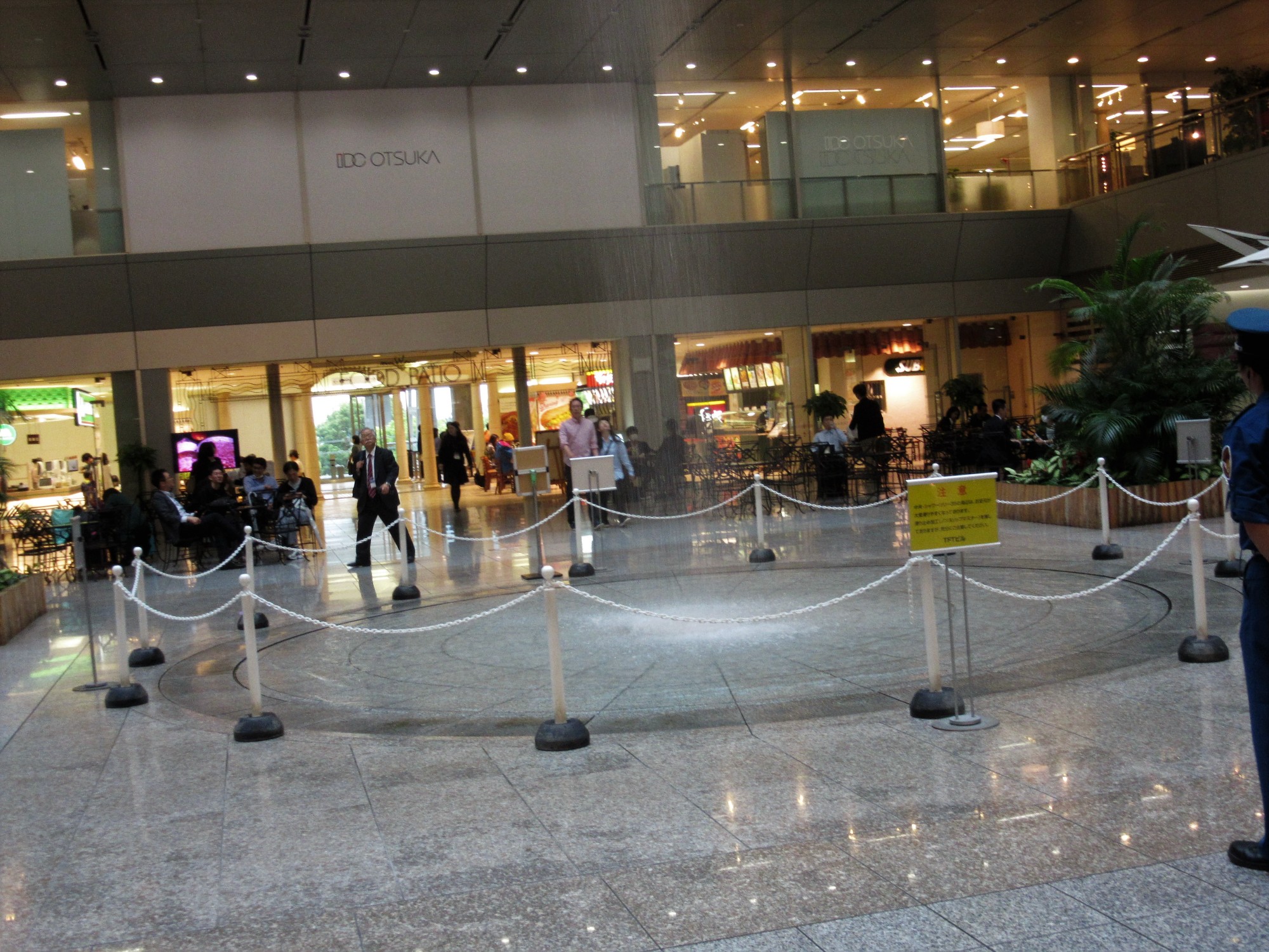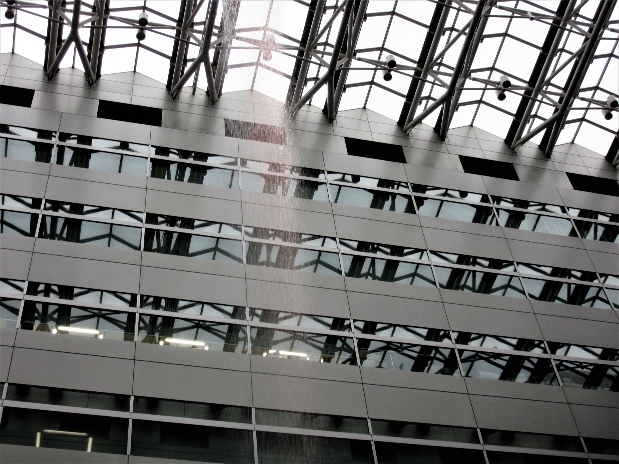 屋内の雨は,噴水ならぬ落水が9Fの上の天井から吹き抜けまで落ちています。