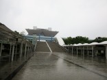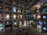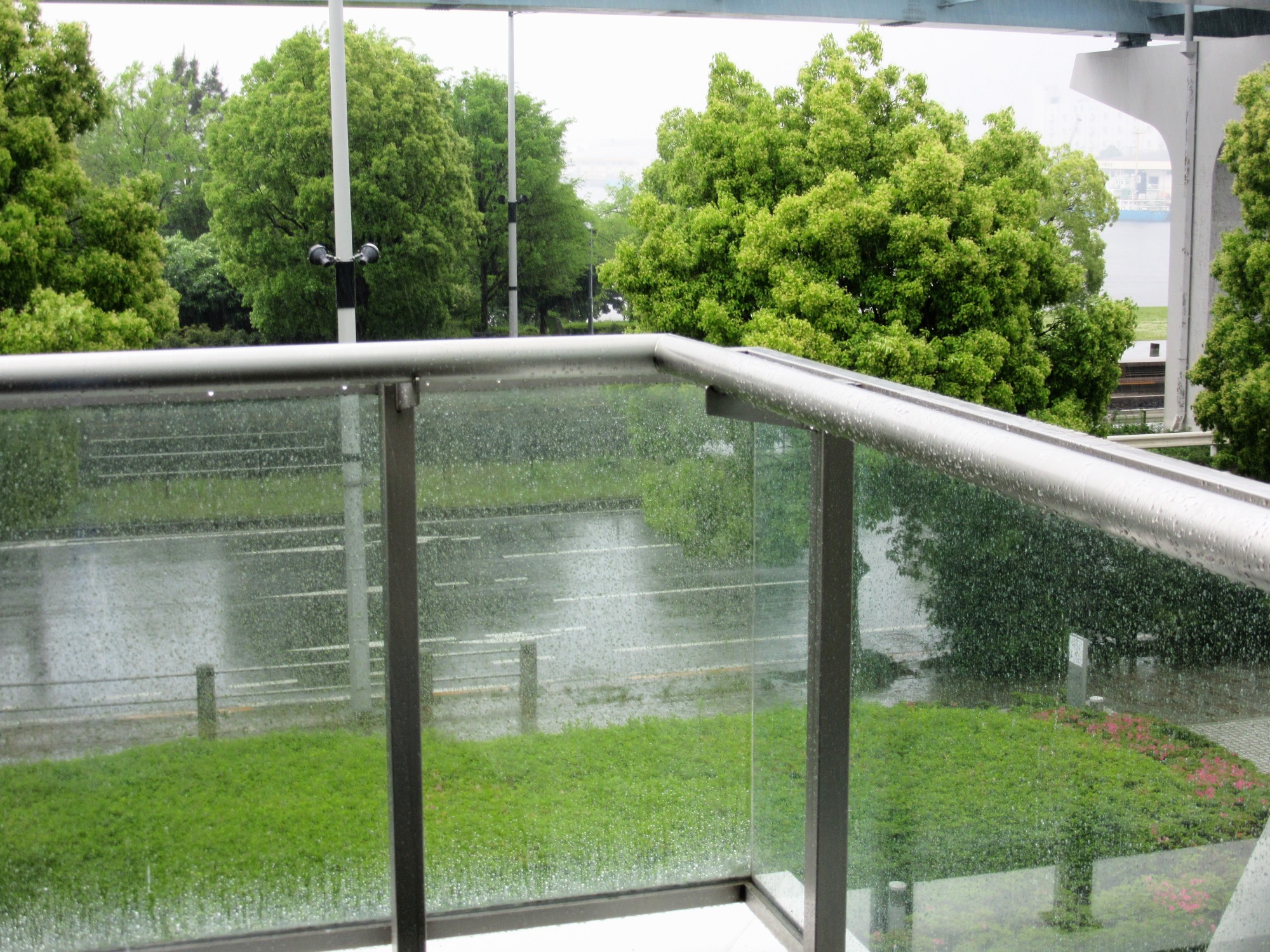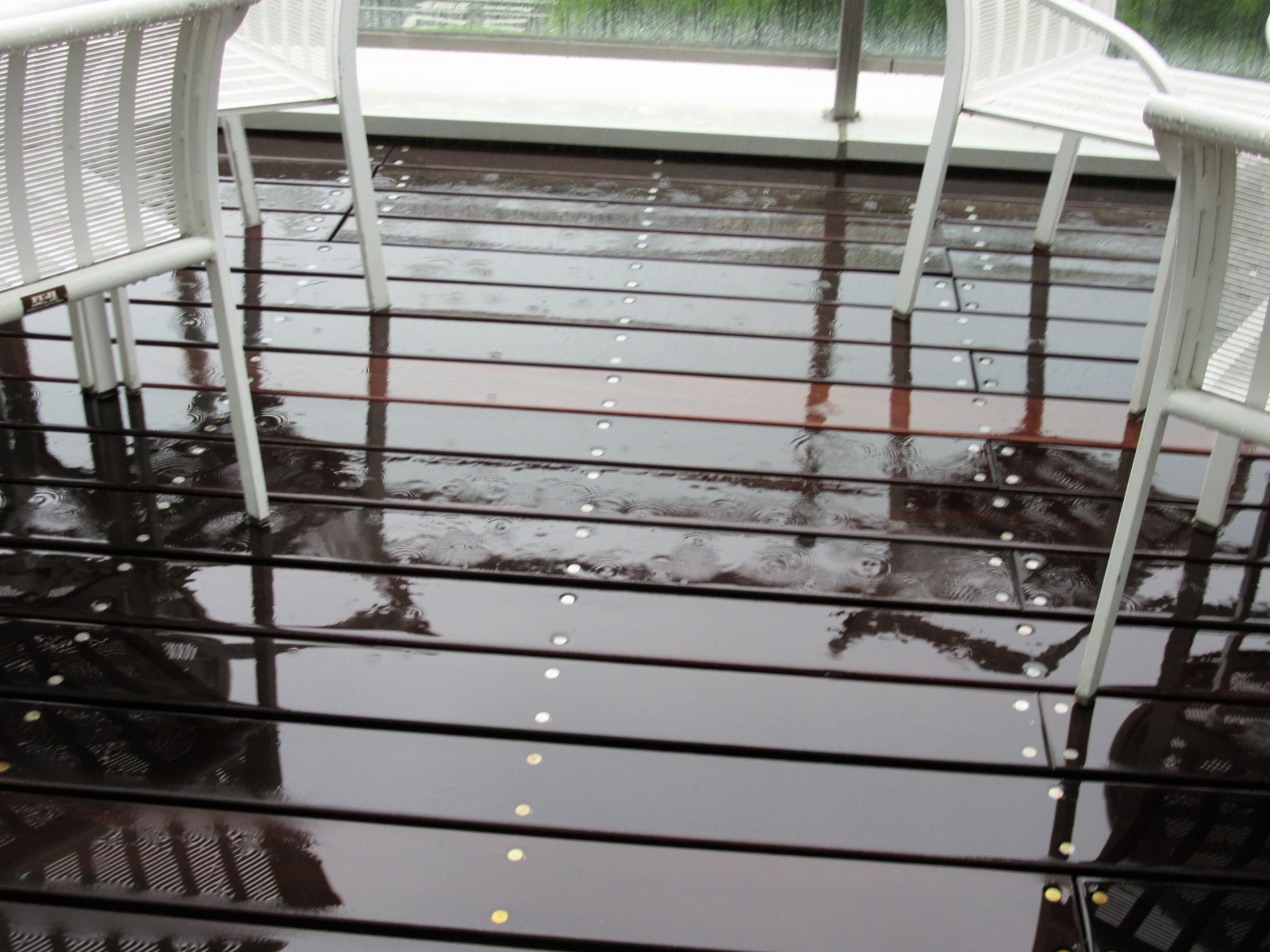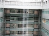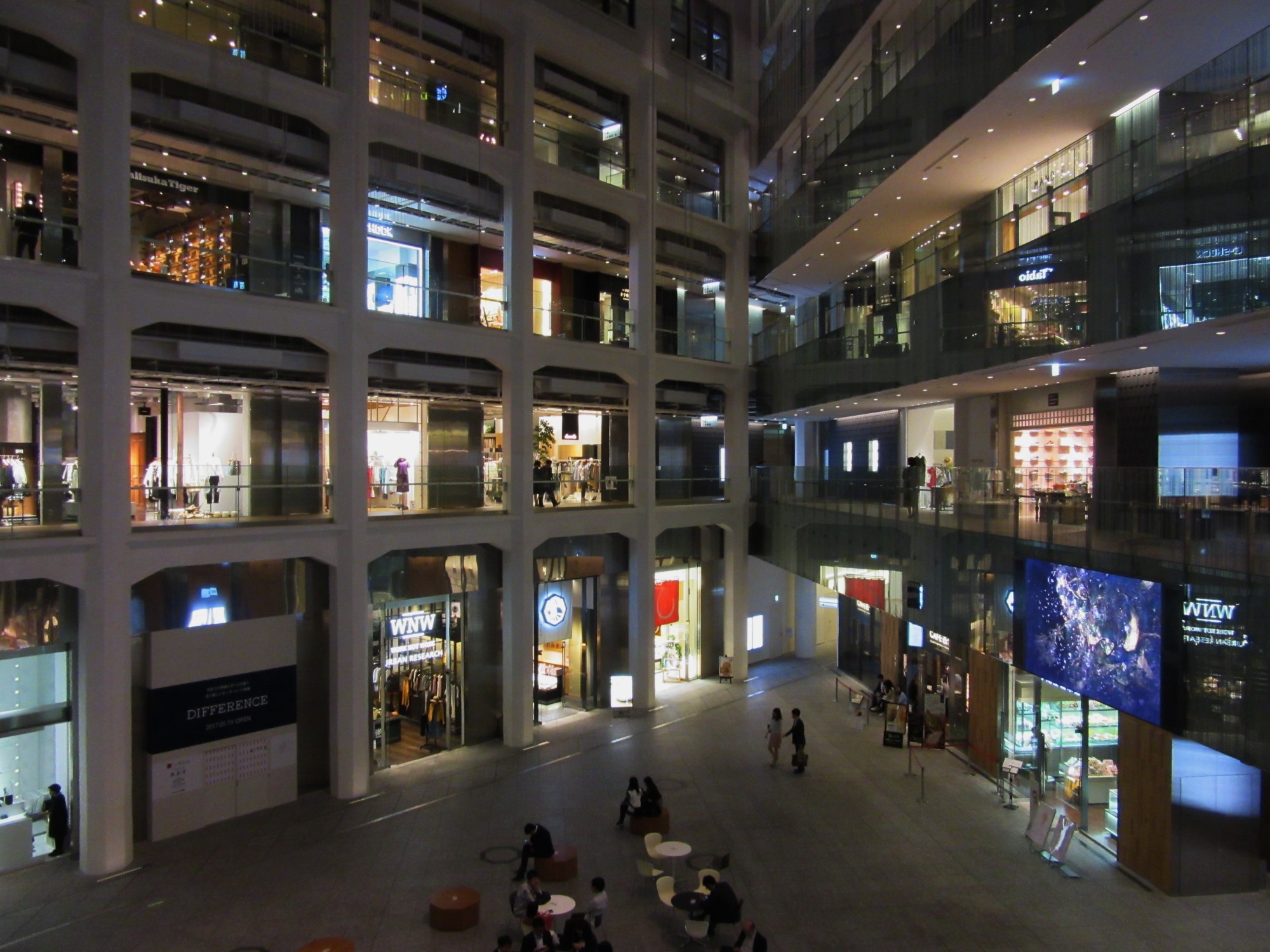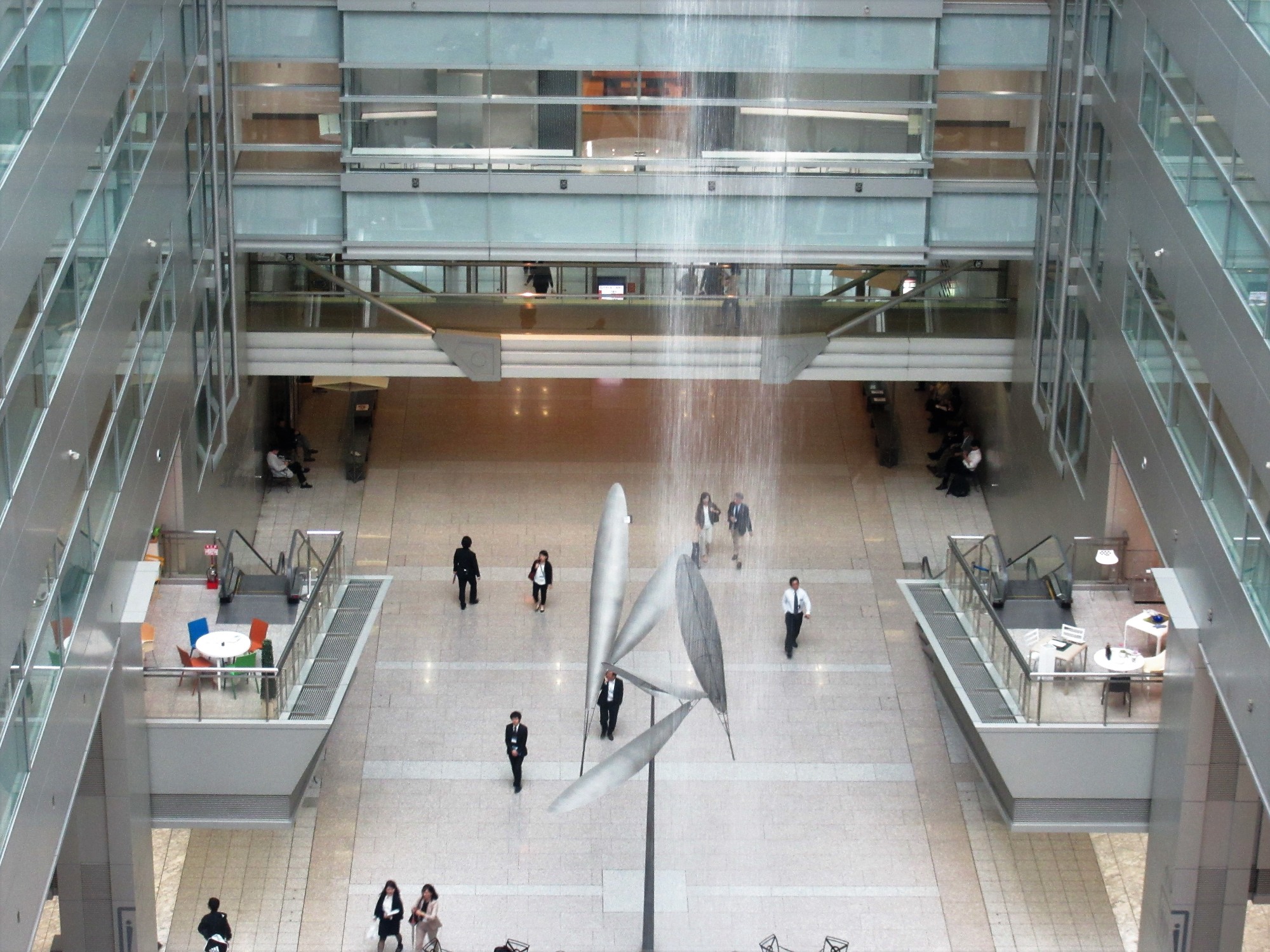 屋内の雨は,噴水ならぬ落水が9Fの上の天井から吹き抜けまで落ちています。