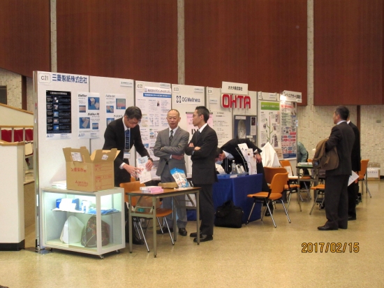 | さらに企業からの出展については,本学がここ数年,連携をもってきた県内の産学官連携,特に医工連携に関連する「メディカルテクノおかやま」,「岡山県医用工学研究会」さらに「おかやま生体信号研究会」,加えてすでに2014年1月に学内でも展示会を催していただいた「メディカル・ネット岡山」,さらには「医療機器プロモートおかやま」などにご協力を得るとともに,医工のみでなく,健康をキーワードに栄養や福祉といった側面での展示もお願いしたいということで,岡山県産業振興財団の方々にお願いして福祉機器のクラスターである「ハートフルビジネスおかやま」,食や農を中心に生理活性物質研究を進めている「おかやまバイオアクティブ研究会」などのご協力を仰ぎました。特に「医療機器プロモートおかやま」の代表の方からは積極的なご協力を頂戴し,関西や関東など県外の企業あるいは製造販売資格を持たれている企業などへのお声掛けを実施してくださいました。 | |