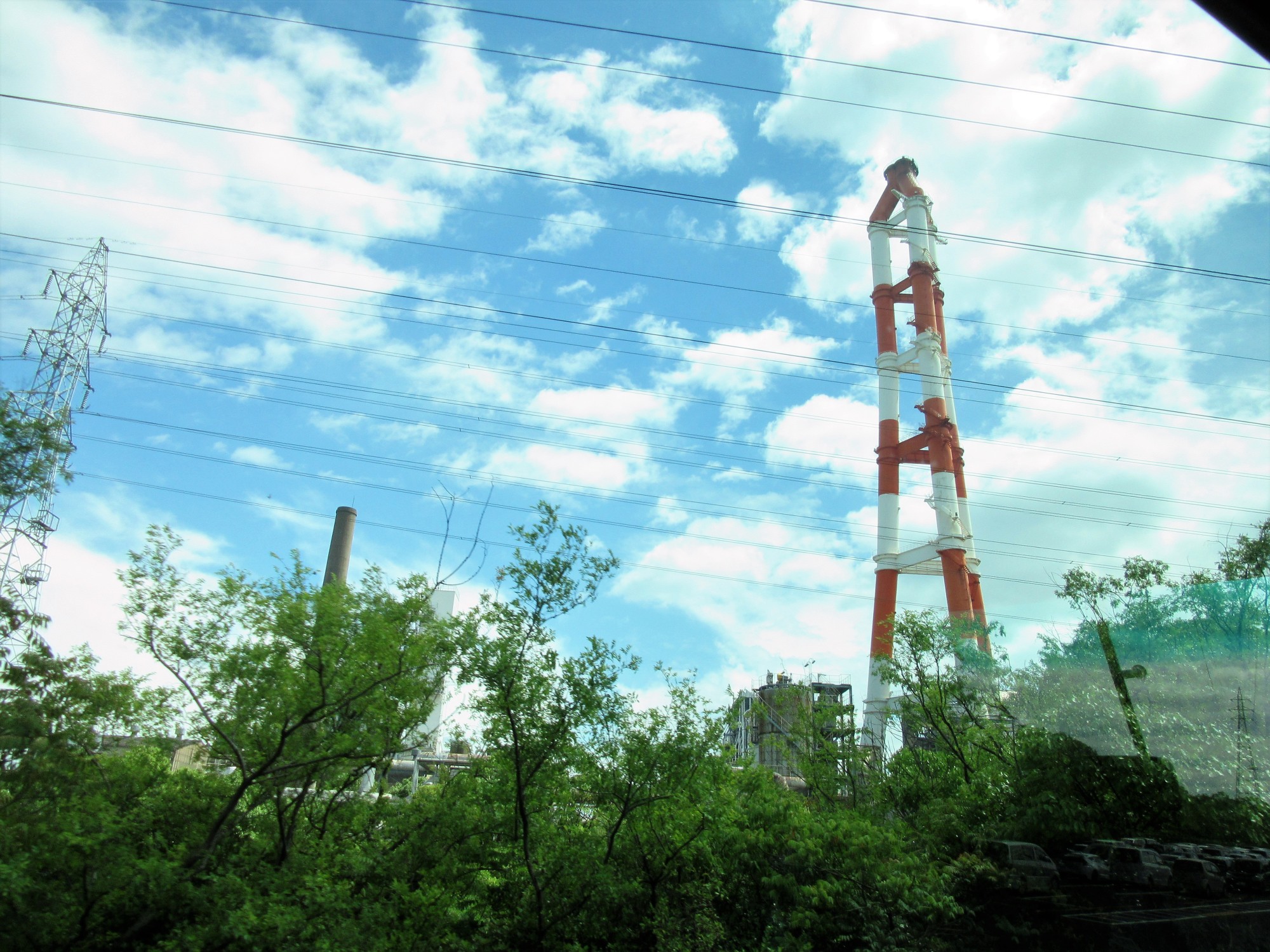 180mの煙突はやはり高い!・・・すぐ横の20m級の煙突が公害被害当時の一般的な高さだったそうで,そりゃあ,青空が遮られるねって感じますよね。