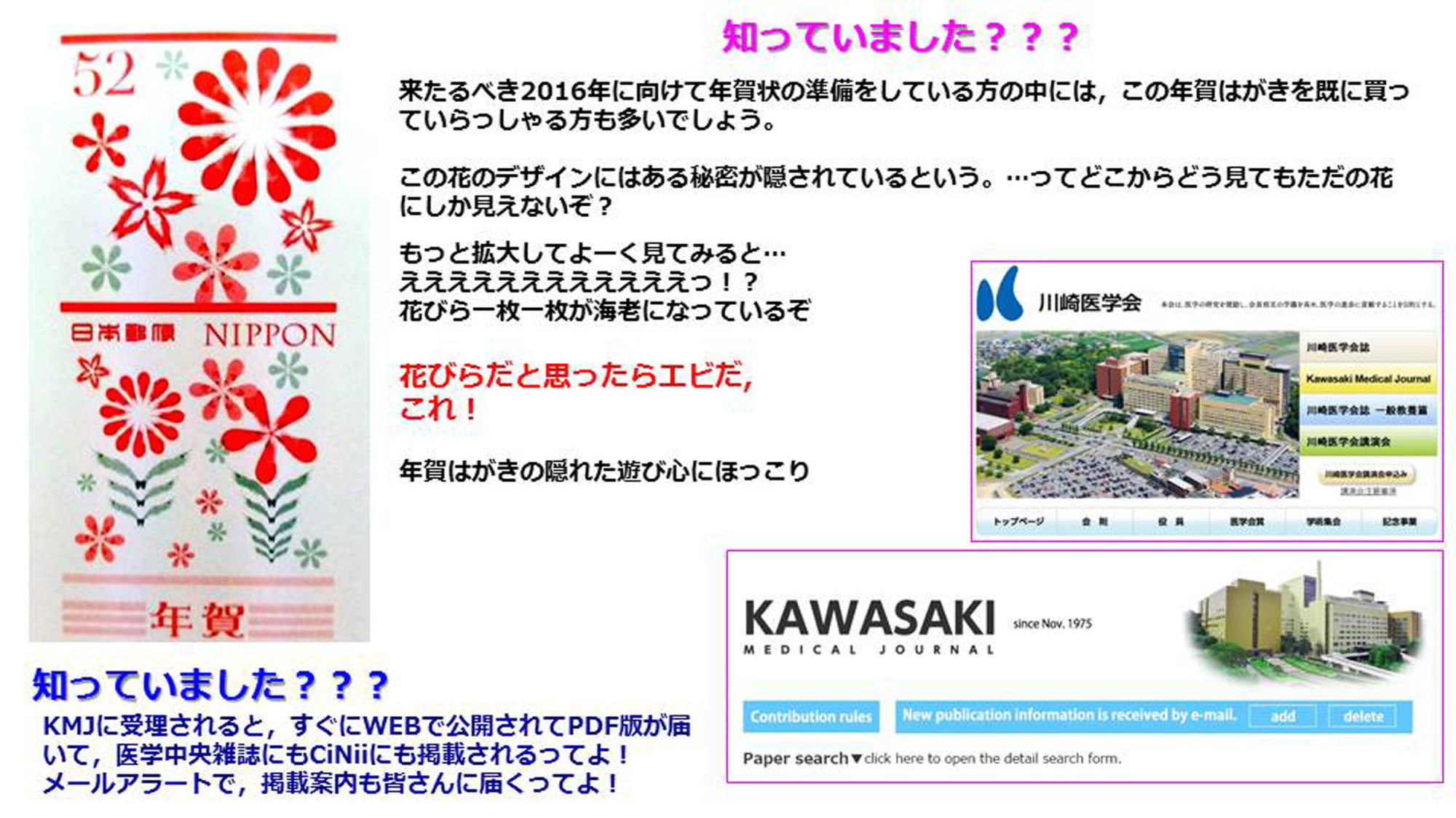 大槻が運営委員長・編集委員長を担当している川崎医学会・・・8/05の川崎医科大学学術集会では,これまでサイネージで投稿促進のPRをしてきたものをまとめて,ポスターにします。