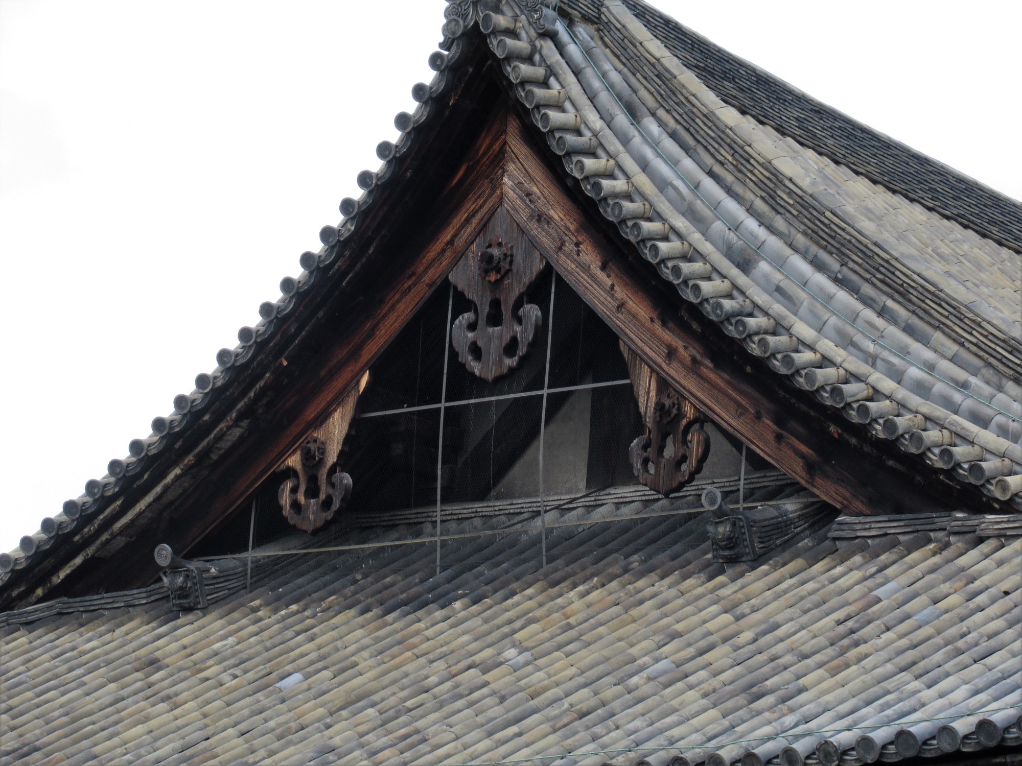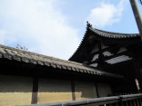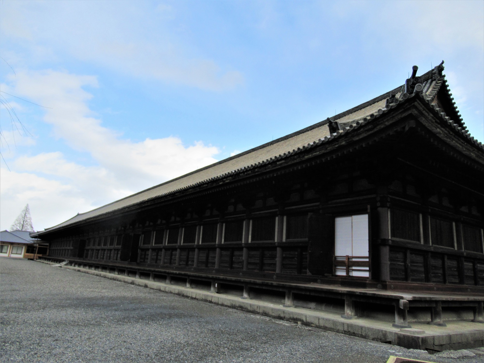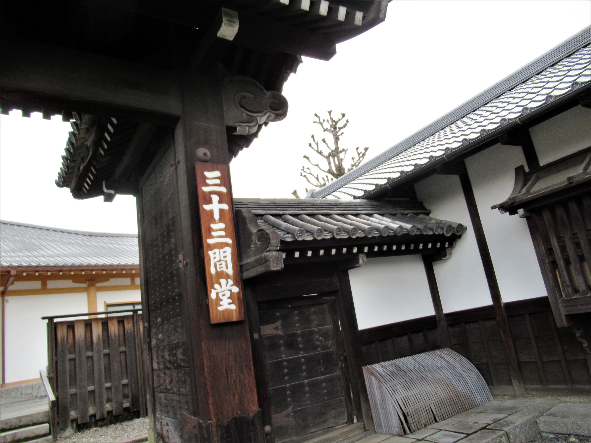 【この地には、もともと後白河上皇が離宮として建てた法住寺殿があった。その広大な法住寺殿の一画に建てられたのが蓮華王院本堂、今に言う三十三間堂である。上皇が平清盛に建立の資材協力を命じて旧暦の長寛2年12月17日(西暦1165年1月30日)に完成したという。創建当時は五重塔なども建つ本格的な寺院であったが、建長元年(1249年)の火災で焼失した。文永3年(1266年)に本堂のみが再建されている。現在「三十三間堂」と称される堂がそれであり、当時は朱塗りの外装で、内装も極彩色で飾られていたという。建築様式は和様に属する。桃山時代には、豊臣秀吉の東山大仏(方広寺)造営により、三十三間堂もその境内に含まれ、周囲の土塀や門などが整備された。「三十三間堂」の名称は、間面記法による表記「三十三間四面」(#構造)に由来する。「33」は観音に縁のある数字で、『法華経』等に観音菩薩が33種の姿に変じて衆生を救うと説かれることによる。俗に「三十三間堂の仏の数は三万三千三十三体」というのは、本尊と脇仏の一千一体がそれぞれ33に化身するからである。】だそうです。
