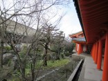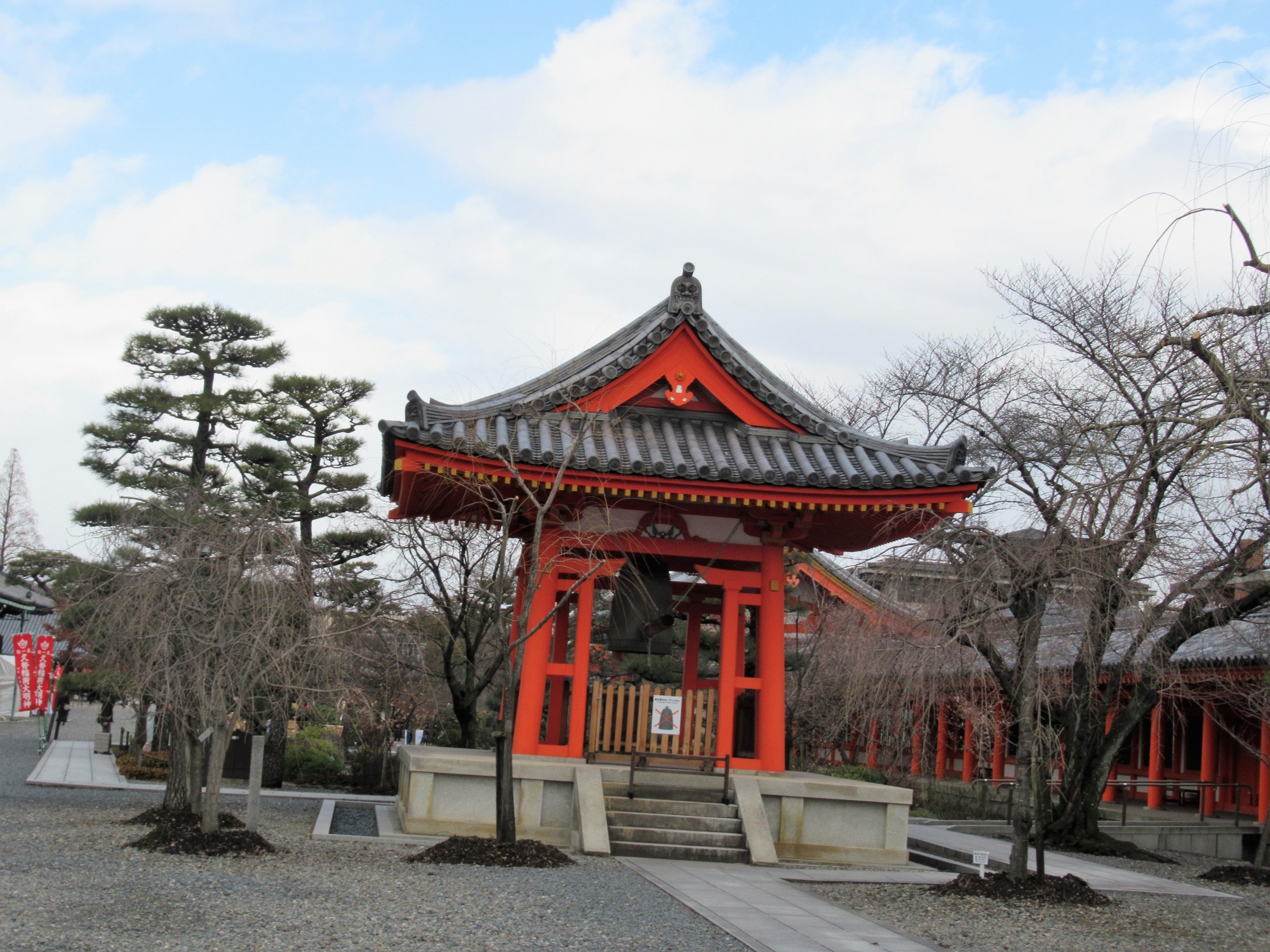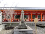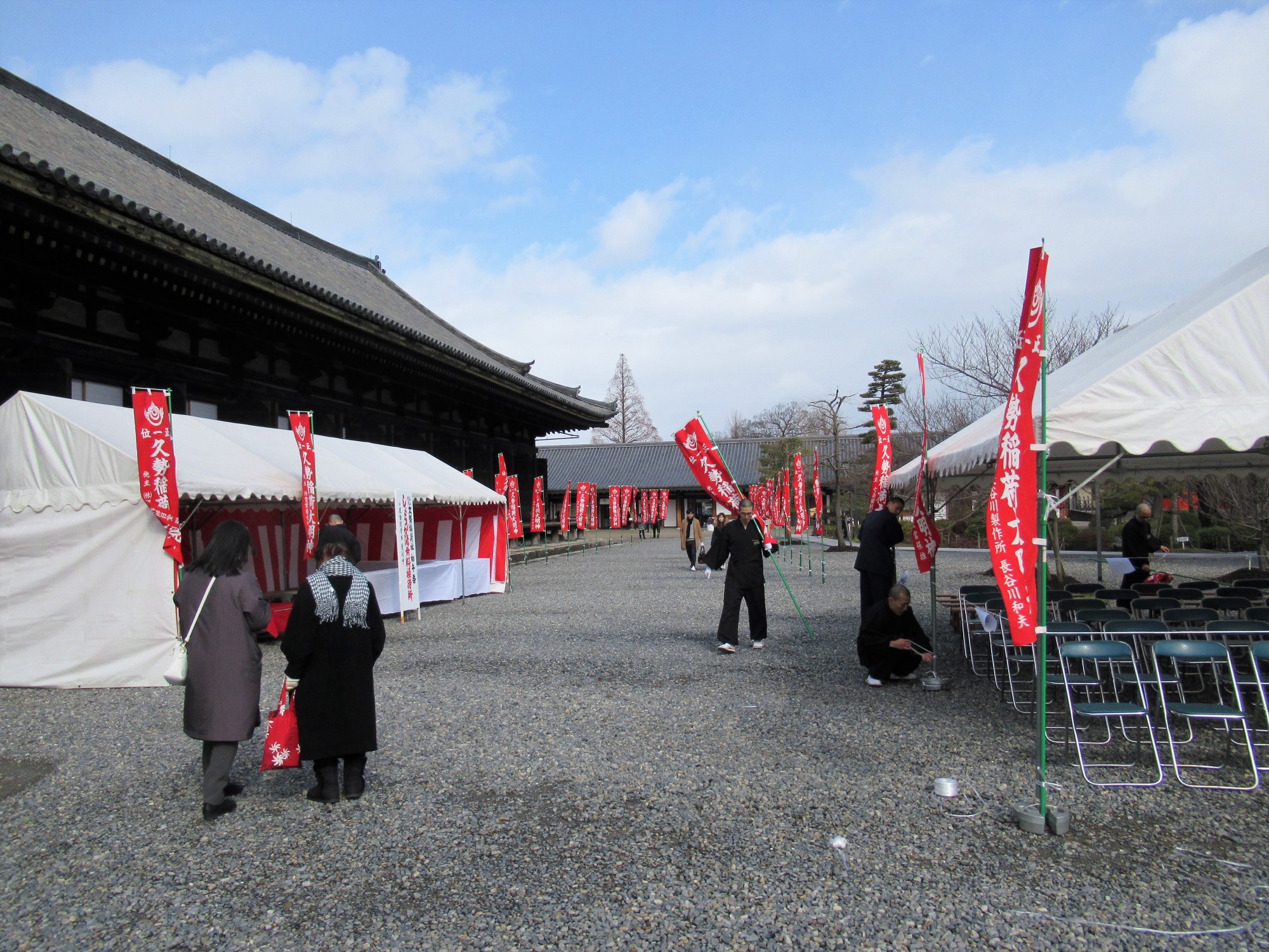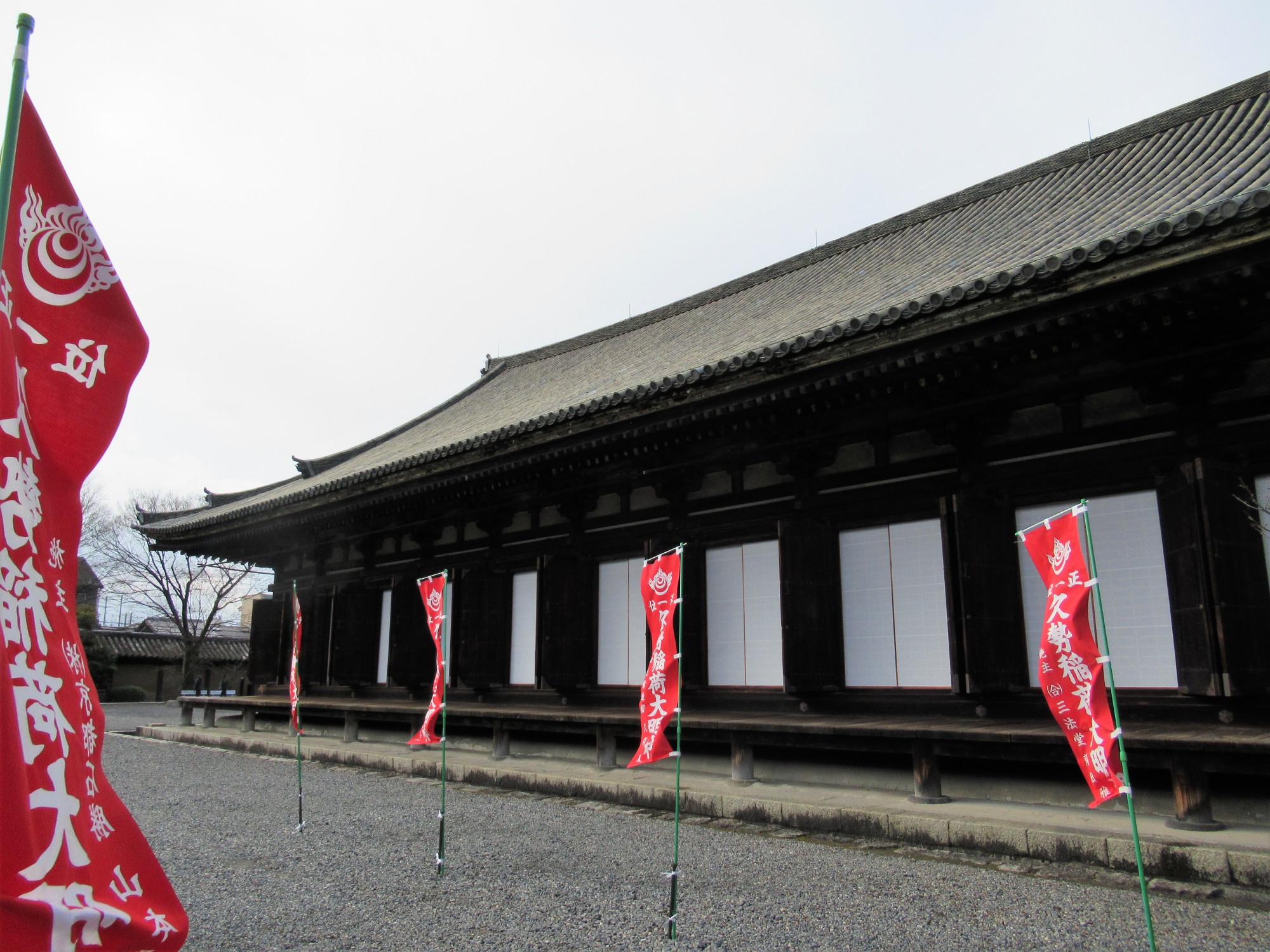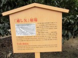 【江戸時代には各藩の弓術家により本堂西軒下(長さ約121m)で矢を射る「通し矢」の舞台となった。縁の北端に的を置き、縁の南端から軒天井に当たらぬよう矢を射抜くのである(右上浮世絵画像参照)。「通し矢」の名もこの「軒下を通す」ということからきている。強弓を強く射なければ到底軒下を射通すことができない。それゆえ弓術家の名誉となったのである。その伝統に因み、現在は「楊枝のお加持」大法要と同日(1月中旬)に、本堂西側の射程60mの特設射場で矢を射る「三十三間堂大的全国大会」が行われる。】だそうです。
