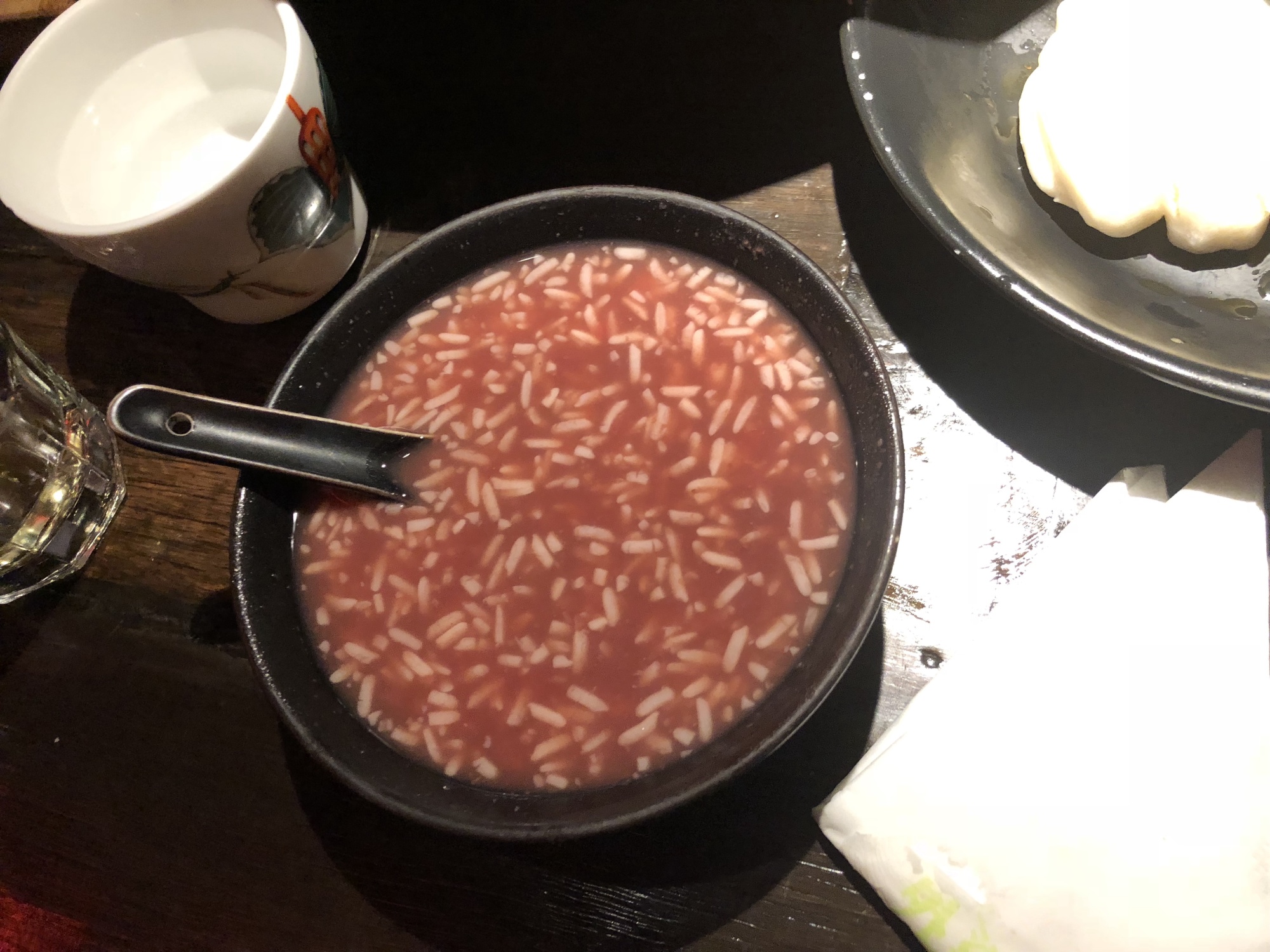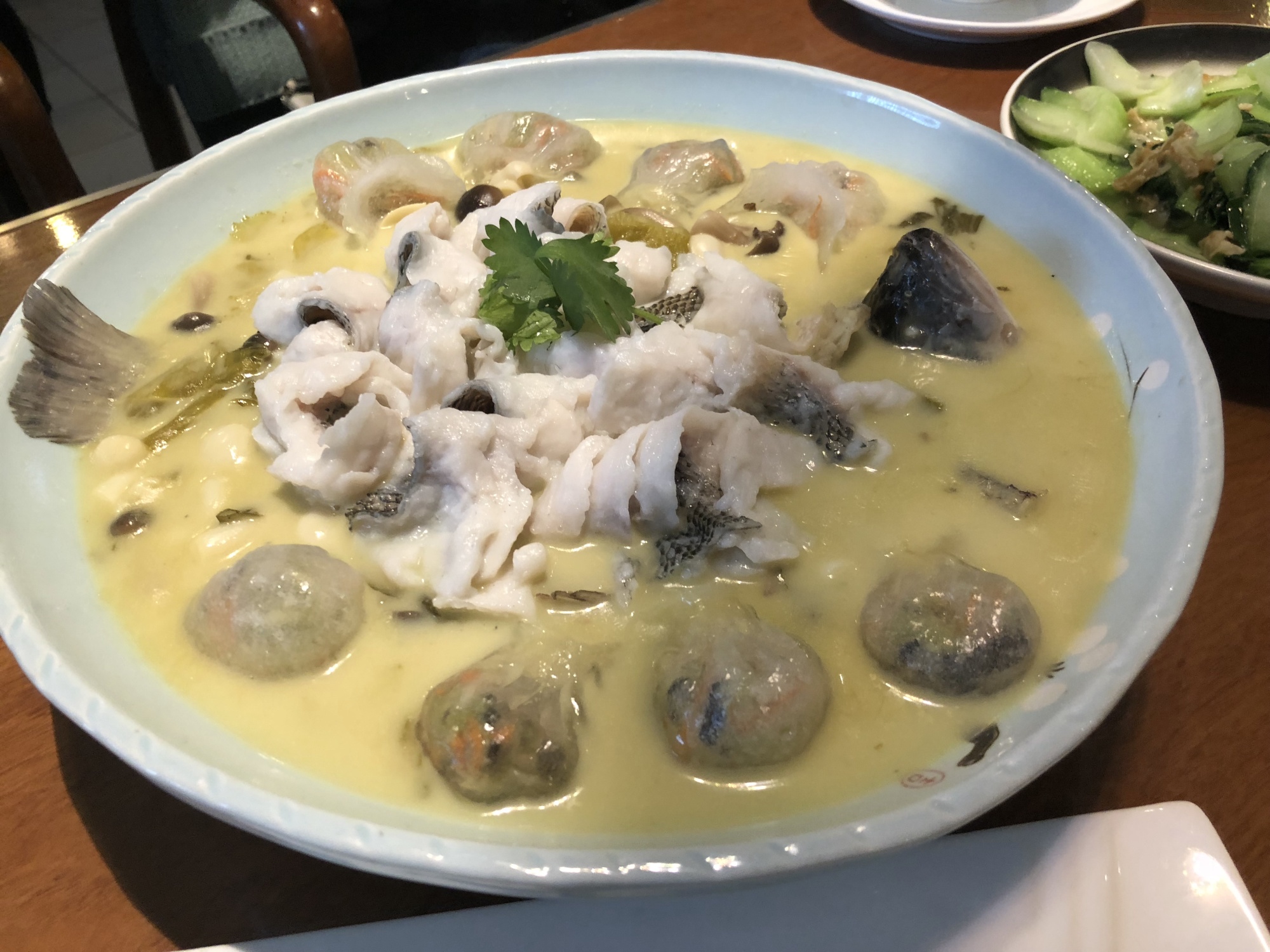 HOTでSPICYな魚料理は、パンに乗せて脂分をパンに沁み込ませて除いてから、食べます(パンは食べないようです)。お米のお粥のようなのは、結構、甘みもあって、美味!(ってか、全部、それほど辛くなく杭州料理はマイルドです)。