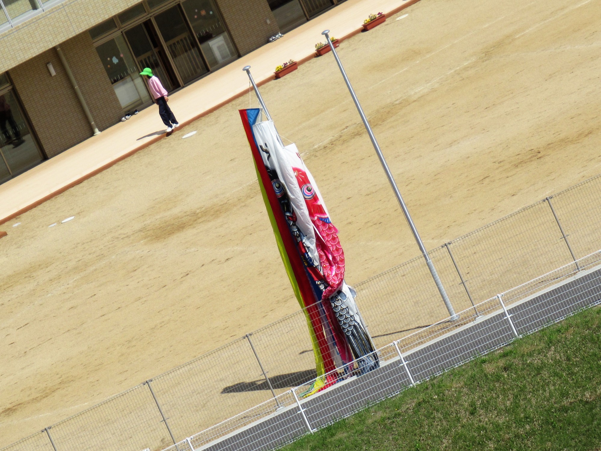 新設の「子ども園」では、こいのぼり(が、ちょっとポールとサイズが合ってない??)