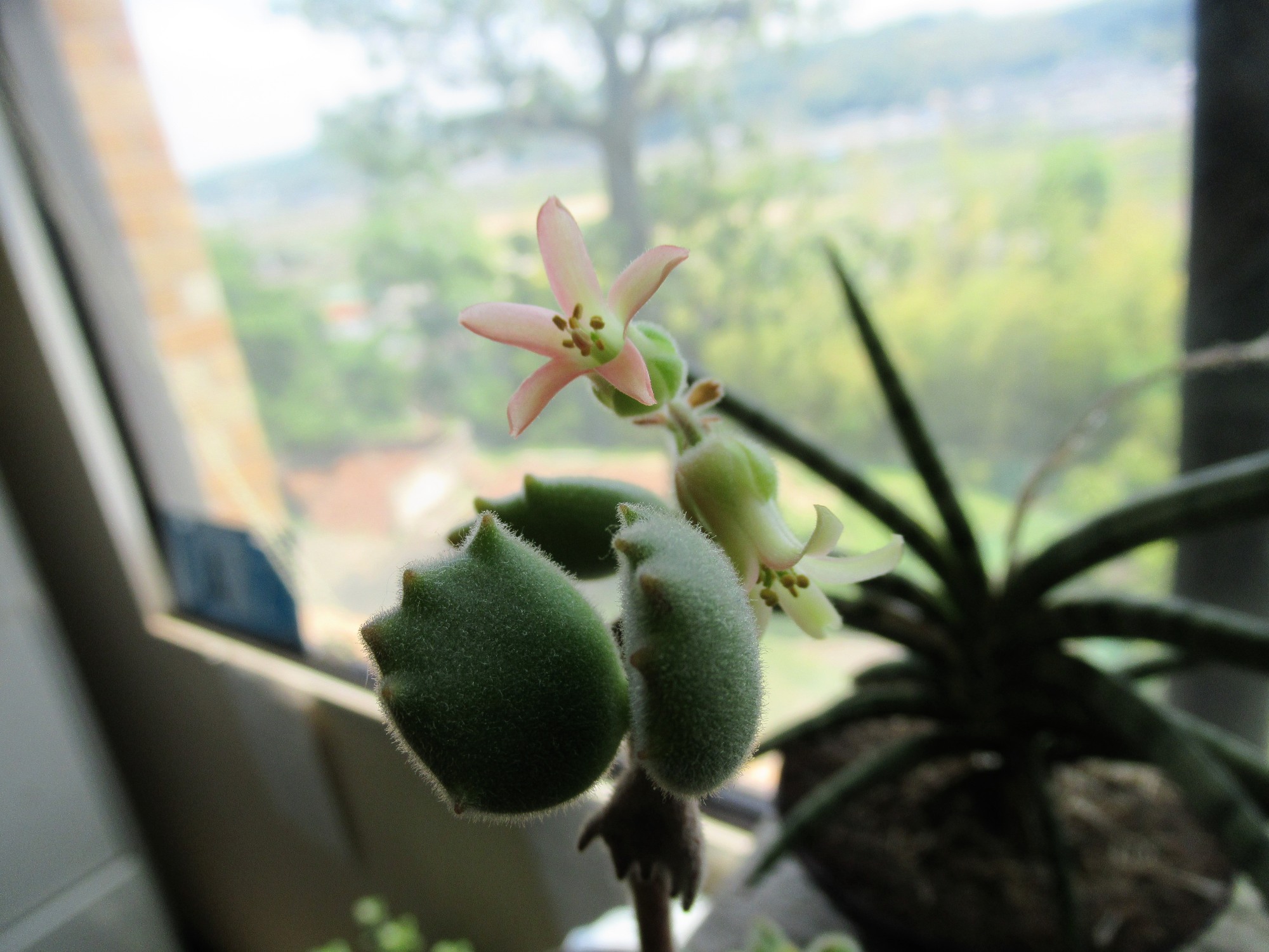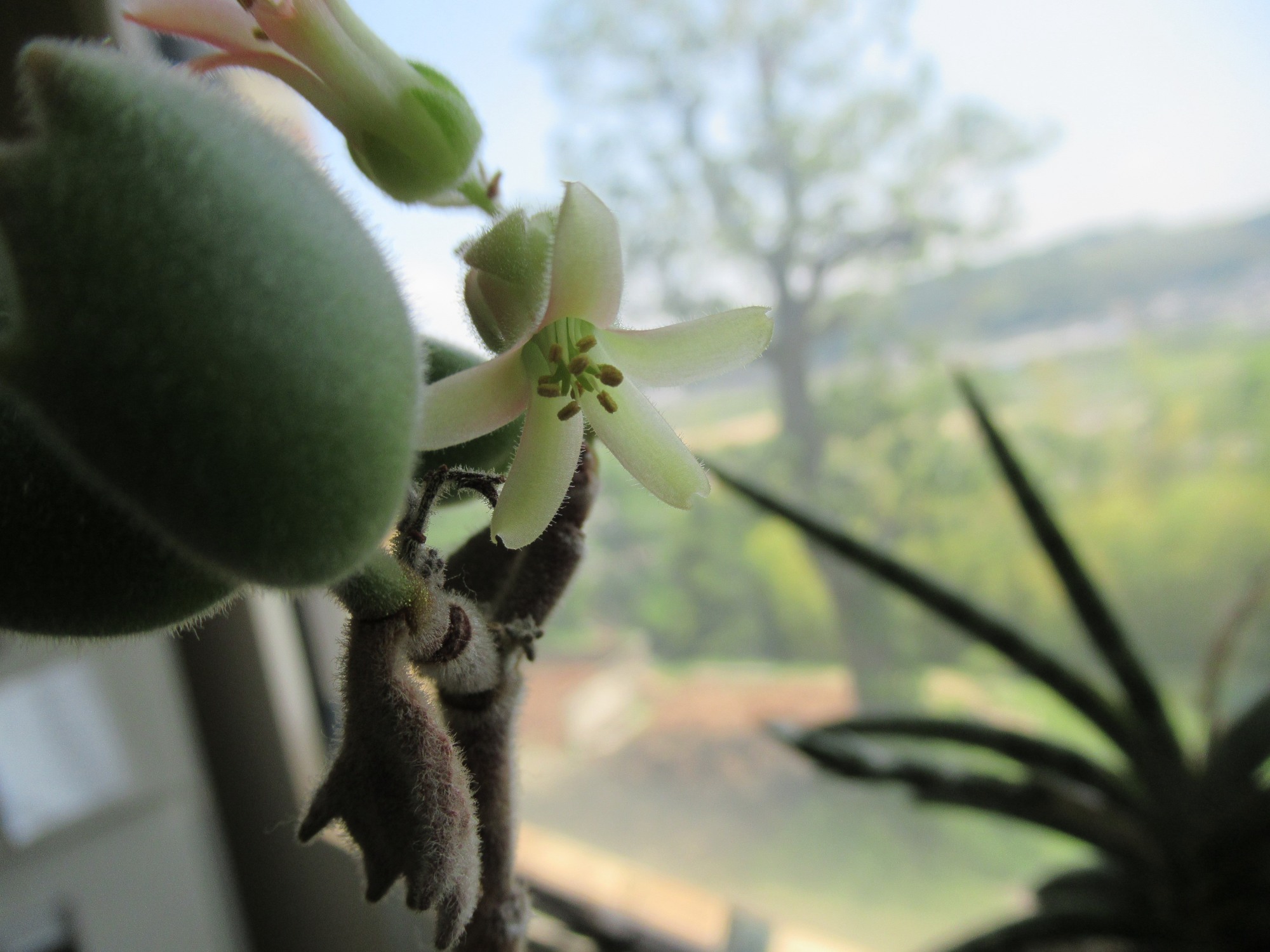 AMは居室で仕事中、ふとキャビネットの上を見ると~熊童子の花が、久しぶりに咲きました。