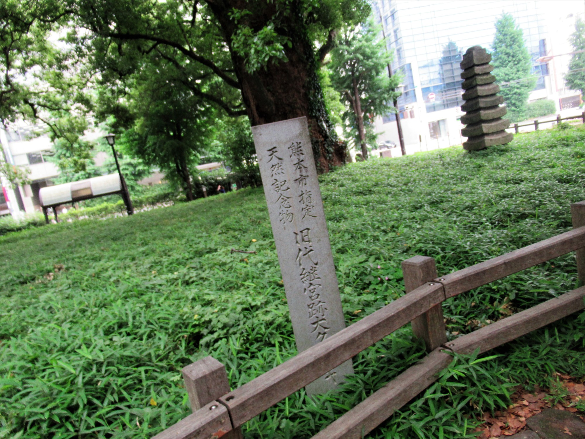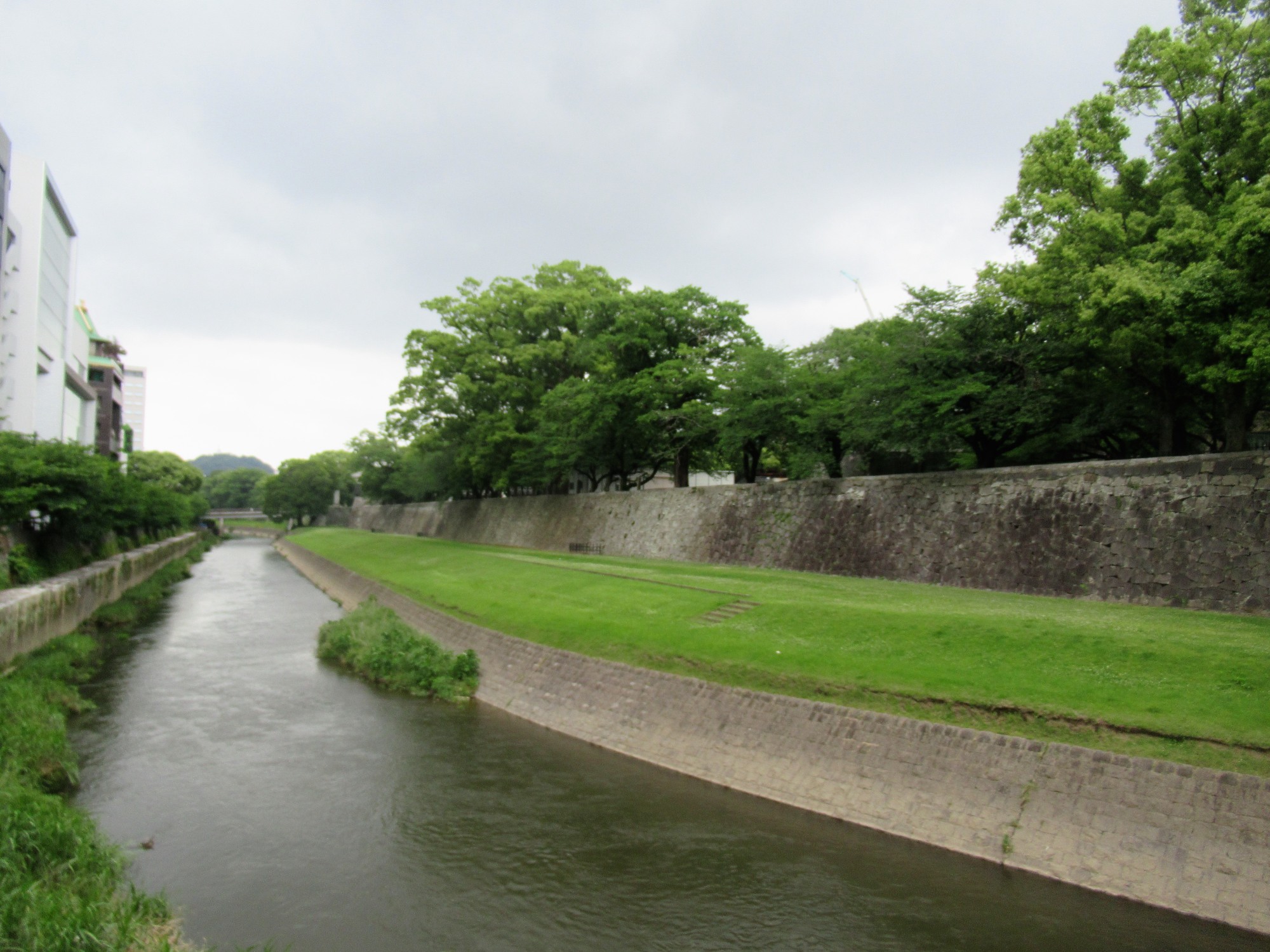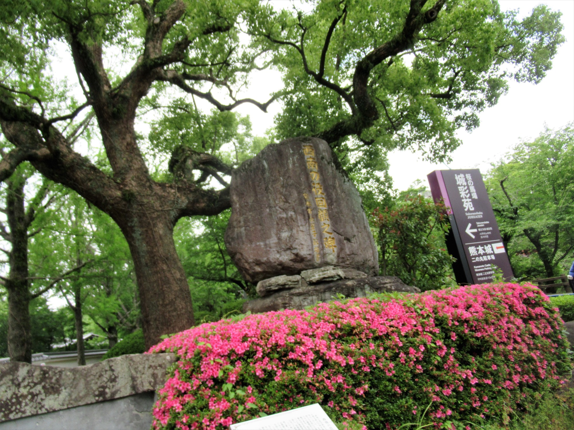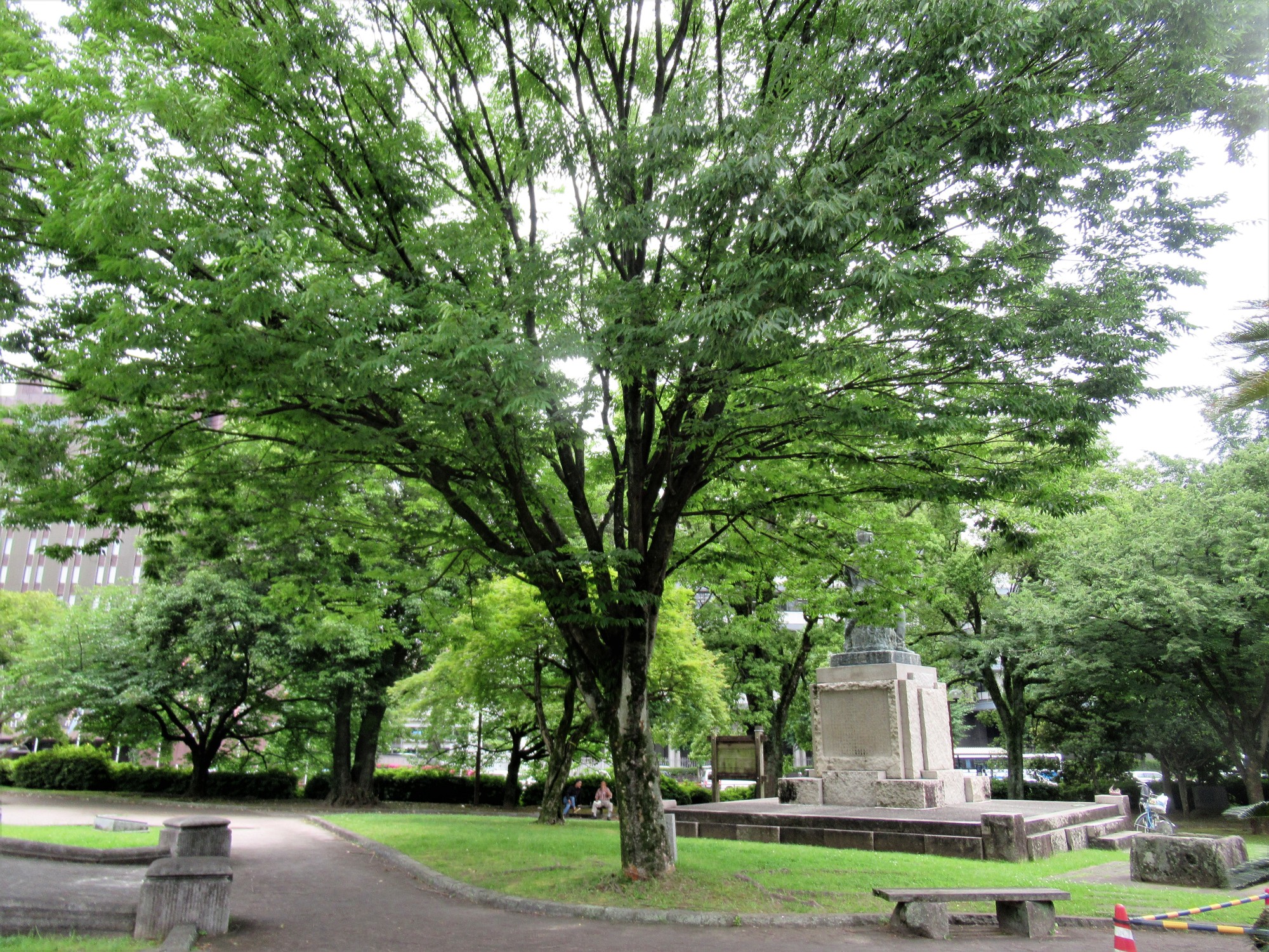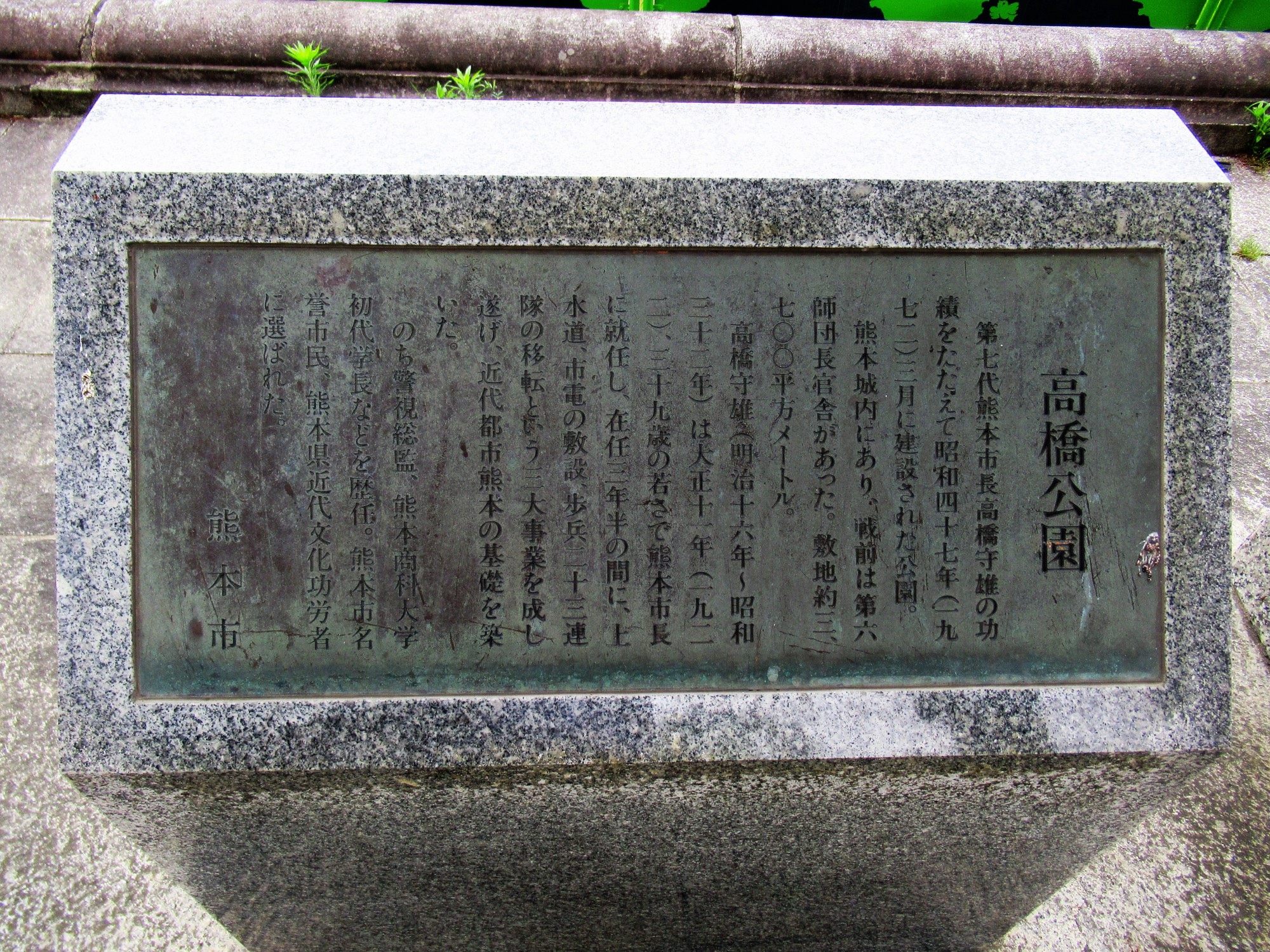 道路を挟んで向かい側には【熊本城を囲むように流れる坪井川沿い、千葉城橋と厩橋の間に位置する高橋公園は、戦前の第六師団長官舎跡地で、熊本市の第7代市長で市電の開通や水道の敷設など、熊本市発展の基礎をつくった高橋守雄を記念して造られた公園です】…が。