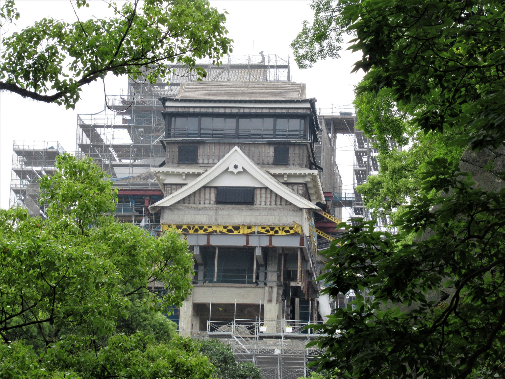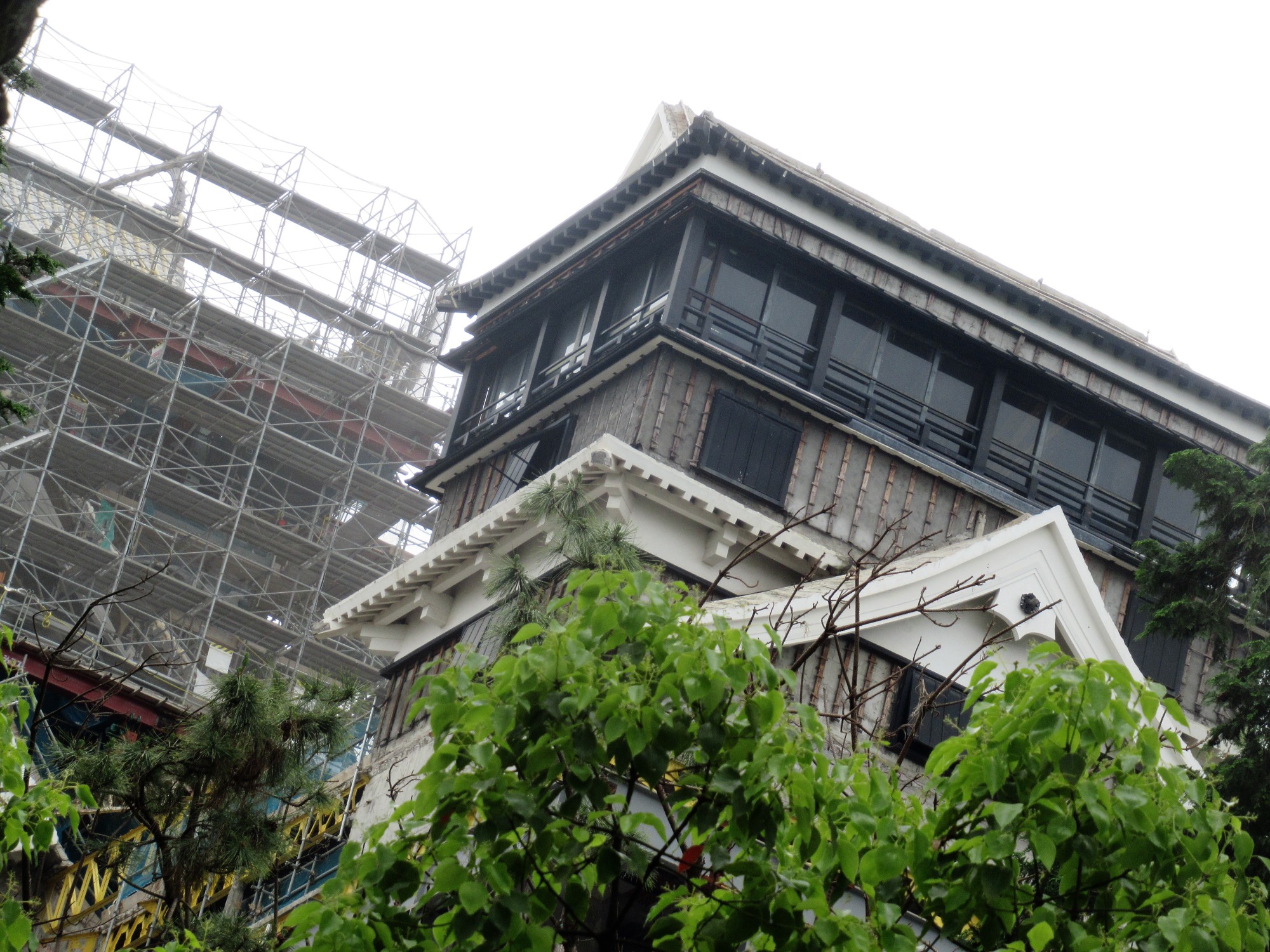 そこから加藤神社! ここは、大丈夫そうですが、境内からは、大小天守の工事の容子が良く見えます。