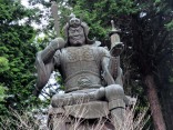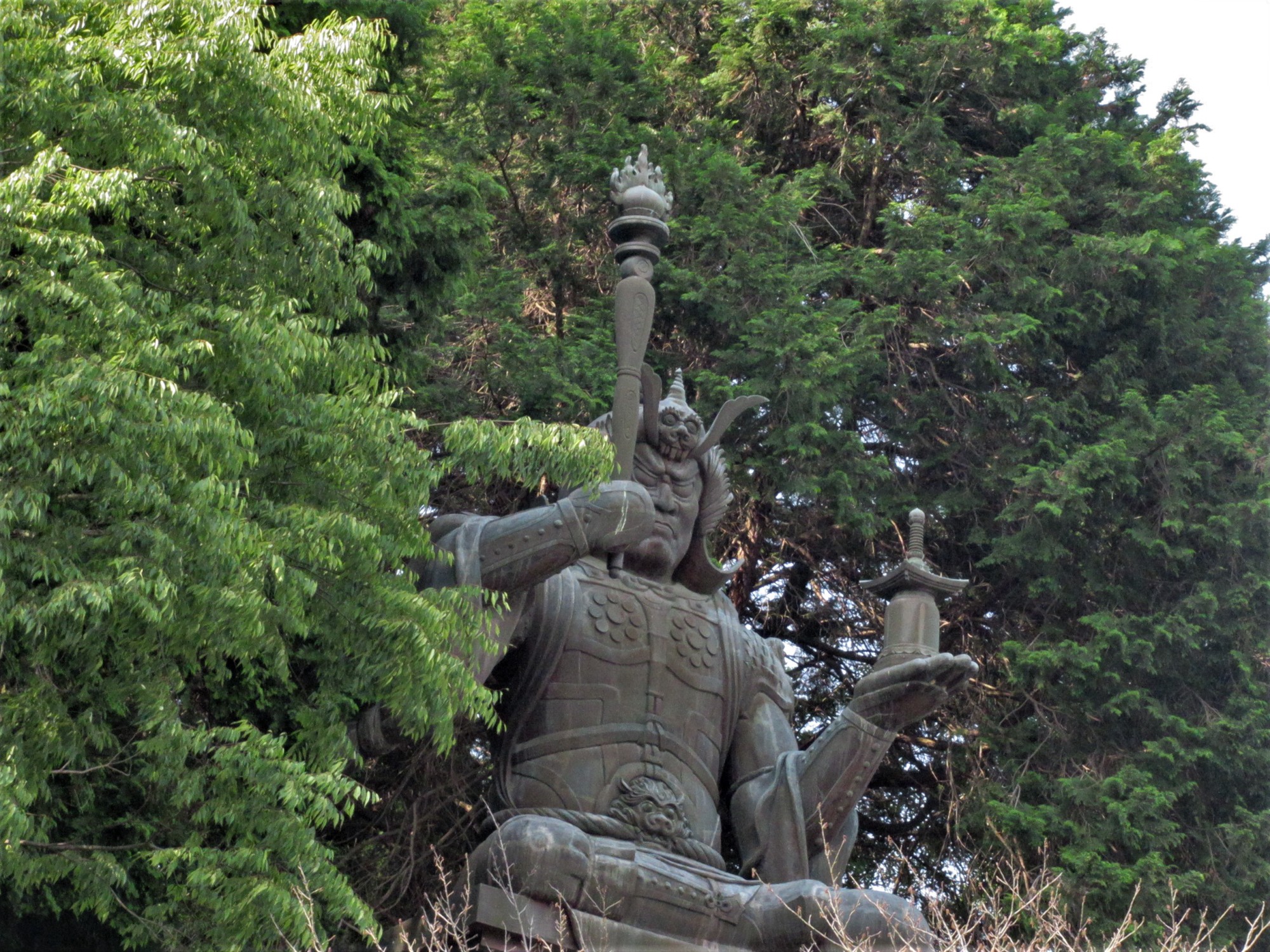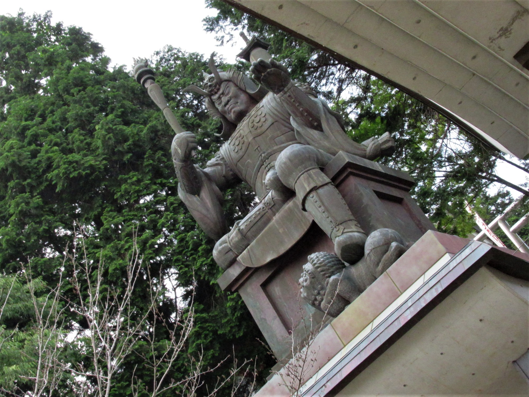 【巨大 毘沙門天は参道101の石段中程の楼門 (七福宝船門)上に乗っている。その下に船の大きな碇がある。また「怒り」鎮めることも兼ねている。毘沙門天王は左の手に