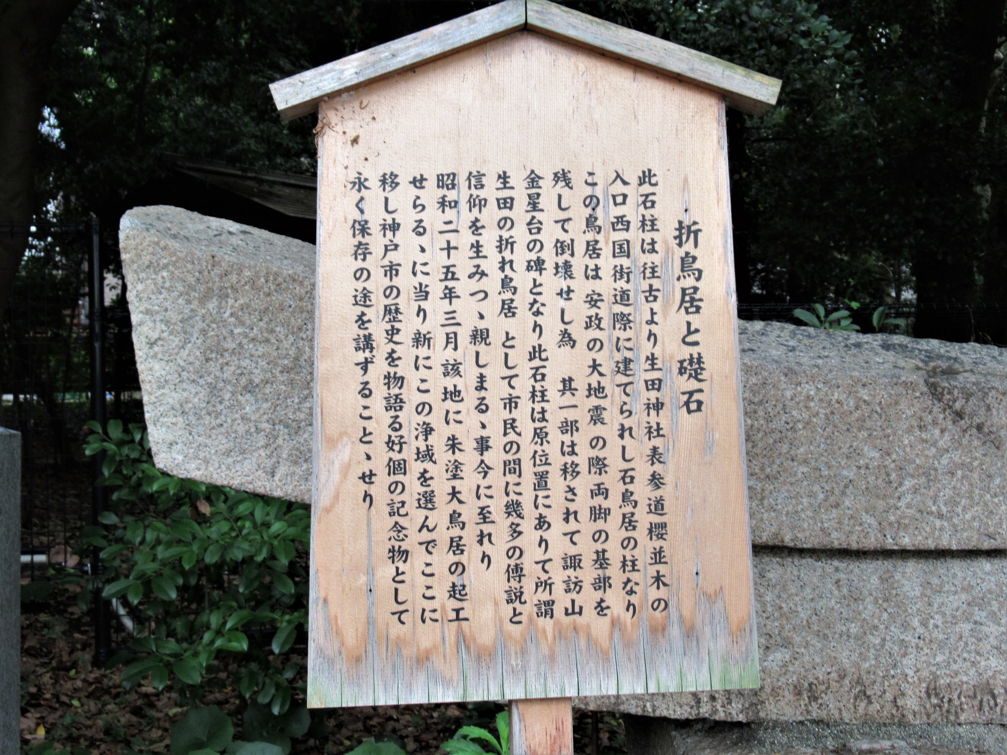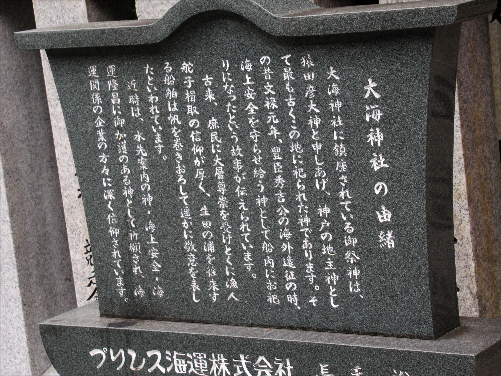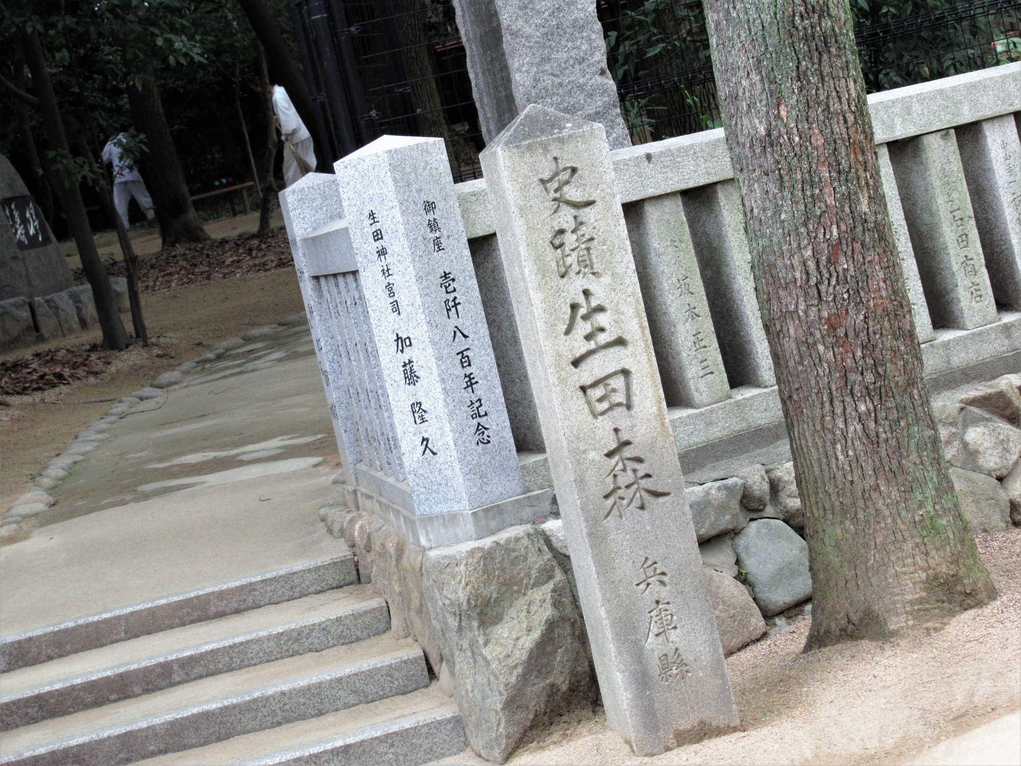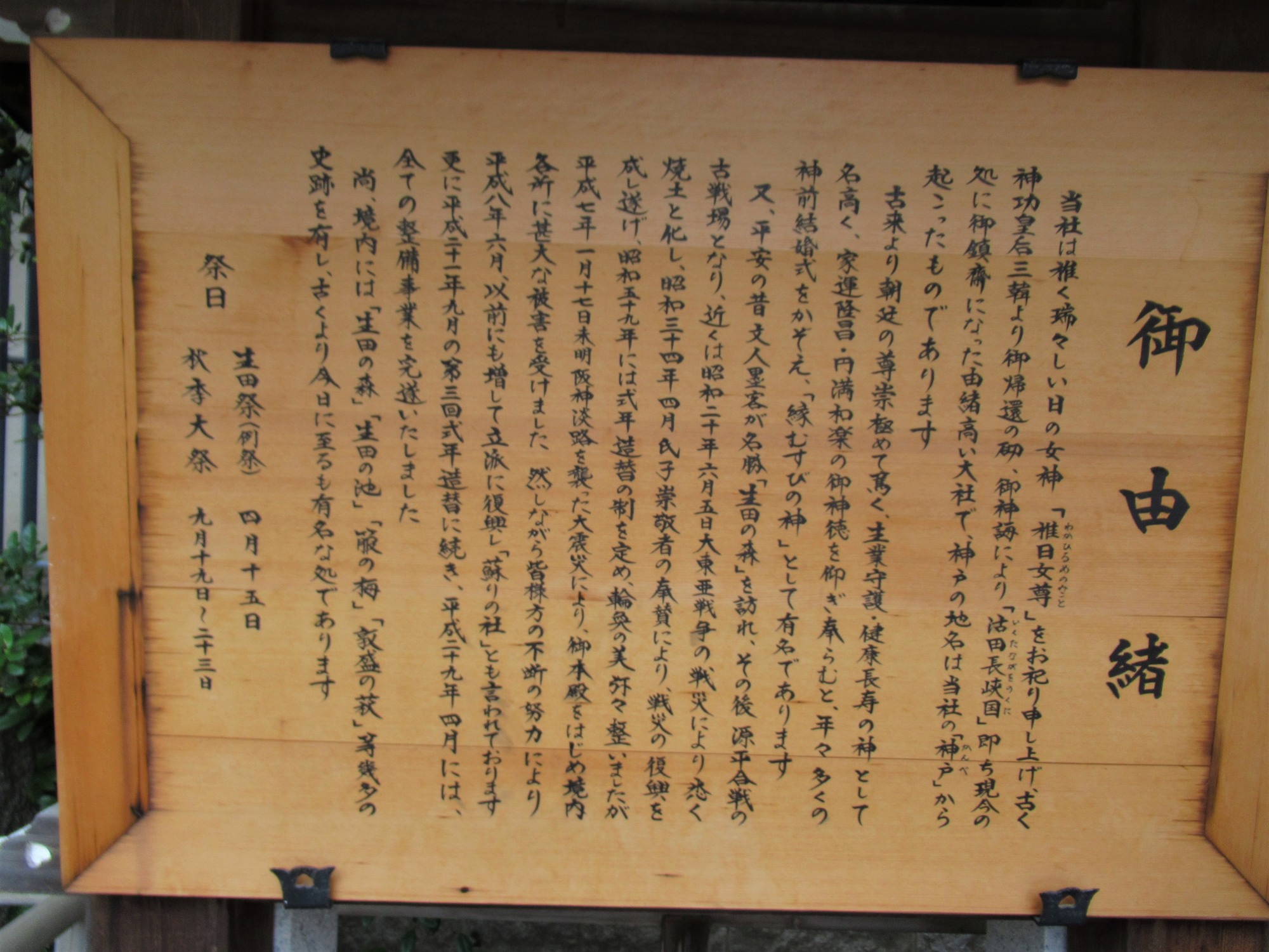 【同じ兵庫県内の廣田神社・長田神社とともに神功皇后以来の歴史を有する。かつて、現在の神戸市中央区の一帯が社領であり、これが「神戸」という地名の語源となる。地元では「生田さん」として親しまれている。】