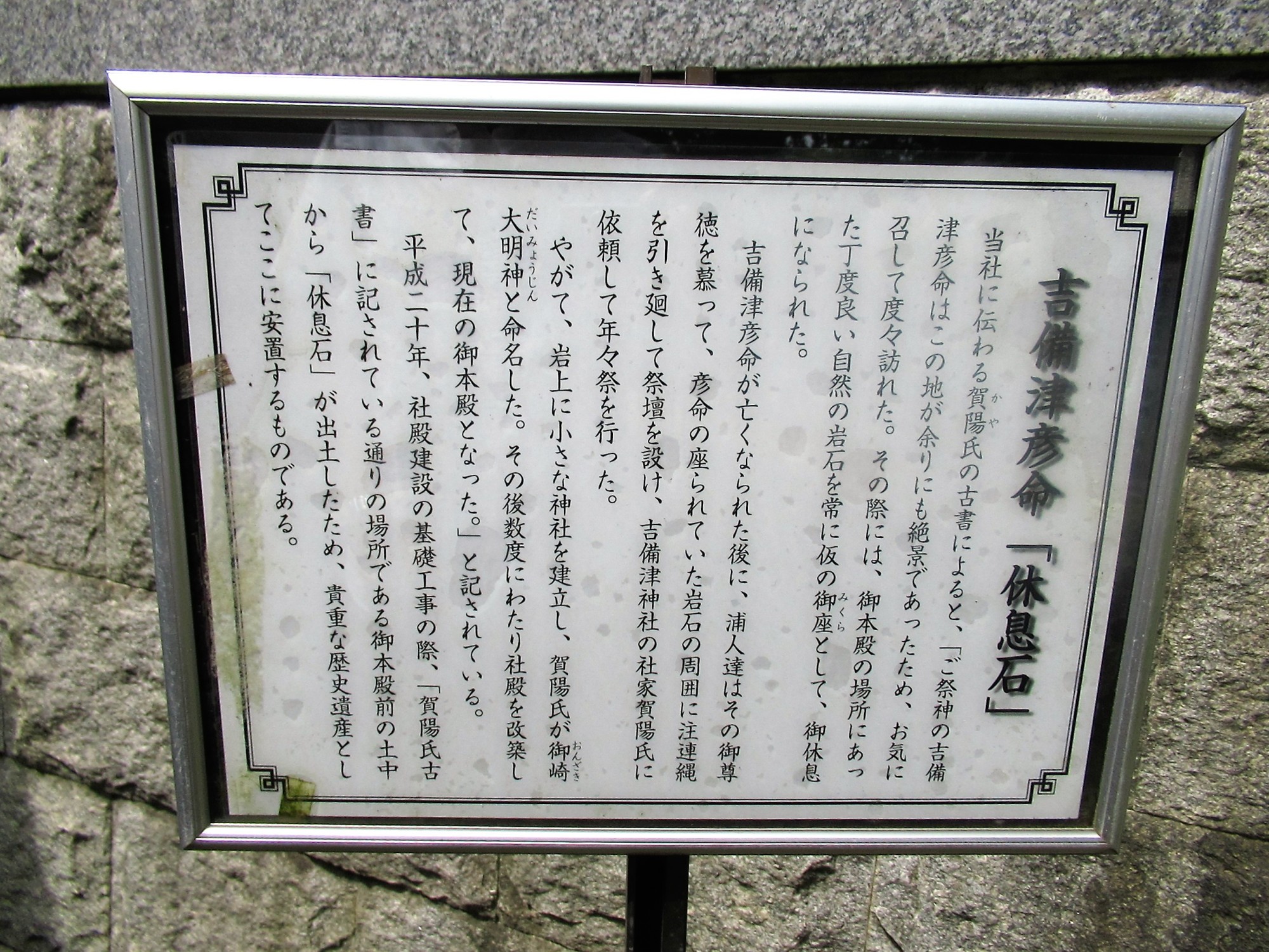 【御祭神の大吉備津彦命は、第7代孝霊天皇の皇子である。第10代崇神天皇の御代人々は神祇を敬って天下にようやく災害も無くなったが、遠国には未だ大和朝廷の命に従わないものが多くあった。そこで天皇即位の10年、天皇は皇族の中から4人の将軍を選んで北陸(大彦命 おおひこのみこと)・東海(武渟川別命 たけぬなかわわけのみこと)・西道(吉備津彦命 きびつひこのみこと)・丹波(丹波道主命 たにはのみちぬしのみこと)に派遣して天下を鎮定する事となった】だそうです。