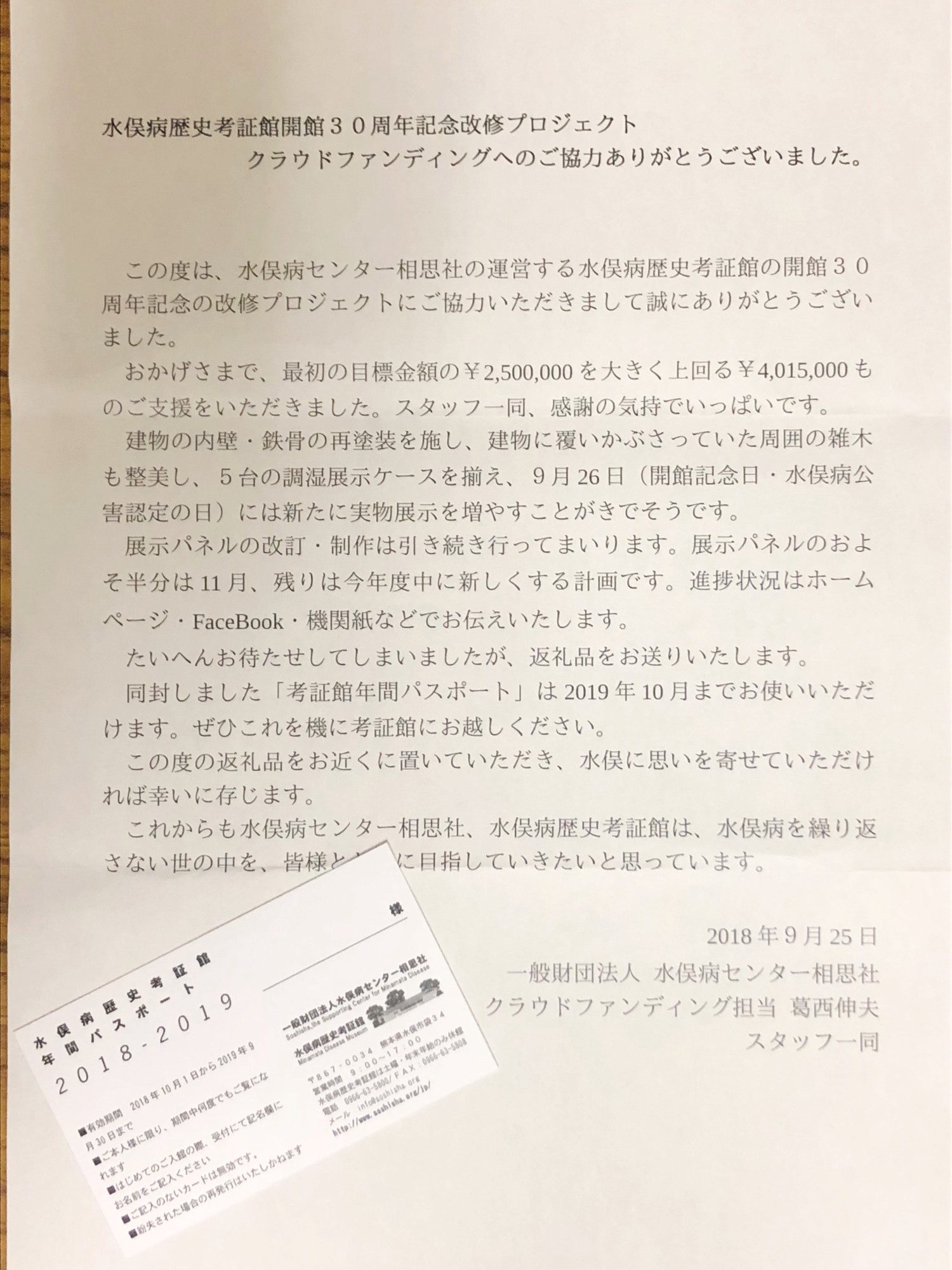 以前、水俣を訪れた時に、歴史考証館で、展示を観させてもらいました。そこの30周辺記念回収プロジェクトのクラウドファンディングを行ったら目標の250万円を大きく上回る401.5万円が集まったそうです。