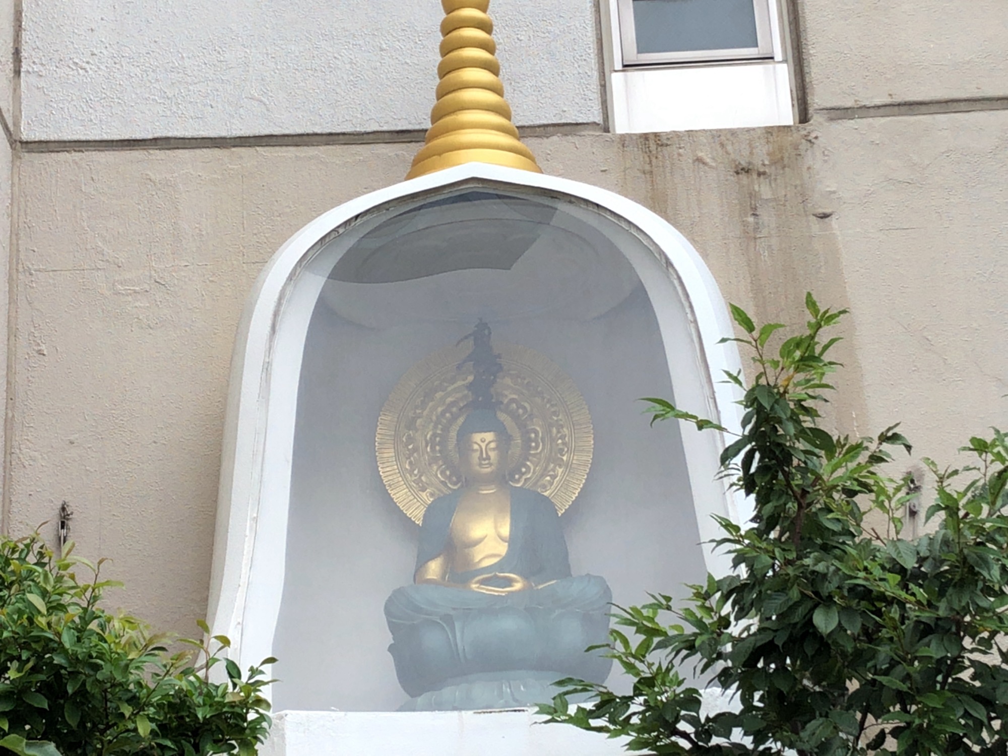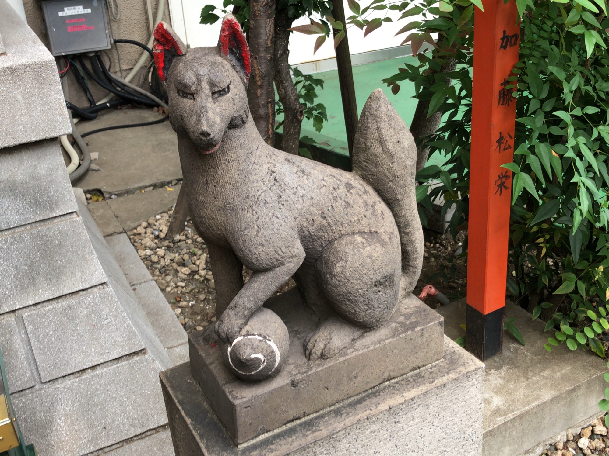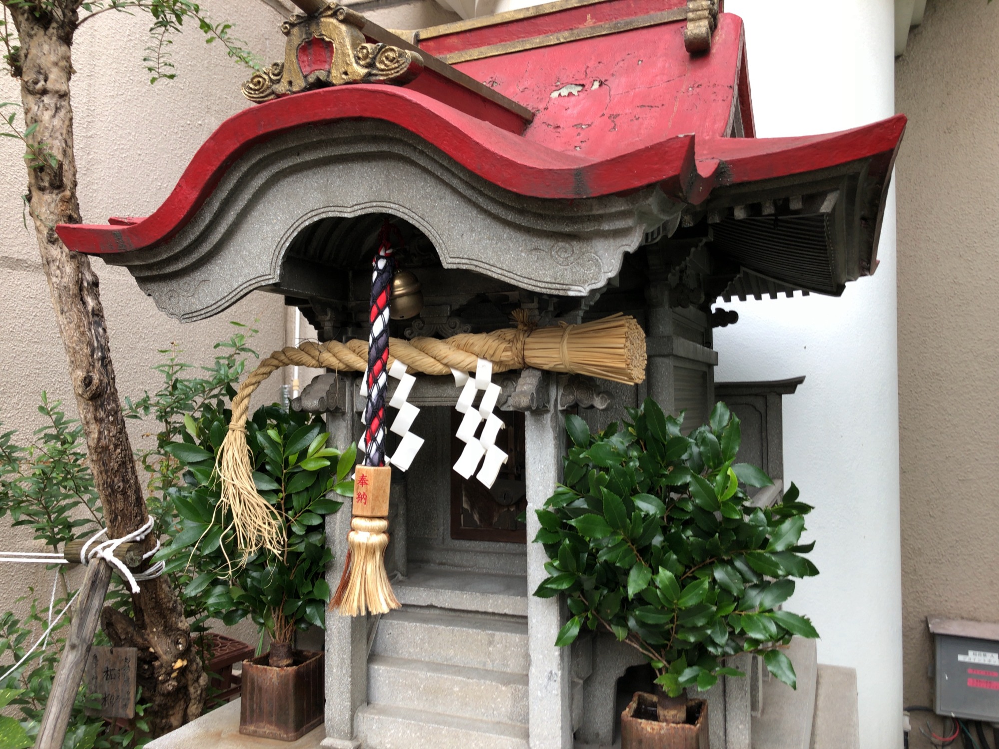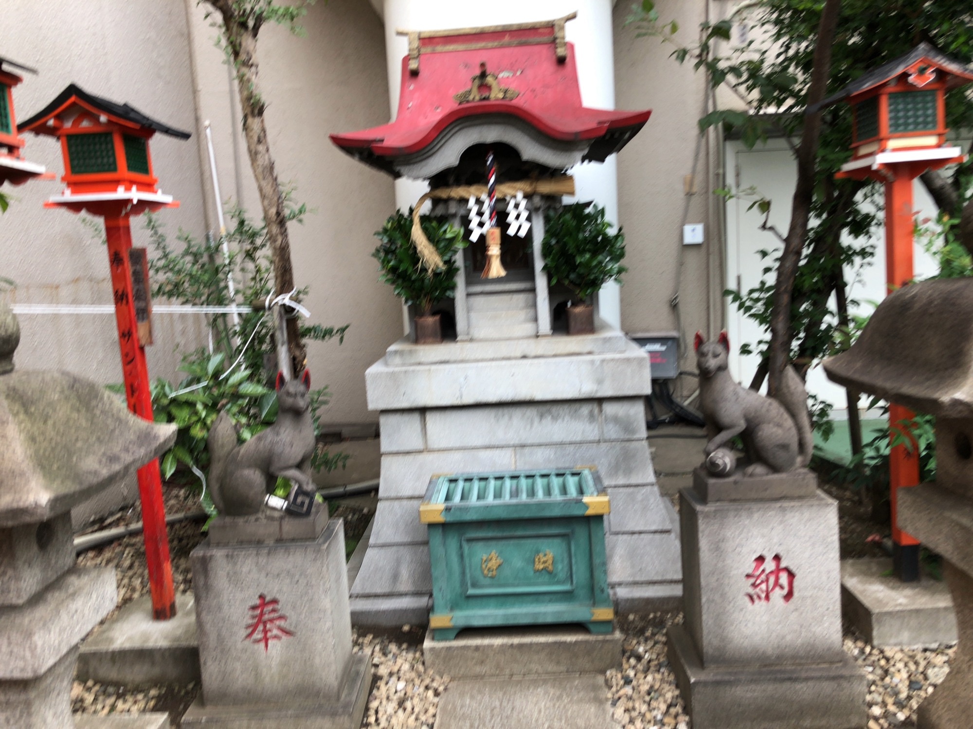 こんな情報があります【昭和7年(1932)、東京倉庫運輸株式会社がこの地に進出の時、既にこの敷地の道幅に一本に太い柘榴の木と共にささやかに祀られた祠があった。その建設者も名称も縁起も不明のまま、管理者も不在であったので改築荘厳してお供物、お賽銭は絶えなかった。昭和46年(1971)、竹芝端の拡張に伴い倉庫の改装を余儀なくされ、この稲荷の祠も改築遷座されることとなった。この機会にそれまでの因縁を考え「芝浦妙法稲荷」と名付け、広く地元の皆さんに開放、地域の仕合わせと発展をご守護願うことになる。たまたま芝浦3丁目にあった芝浦稲荷が廃社になっており、「石造りのお社とお狐2体、灯篭2基、手洗い1基、敷石等一式を差し上げます。」との話を伝え聞き、地元住民の因縁を生かし社屋を竹芝橋稲荷に移築合祀することとし、芝浦全地域の氏神として復活した。竹芝橋稲荷は法華経有縁の稲荷であり、姫稲荷である。昔からの御神木は柘榴の木である。仏の金言に曰く「神は正直を以て頭となし、法華経を以って食となす」と。柘榴の木は鬼子母神のご神木として知られ、鬼子母神は十羅刹女と共に法華経有縁の神々の内の女神の代表である。故にこの稲荷のご本体は正に女神であり、法華経守護請願の鬼子母神かその一類であり、「妙法稲荷」の名称を冠す神意と感得する。かつて繁栄を誇った木挽町妙法稲荷は既になく、そのご本体は鉄砲州稲荷に移管又芝浦妙法稲荷も戦後一信者の家庭稲荷と化し、妙法稲荷の命脈正に絶えなんとする時、偶然にもこの地芝浦にその継承と復興が実現、妙法稲荷の本山となる。昭和57年(1982)8月、ブロンズ製金色の釈尊座像を祀り、神仏混交を具体的に表現。これ法華経見宝塔視なの宝塔湧現であり、日蓮御聖人のお曼陀羅本尊の実現である。次いで昭和62年(1987)5月、ネパール国スアワンプ・ヤート寺(通称目玉寺)のギャン・カジ・シャモヤ上人より東京倉庫運輸株式会社社長池田新一に対し御仏舎利守護のご加命あり、奉戴を機会に御仏舎利を奉安する。】ということで祠の上に、御仏舎利として、釈迦牟尼仏眞眞舎利