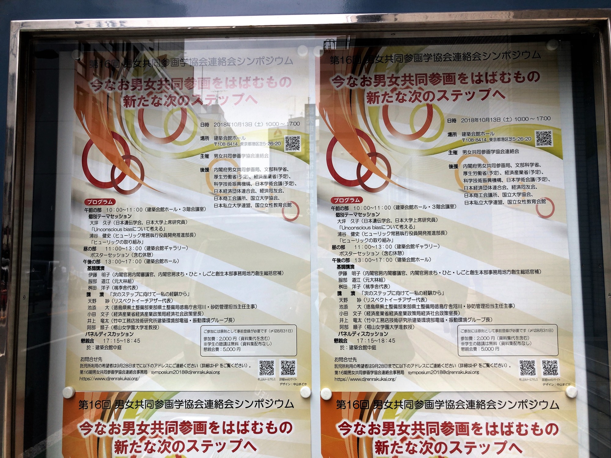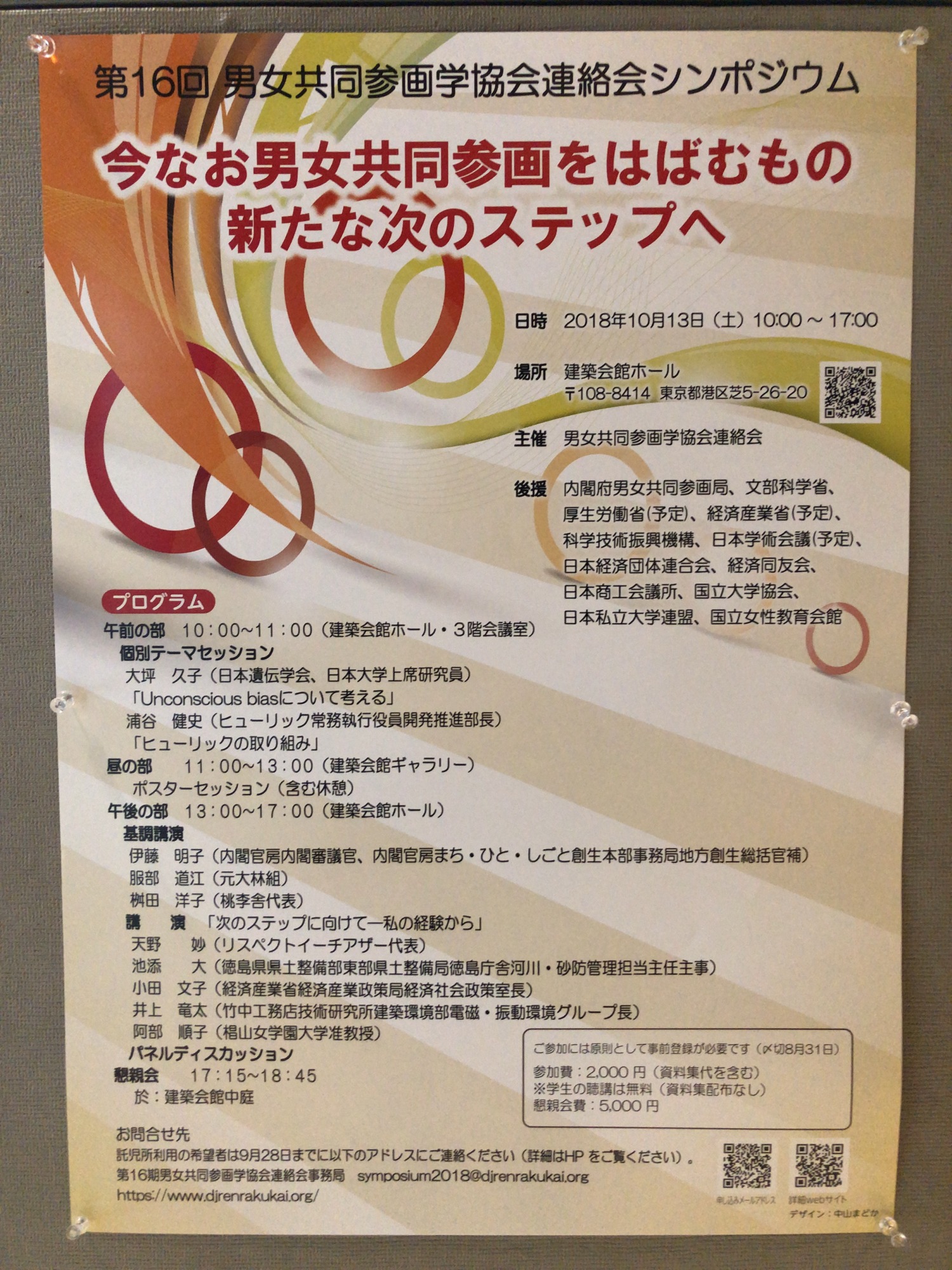 今日は、日本衛生学会も参加している男女共同参画学協会連絡会の第16回シンポジウムで、日本衛生学会として、理事の亀井先生と一緒に参加でした。