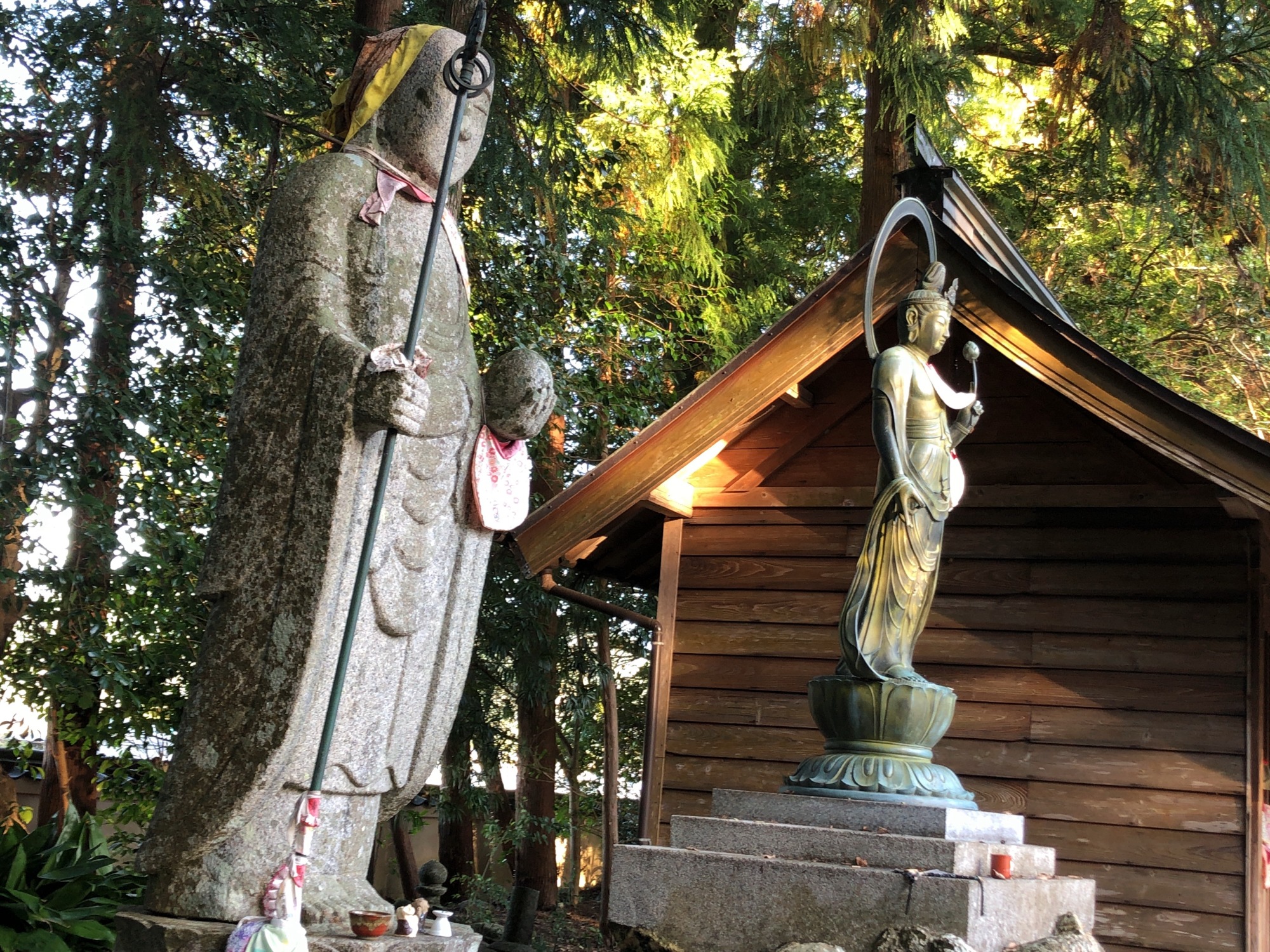 【山門をくぐって進んでいくと右側に手水場、鐘楼が、左手に開山堂がある。正面奥に本堂が建ち、その左に大師堂がある。この前に酒断地蔵がある。鐘楼の先を右に入ると中門があり、突き当りに光明殿、左に庫裏・納経所がある】