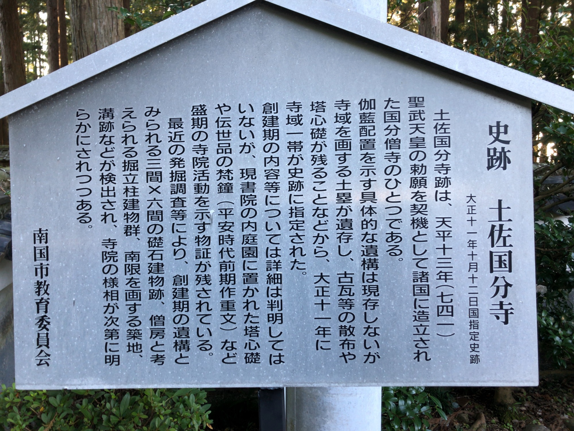 【土佐国分寺は高知県南国市にある真言宗智山派の寺院。摩尼山(まにざん)、宝蔵院(ほうぞういん)と号す。本尊は千手観世音菩薩。四国八十八箇所霊場二十九番札所。札所寺院としては単に国分寺と称するのが通例である。国の史跡に指定されている。】