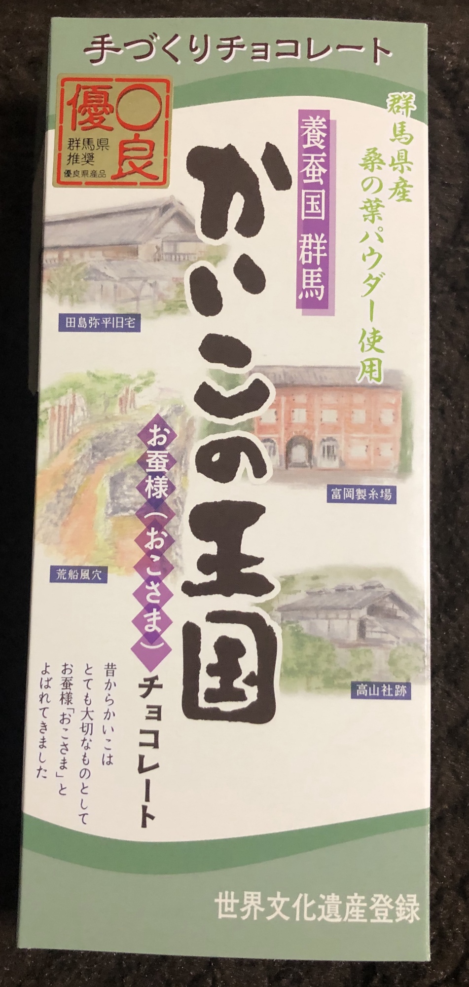 前橋土産て「手づくりチョコレート」かいこの王国〜世界文化遺産登録記念。群馬県推奨‼️ 群馬県産桑の葉パウダー使用。普通に美味しいチョコでした‼️‼️