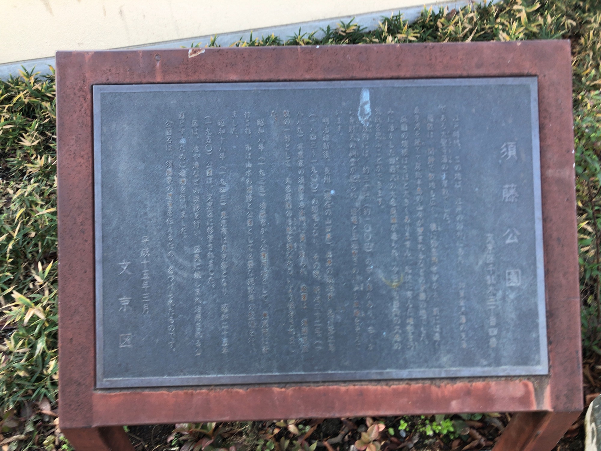 【須藤公園は、江戸時代の加賀藩の支藩の大聖寺藩(十万石)の屋敷跡。その後、長州出身の政治家品川弥二郎の邸宅となり、明治22年(1889年)に実業家須藤吉左衛門が買い取りました。昭和8年(1933年)に須藤家が公園用地として東京市に寄付、昭和25年(1950年)に文京区に移管されました。】
