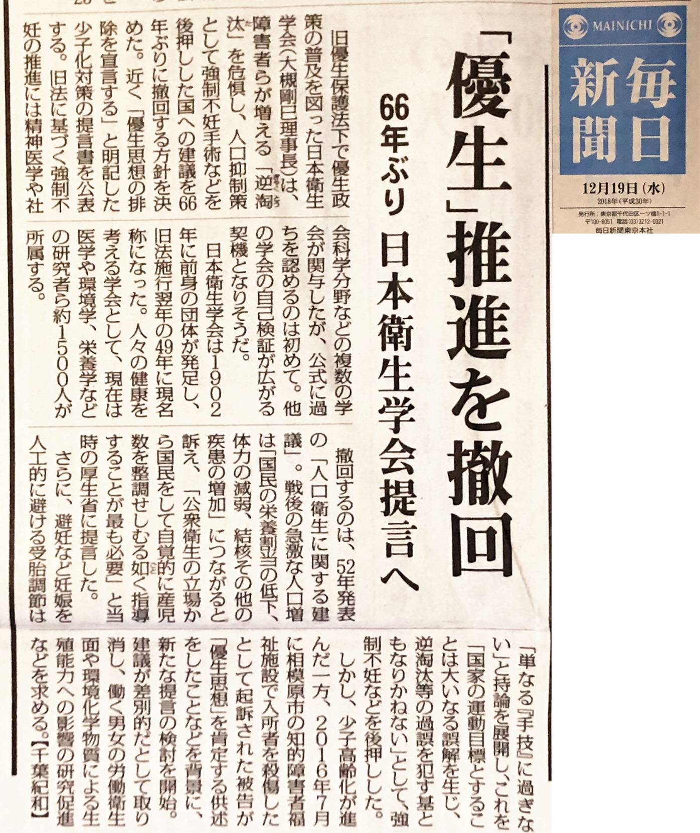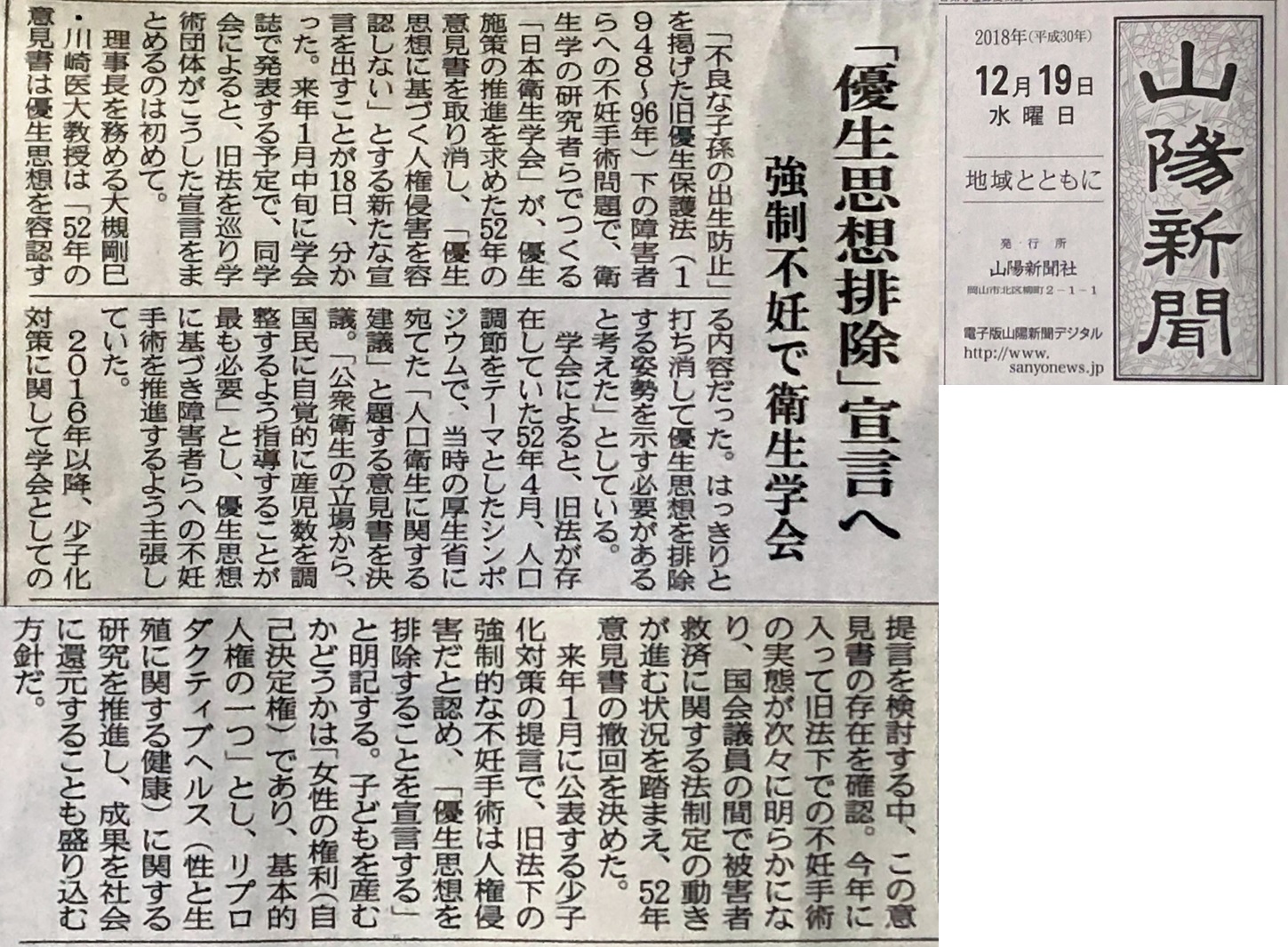 | 日本衛生学会 会員の皆様へ 理事長の大槻です。ご存知かも知れませんが、毎日新聞(およびそのWEB版)、その他ひょっとするといくつかの新聞(共同通信社からの記事配信によるその掲載)で、『日本衛生学会、66年ぶり「優生政策推進」撤回へ』等の記事をご覧になったかも知れません。 2016年から少子化対策提言を進めていく中で、日本衛生学会が1952年に学術総会の「人口調節シンポジウム」での決議で、当時の厚生省に建議として表明したと(五十周年記念誌に掲載されています)する内容について、前理事長・小泉先生の時期から、少子化対策提言の中で、この建議を否定しないとならないということが提案され、来年早々にJ-STAGEで報告される提言の中に、この否定が記されており、「優生思想を排除する」という文章になっています。 学会のこういった姿勢には、いくつかのメディアが興味を持たれていて、いくつかの流れで、我々の姿勢を明示することの意義があるであろうこと、また提言自体(これは少子化対策提言ですが)も受理されてJ-STAGE掲載が確実になったことにより、毎日新聞社および共同通信社の記者からの取材を、大槻が受けて、今回の記事になりました。 ちなみに毎日新聞は『旧優生保護法を問う』取材班が、今年の新聞協会賞の編集部門、受賞3つのうちの一つともなっています。 こういった背景があっての、報道になったことを会員の方々に説明するということで、本メールでお知らせしておきます。 一般社団法人日本衛生学会 理事長 大槻 剛巳 毎日新聞さんは1面でした。 その他共同さんの配信は、わかっているだけで、岩手日報、東奥日報(青森)、信濃毎日新聞(長野)、京都新聞、神戸新聞、中国新聞(広島)、愛媛新聞、長崎新聞、琉球新報が取り上げて下さいました。 |