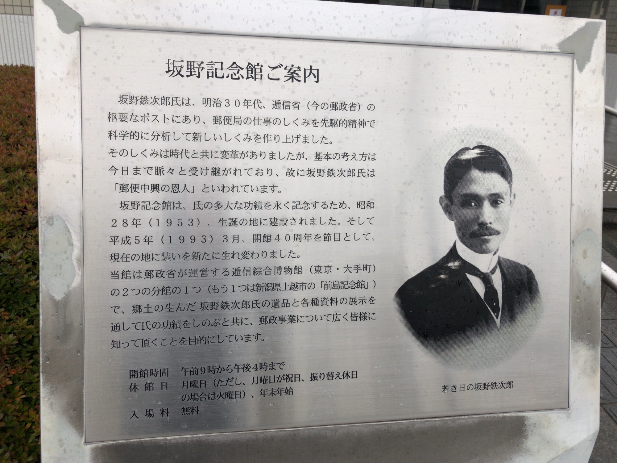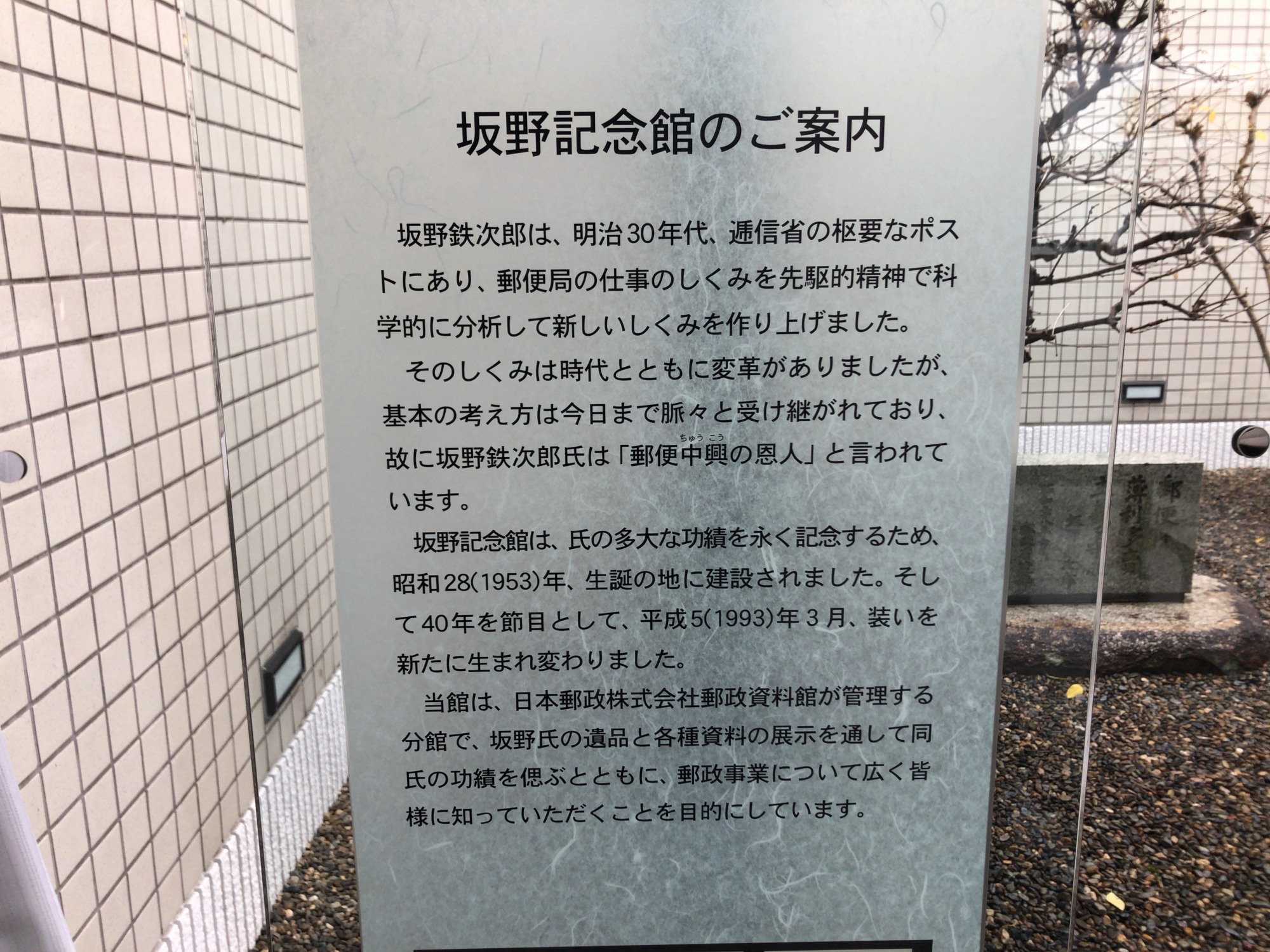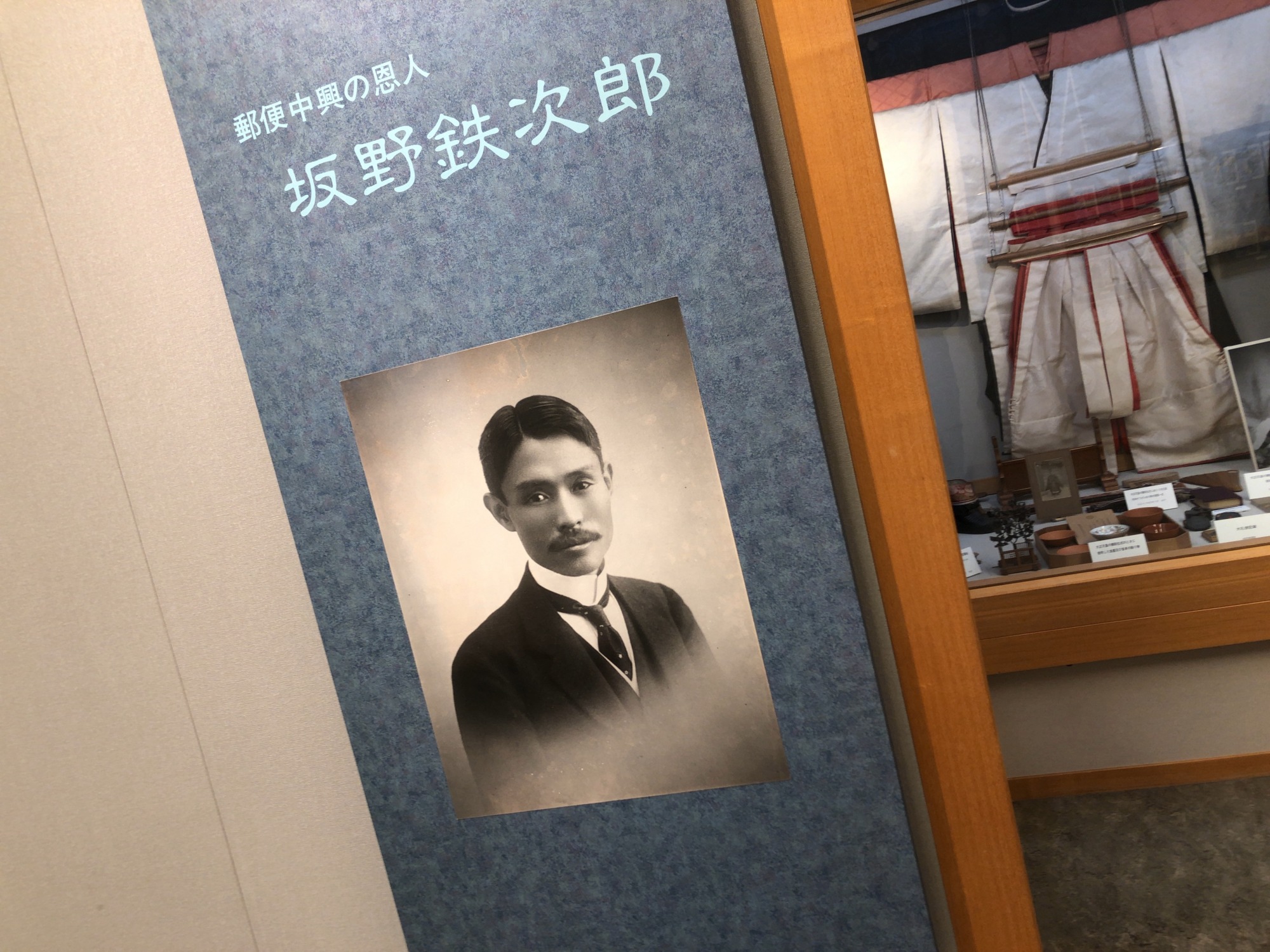 【郵便中興の恩人と言われる坂野鉄次郎の業績を紹介しています。郵便関係の法令改正や制定を成し遂げただけではなく、電気事業や鉄道事業でも活躍したほか、公私にわたり郷土の発展のため力を尽くしてきた業績を紹介しています。】だそうです。