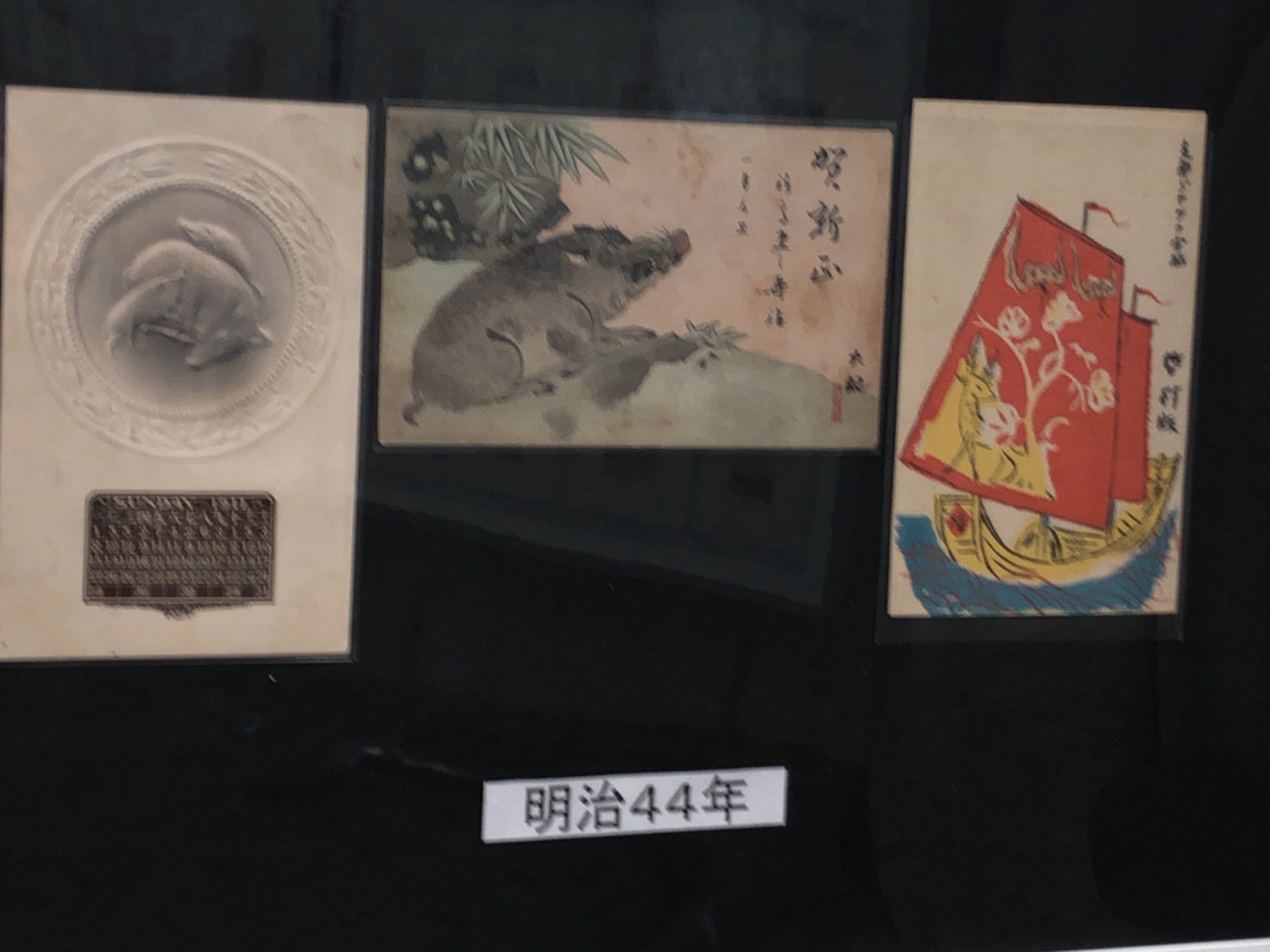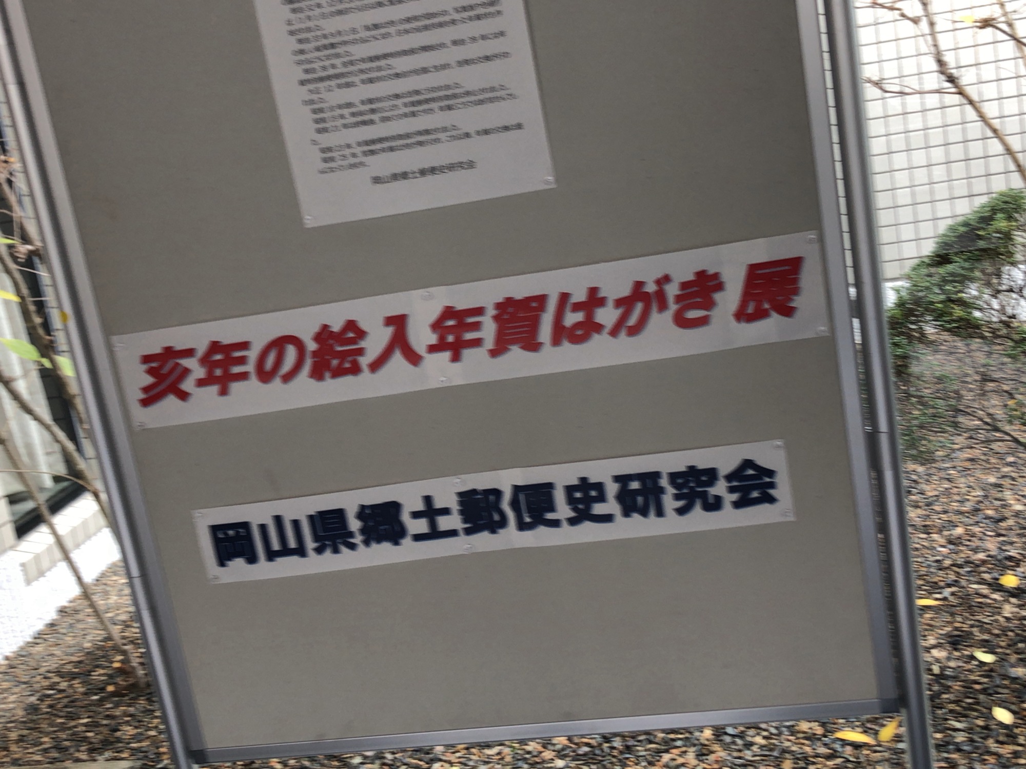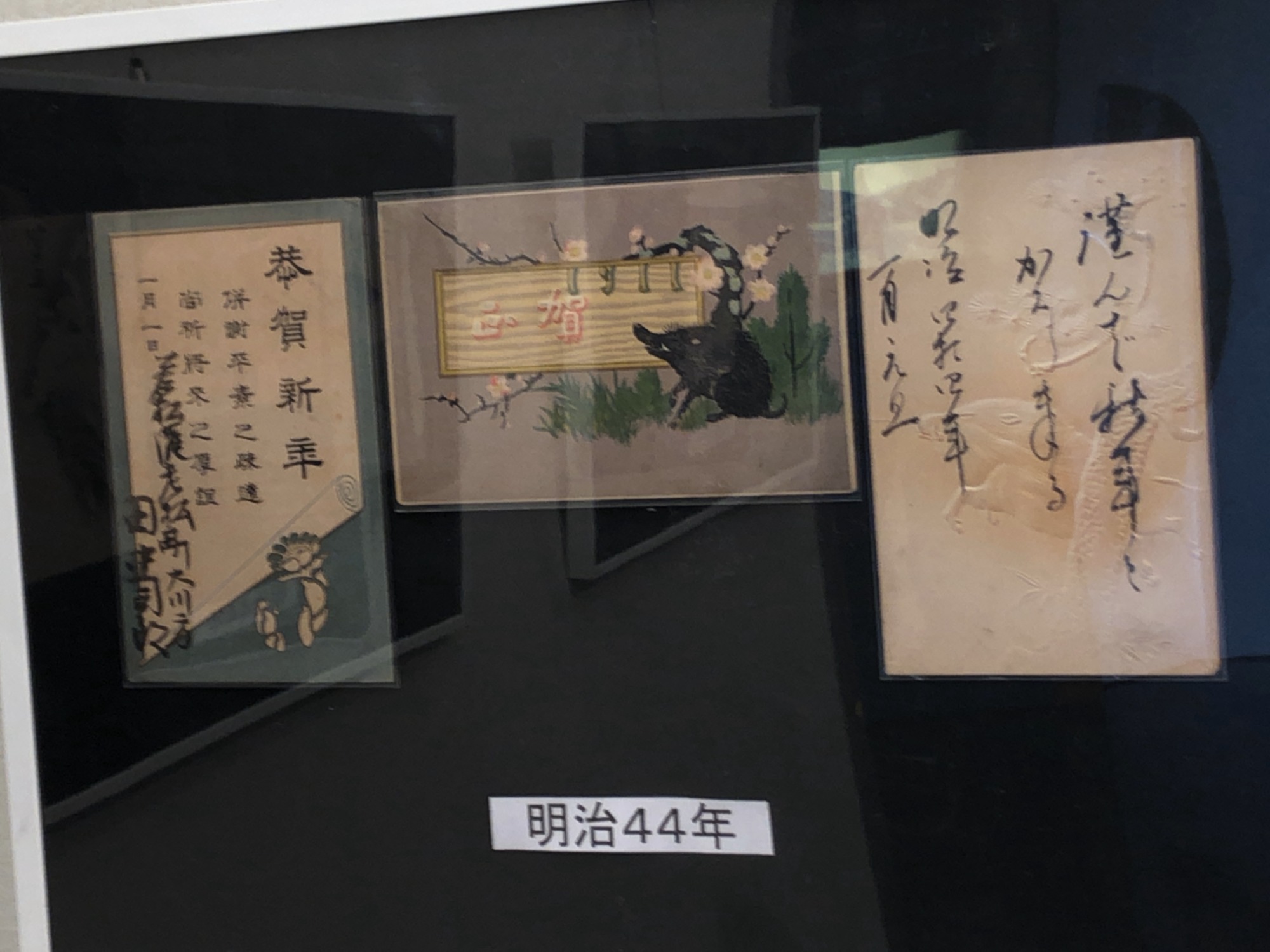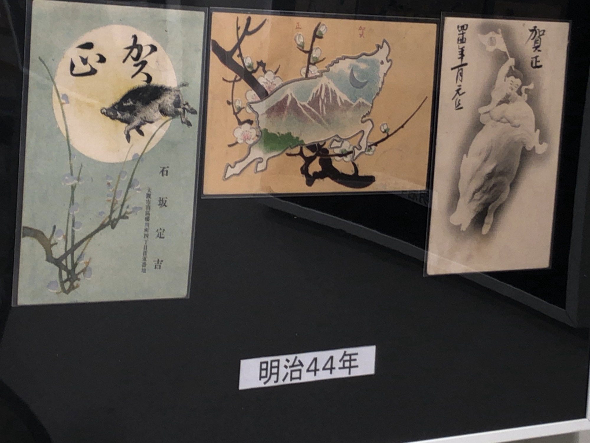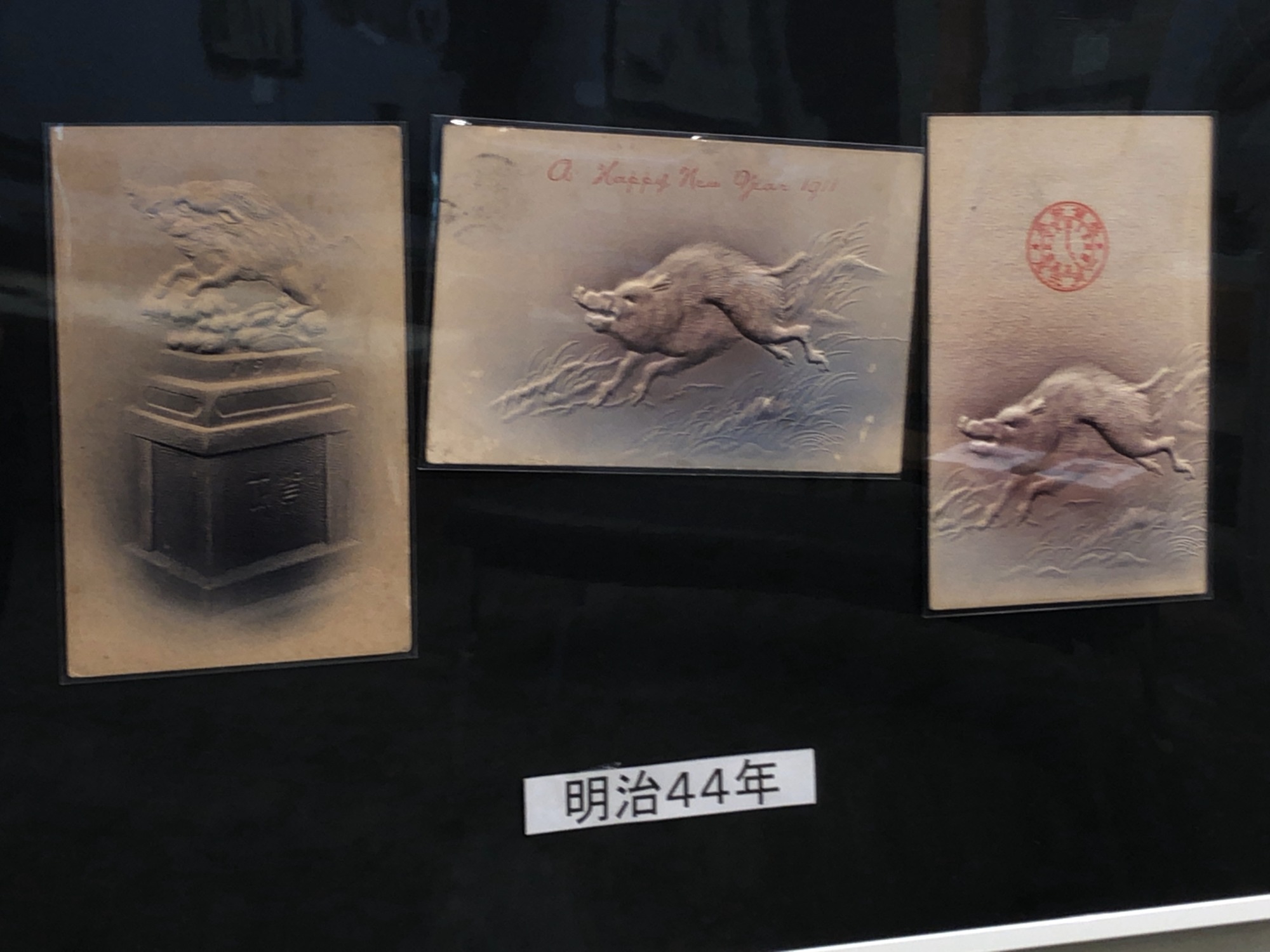 岡山郷土郵便史研究会さんってのが、あるそうで、その展示ではイノシシ入り賀状の展示でした。