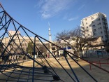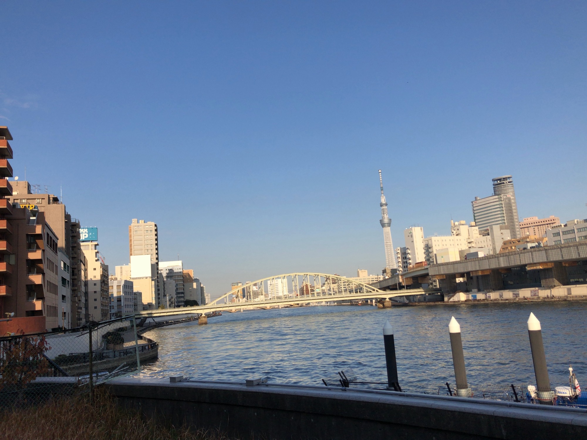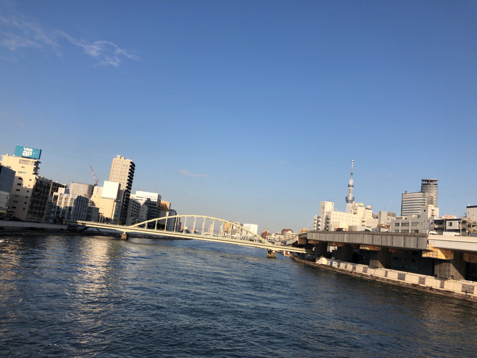 両国橋で、墨田川を越えます・・・スカイツリー!