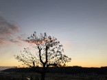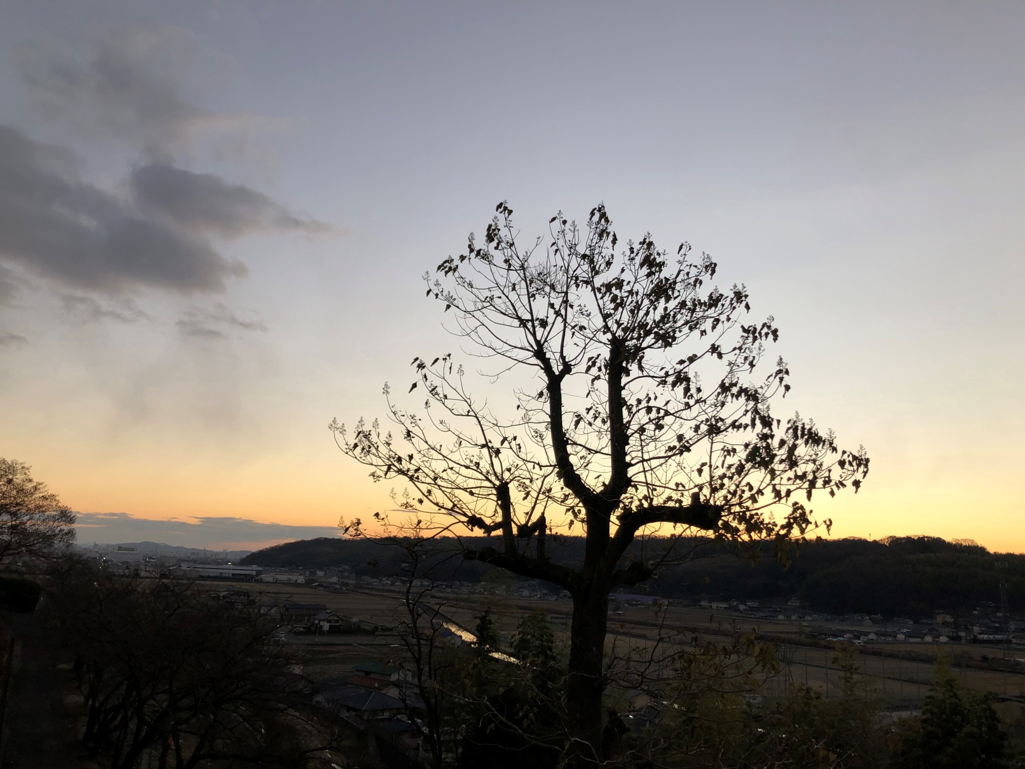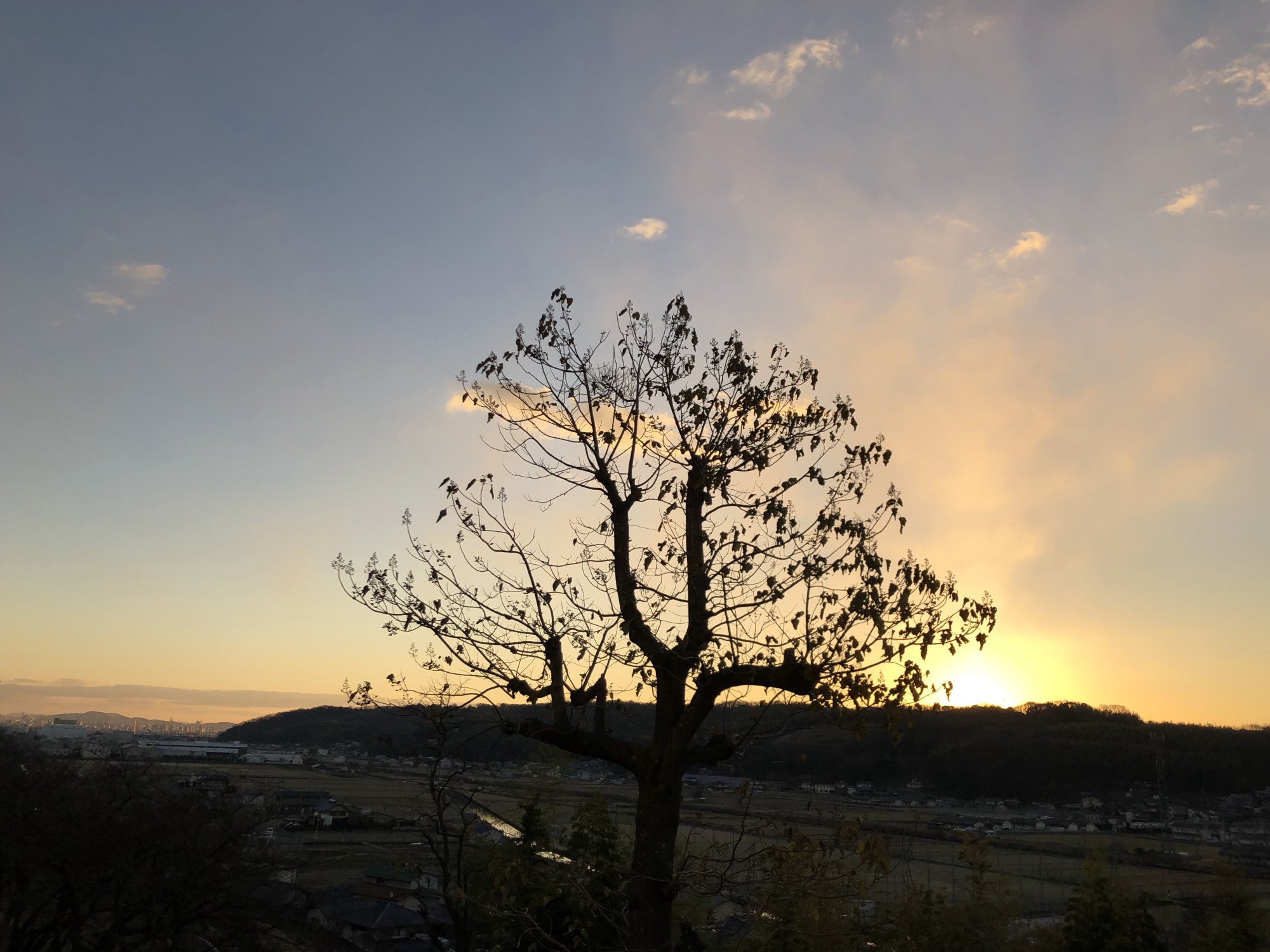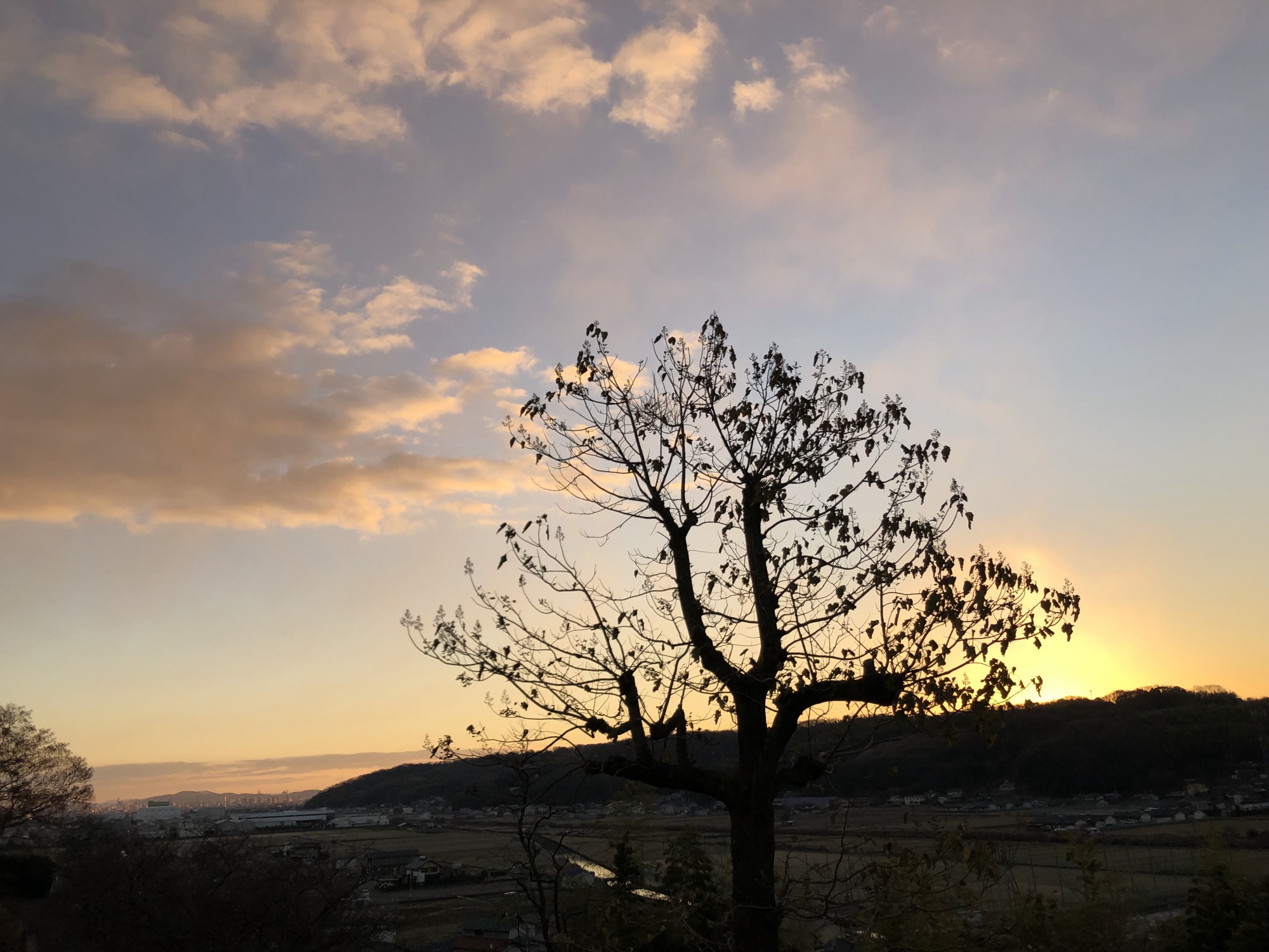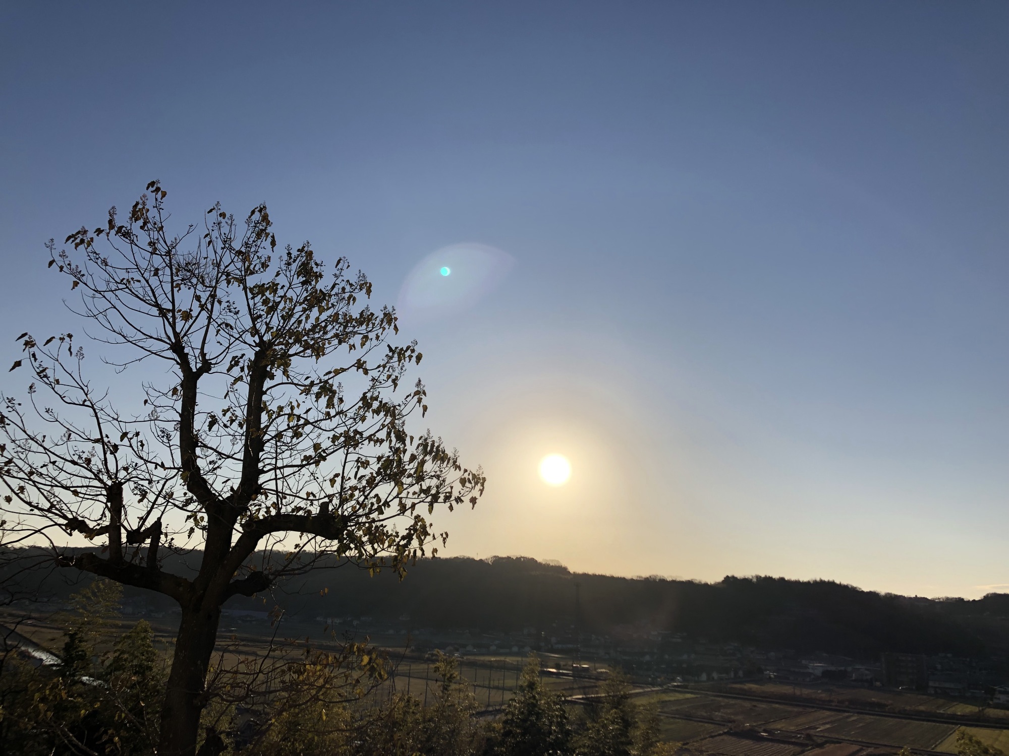 居室の窓から、朝日が・・・向かいの早島の丘陵の向こうから昇ってきています。