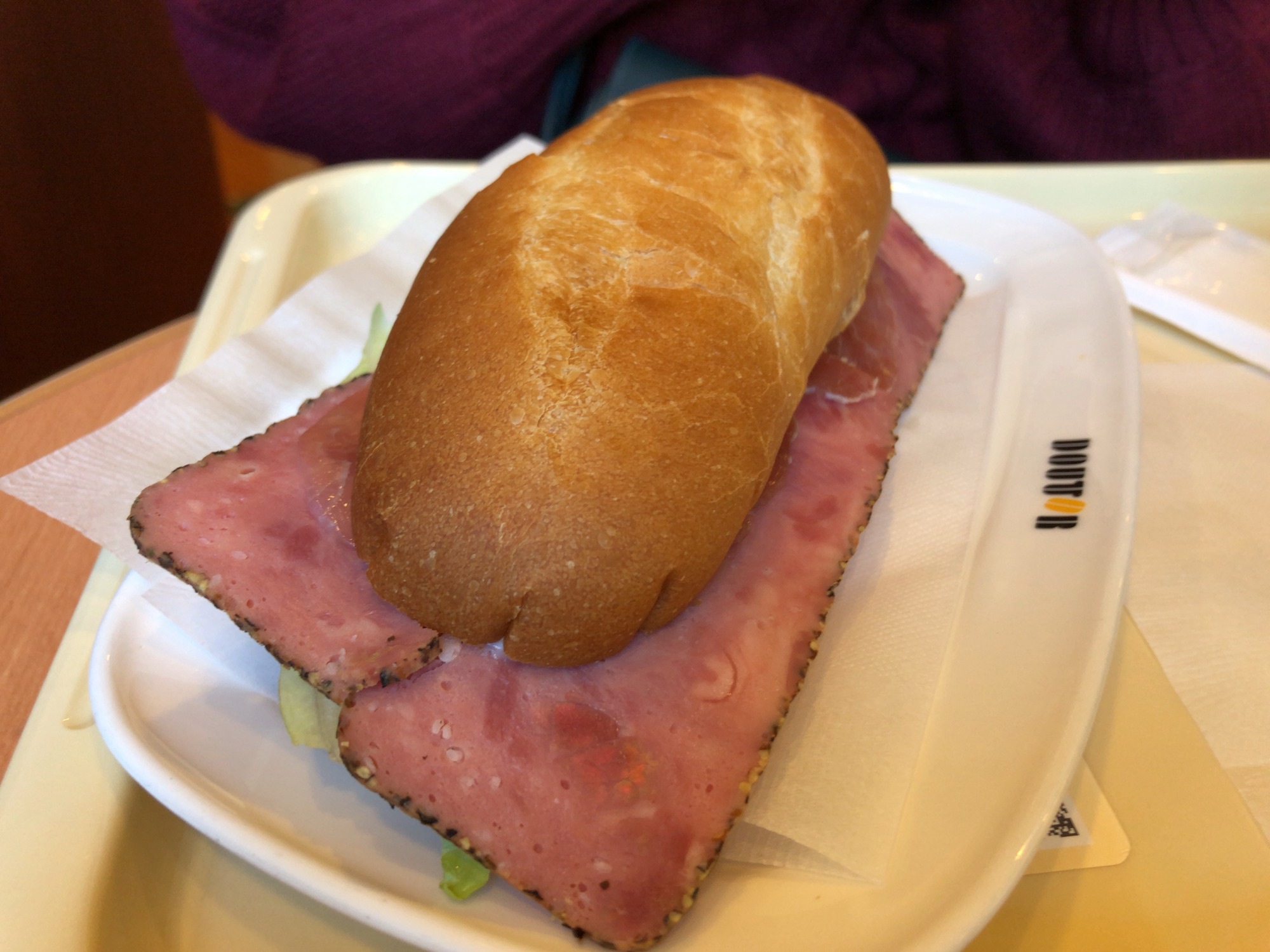 ランチは、休業なしの院内ドトールで! ミラノサンドの鴨肉ローストと、スモークサーモンとぷりぷりエビを半分ずつ!