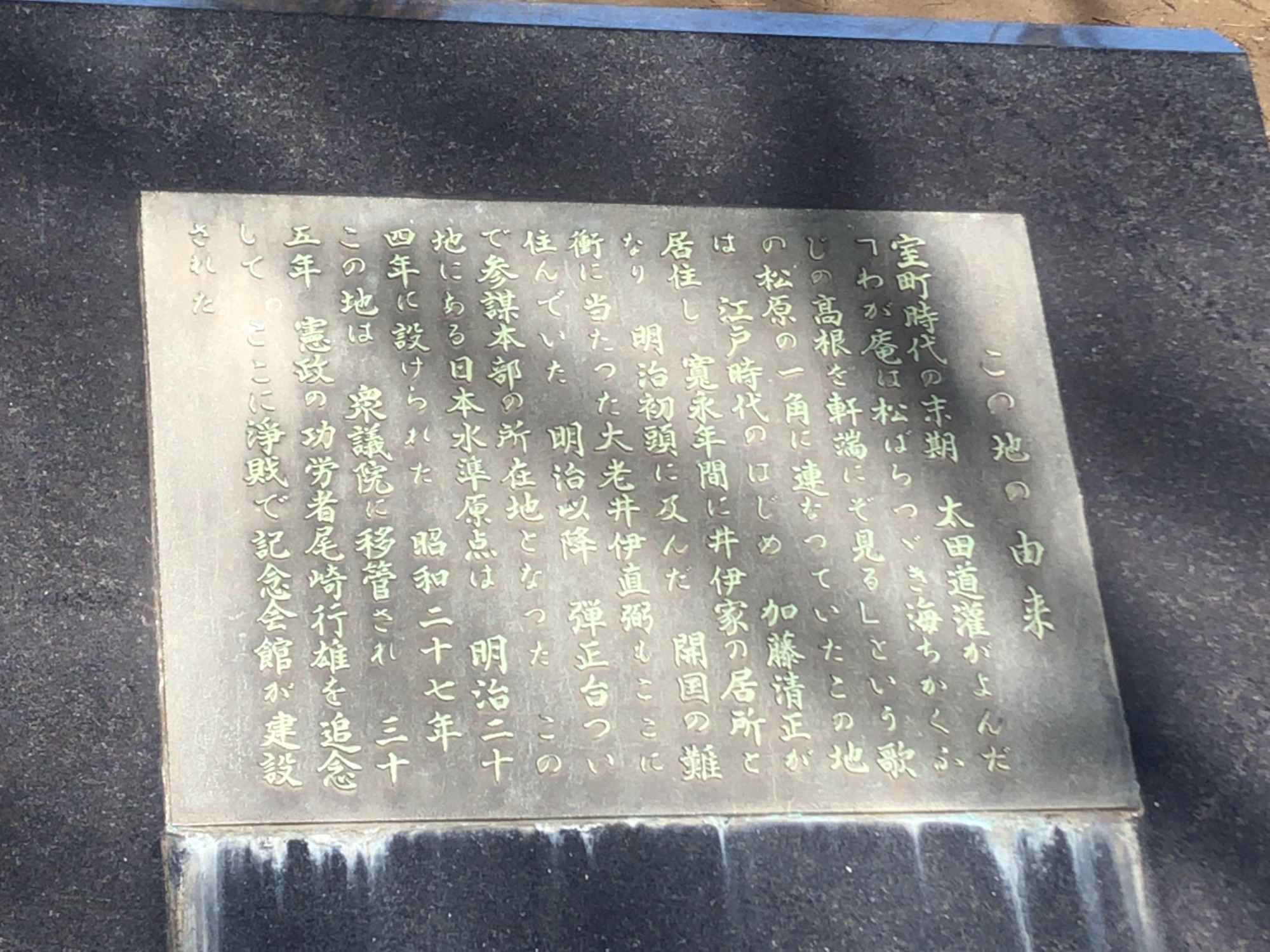 【当館のある高台は、江戸時代の初めには加藤清正が屋敷を建て、その後彦根藩の上屋敷となり、幕末には藩主であり、時の大老でもあった井伊直弼が居住し、後に明治時代になってからは参謀本部・陸軍省がおかれました。】