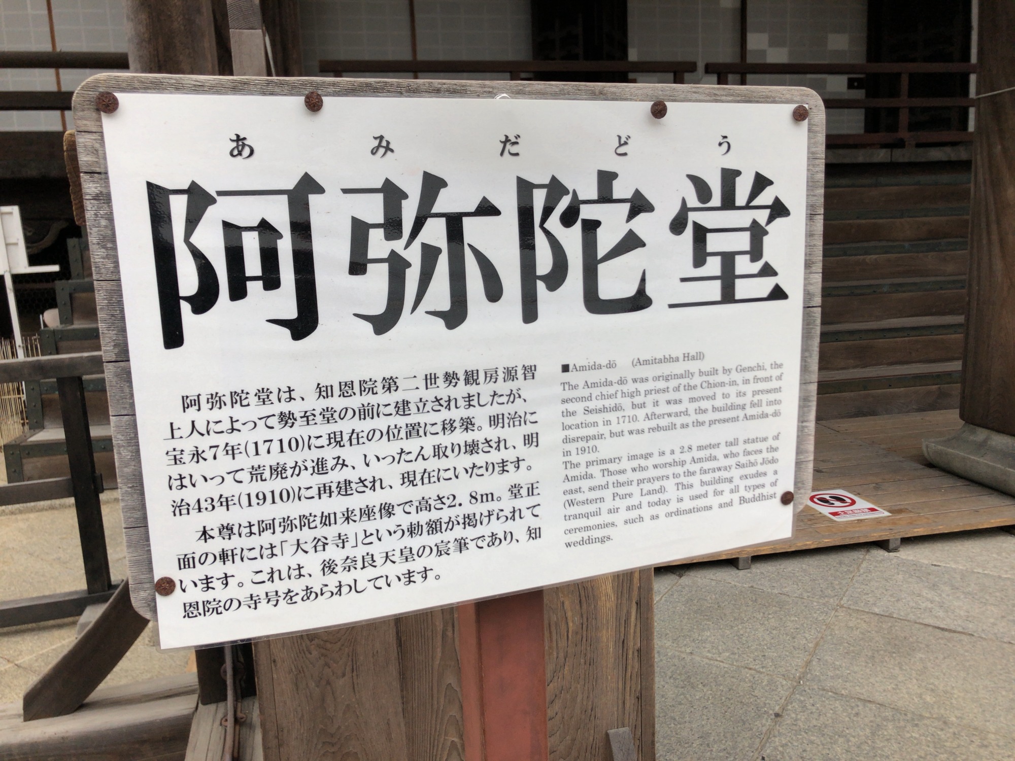 【浄土宗総本山の寺院。山号は華頂山。詳名は華頂山知恩教院大谷寺。本尊は法然上人像(本堂)および阿弥陀如来(阿弥陀堂)、開基(創立者)は法然である。】