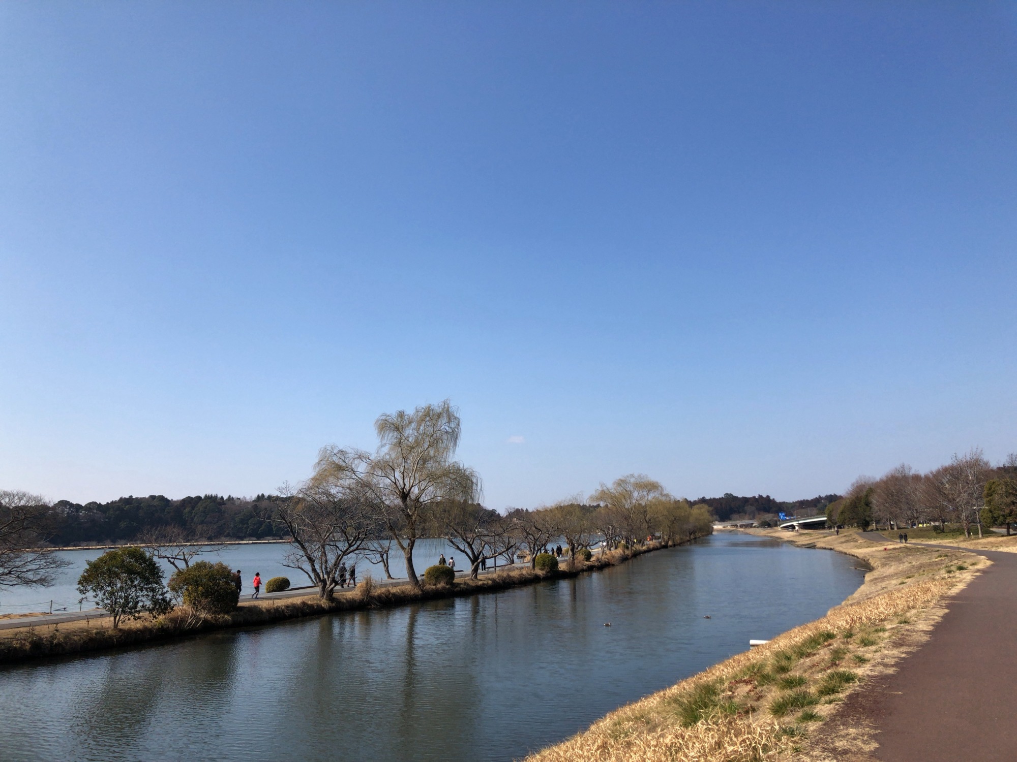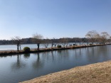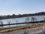 千波湖と桜川~その間に細い堤【千波湖は、西に筑波山、湖面越しに水戸城、吉田神社を望み、"新道"(又は"柳堤")と呼ばれる湖中の柳道が景観に風雅な装いを加えた、見所の多い景勝地であった】