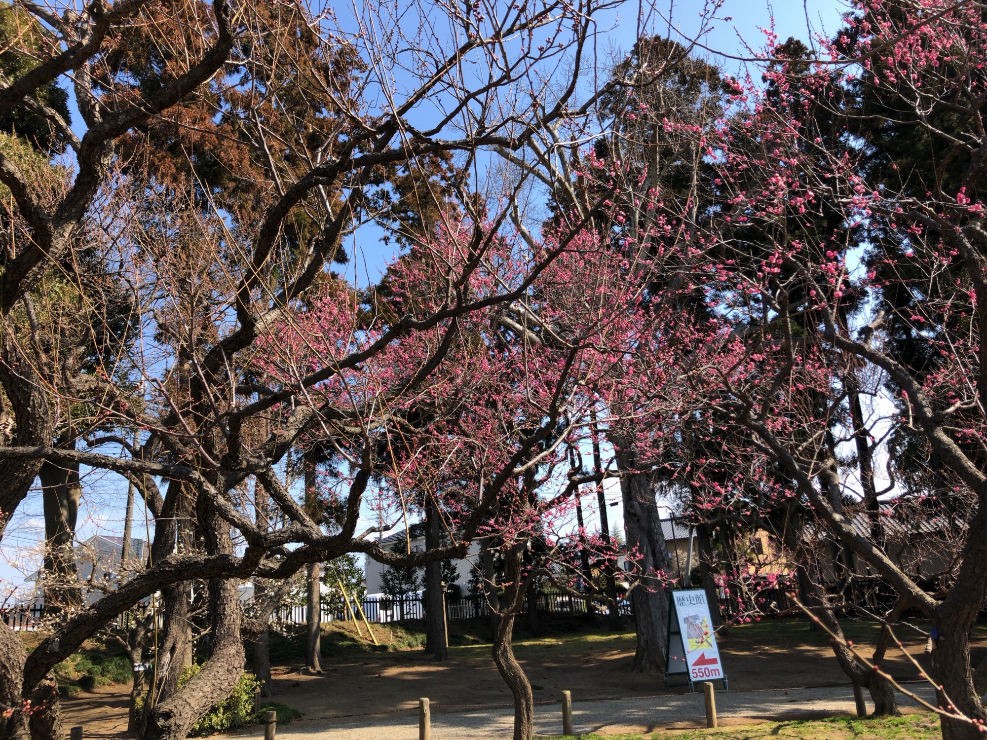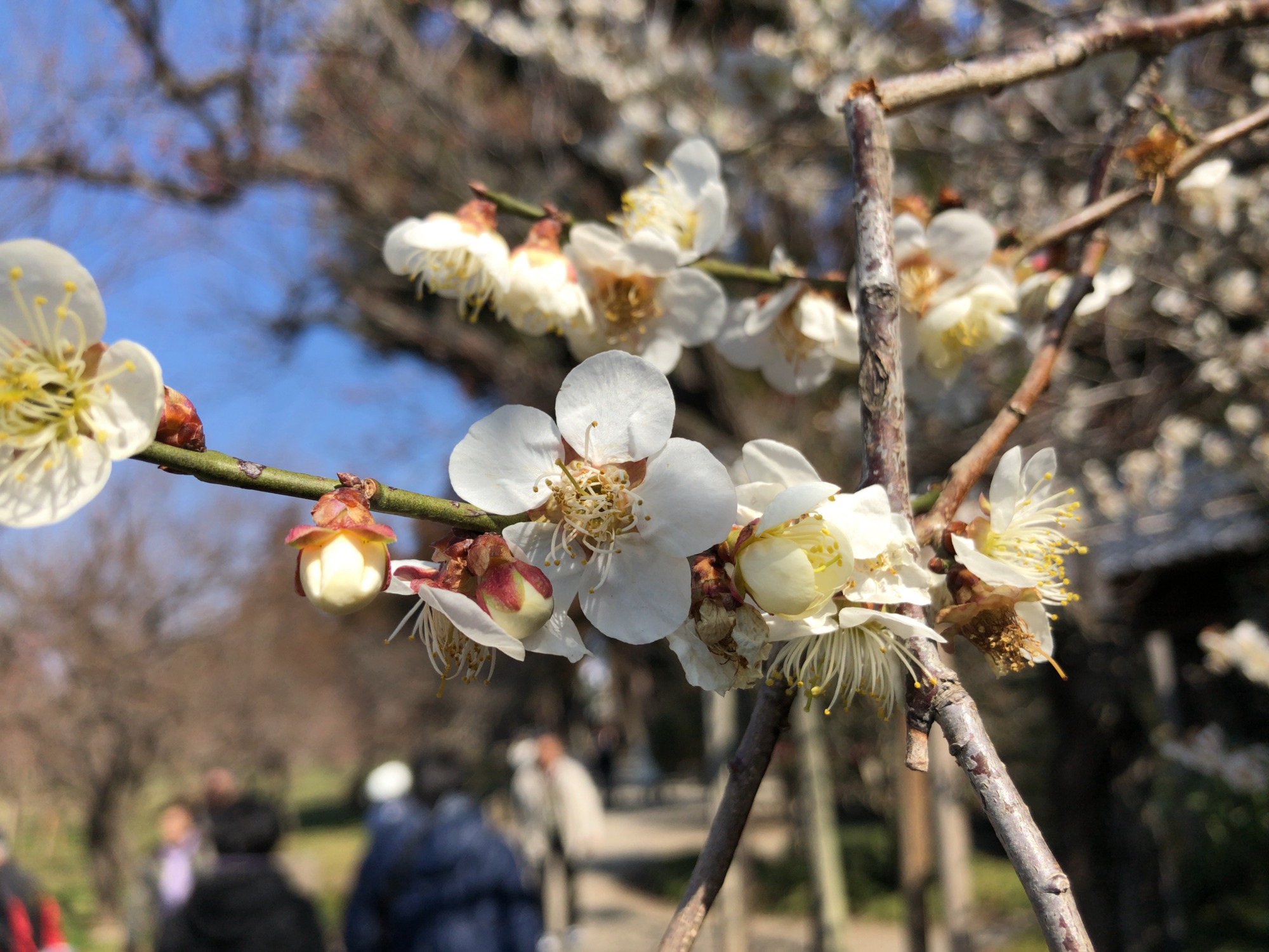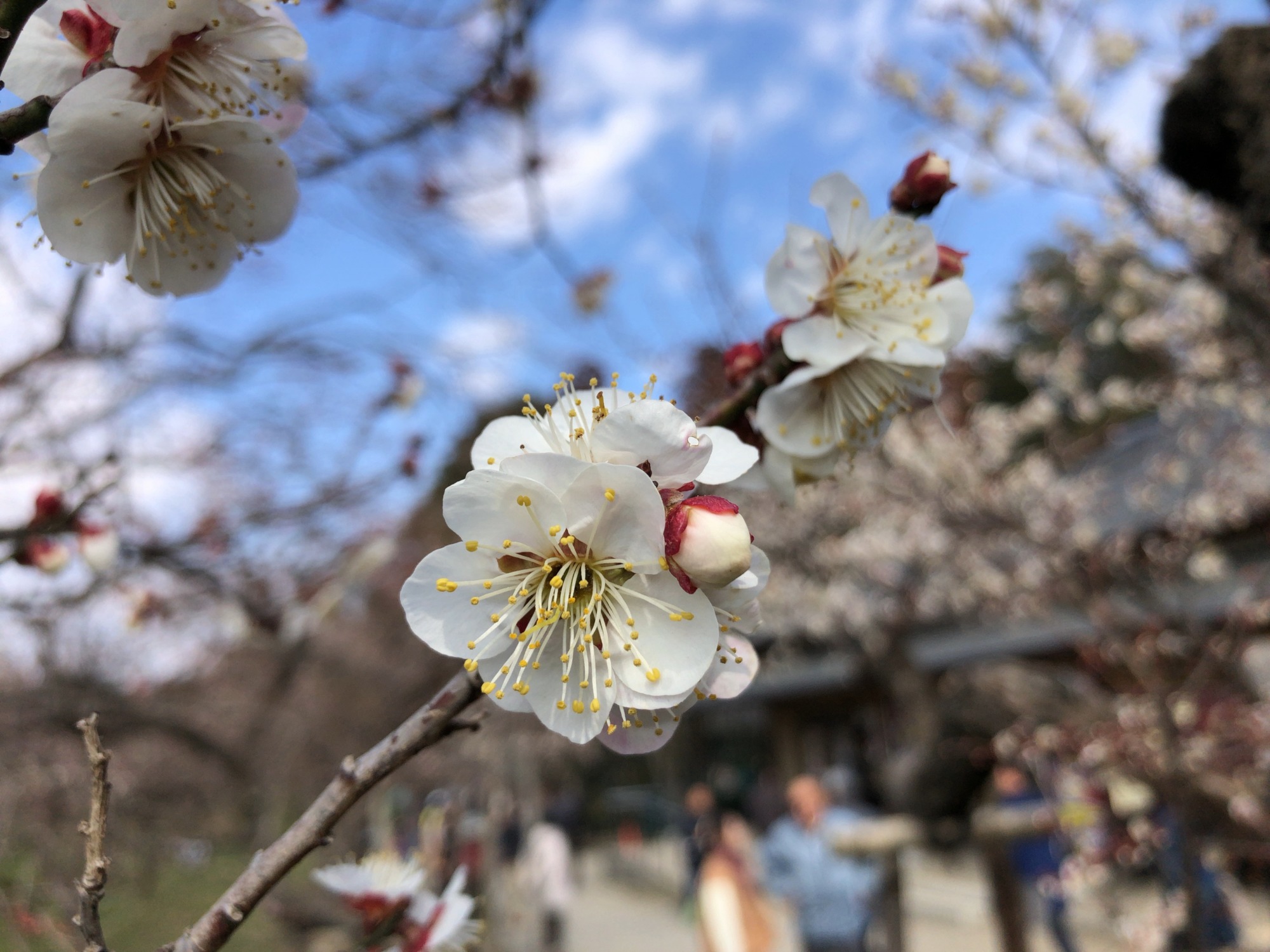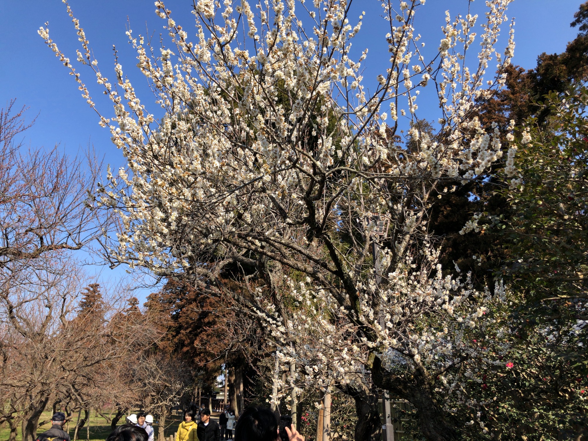 そして、2/16から梅まつり2019が開催中で、土曜の御昼前、人の流れは、みんな偕楽園へって感じで、その流れのままに歩いていると……梅が沢山見えてきました。