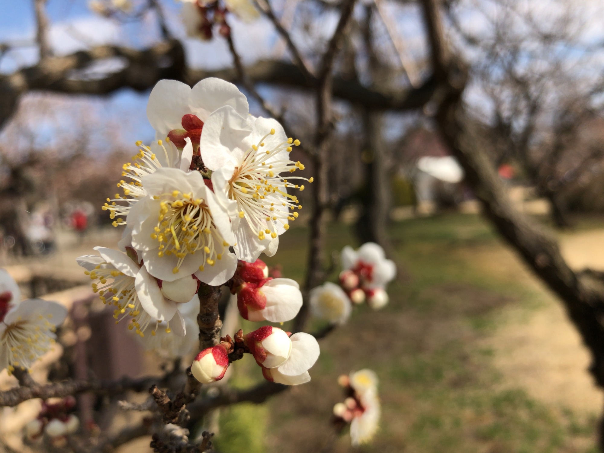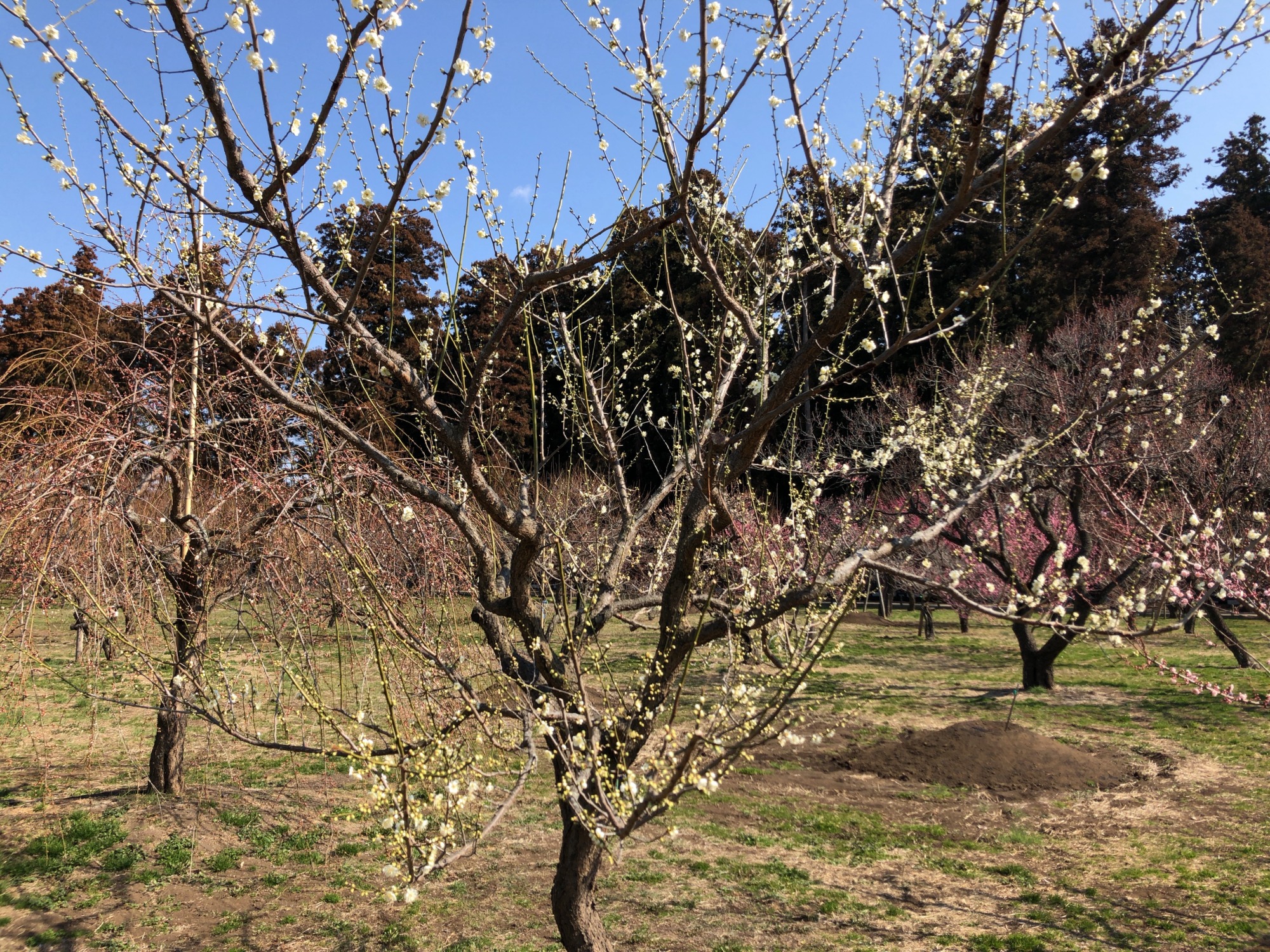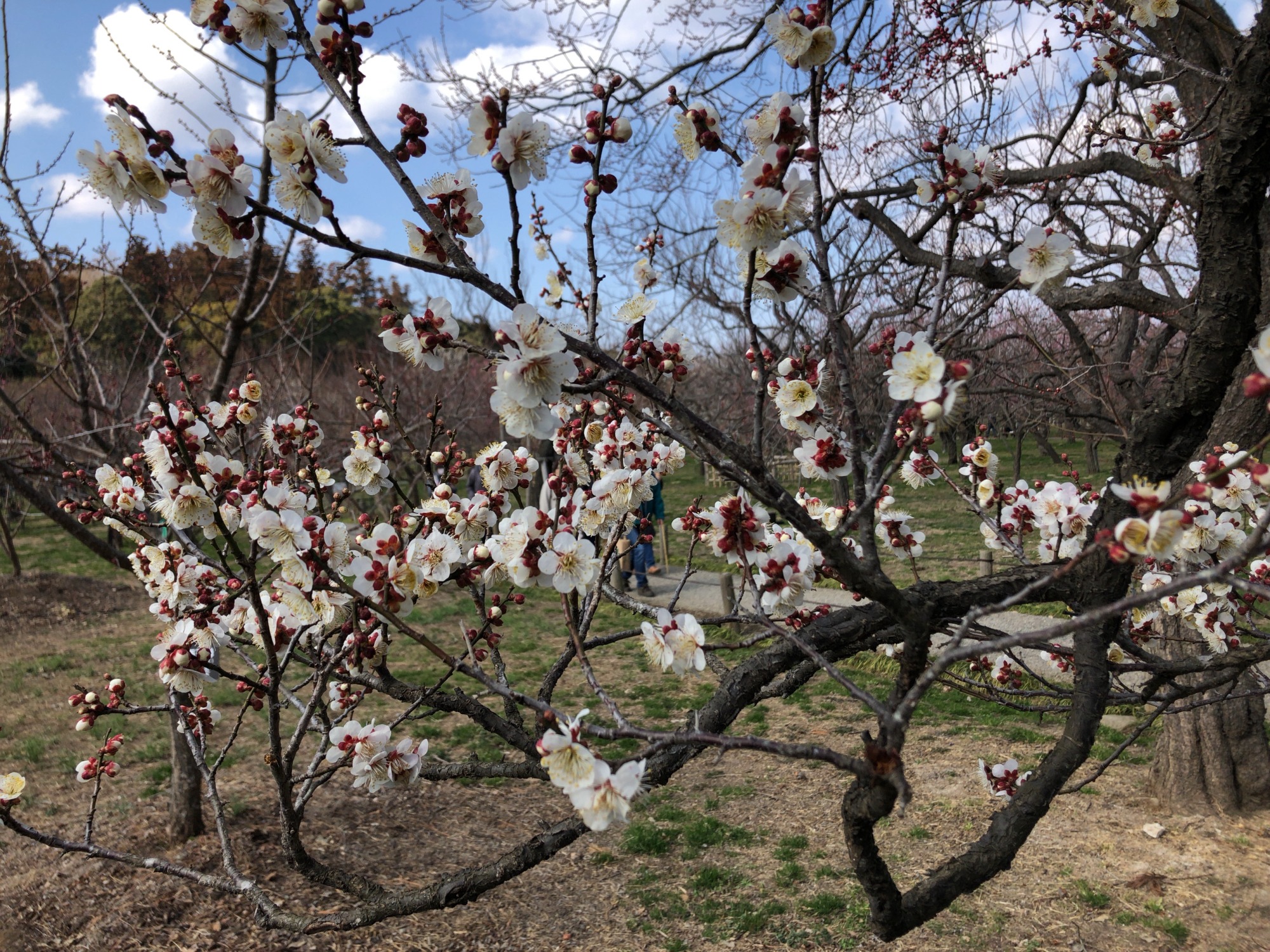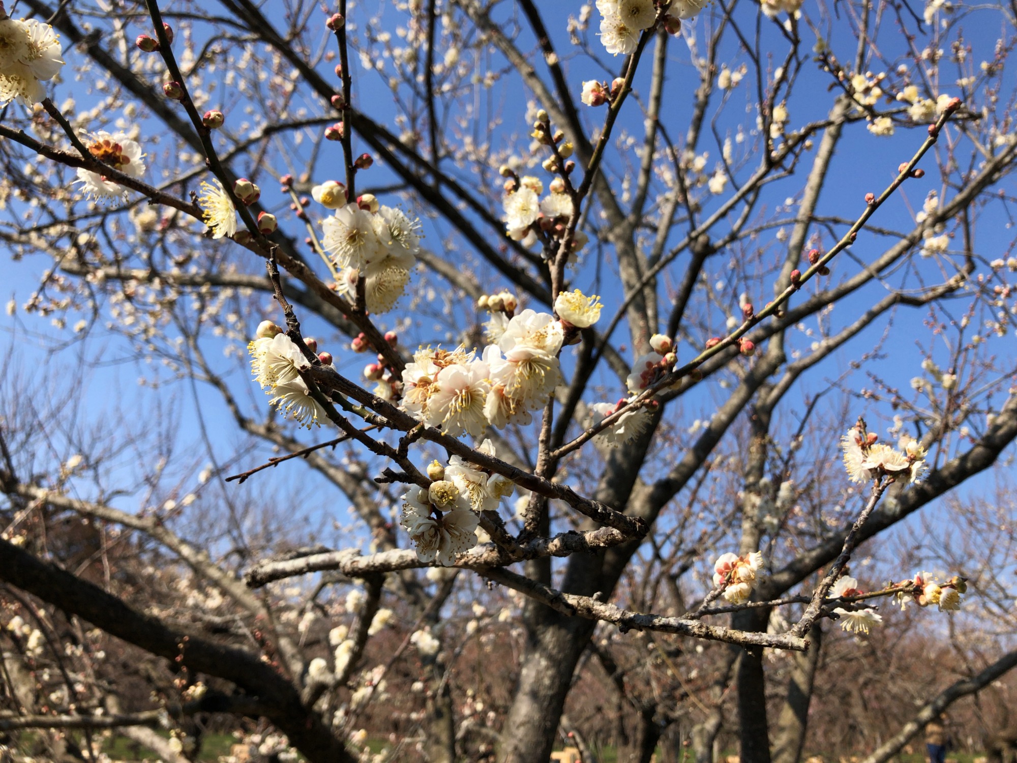 で、そこから園の北側の梅林~3,000本も梅があるそうで(あとで見ると開花率は二日前で約26%だそうですが)…まだ蕾の木も多かったのですが、それでも、沢山!