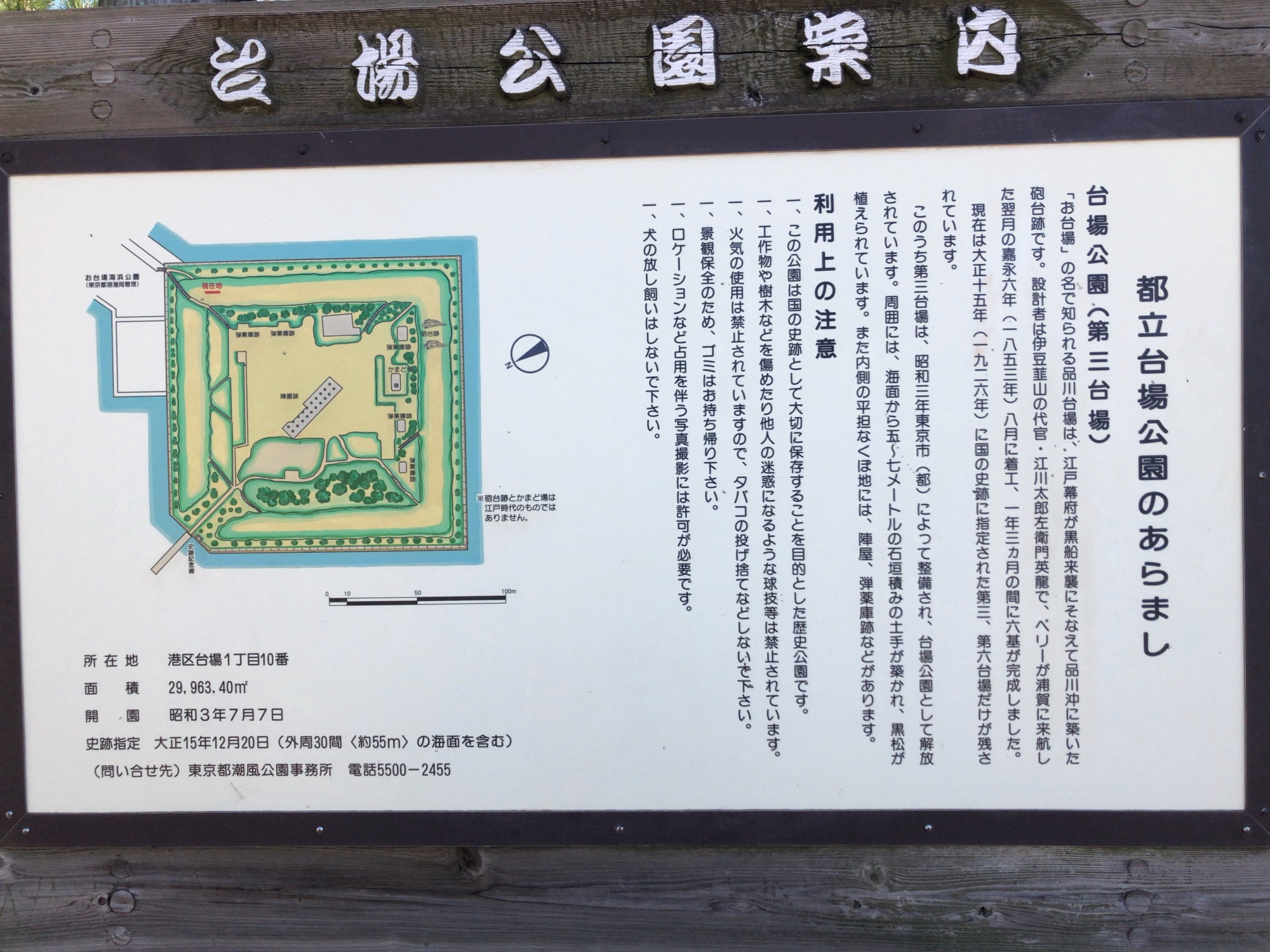 【ペリー艦隊は品川沖まで来たが、この砲台のおかげで横浜まで引き返し、そこでペリーが上陸することになった。台場は石垣で囲まれた正方形や五角形の洋式砲台で、まず海上に第一台場から第三台場が完成、その後に第五台場と第六台場が完成した。第七台場は未完成、第八台場以降は未着手で終わった。】
