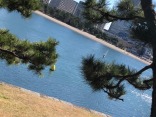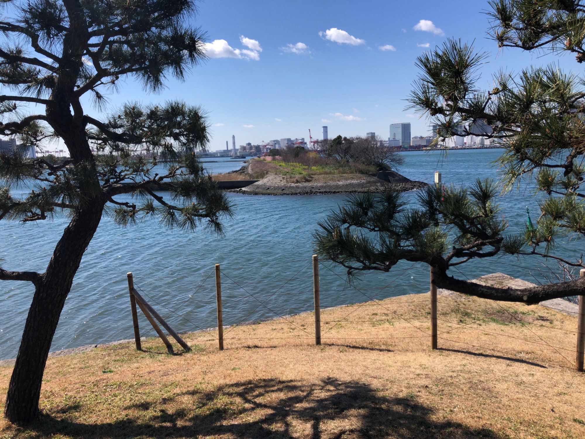 渡れない向こうの台場は、菜の花や・・・桜のピンク??