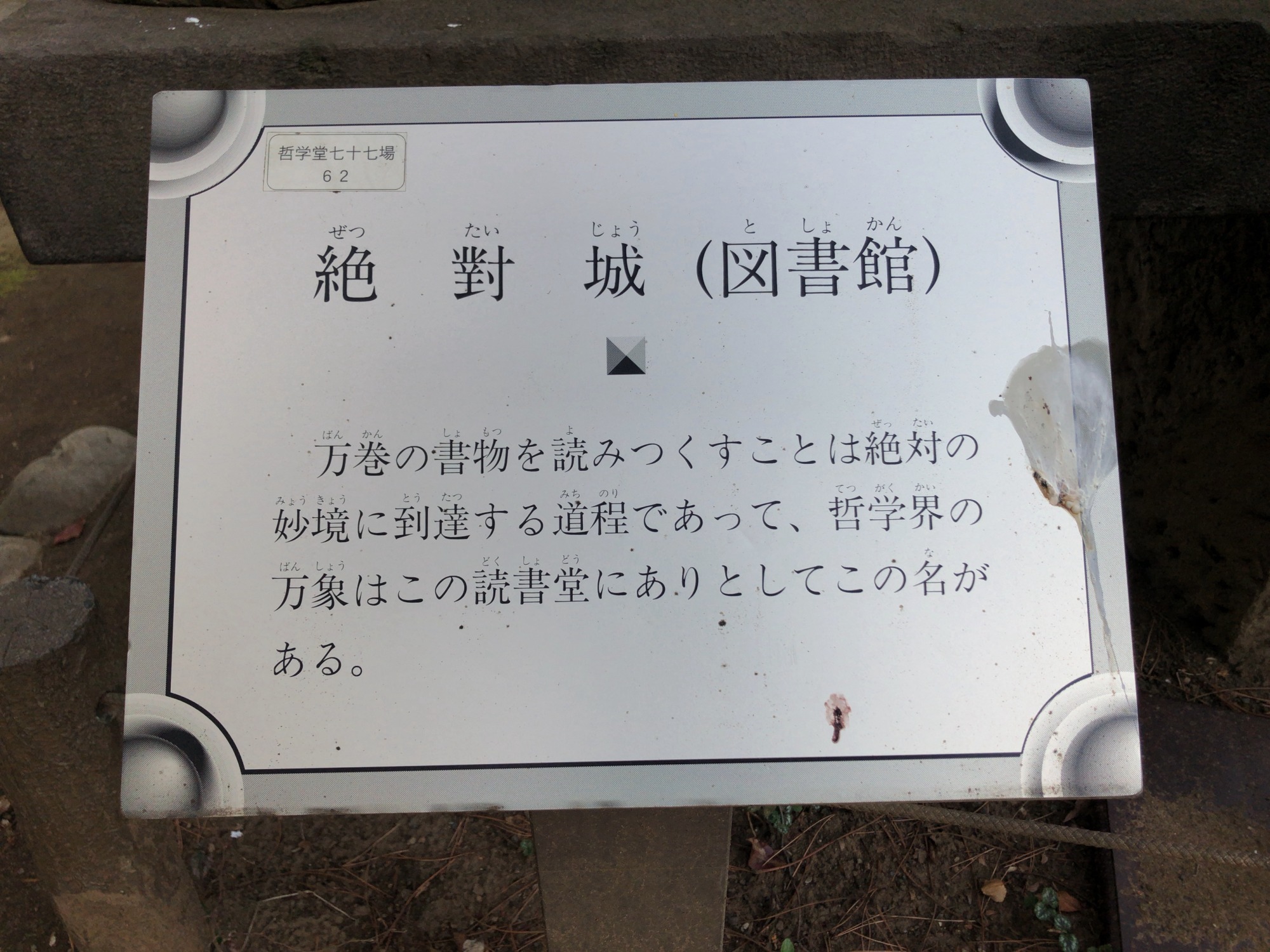 11霊明閣、12百科叢、13時空岡、14四聖堂、15唱念塔、 16六賢台、17天狗松、18筆塚、19懐疑巷、20経験坂、 21感覚巒、22万有林、23三字壇・哲史塀、24三祖碑、25唯物園・哲史蹊、