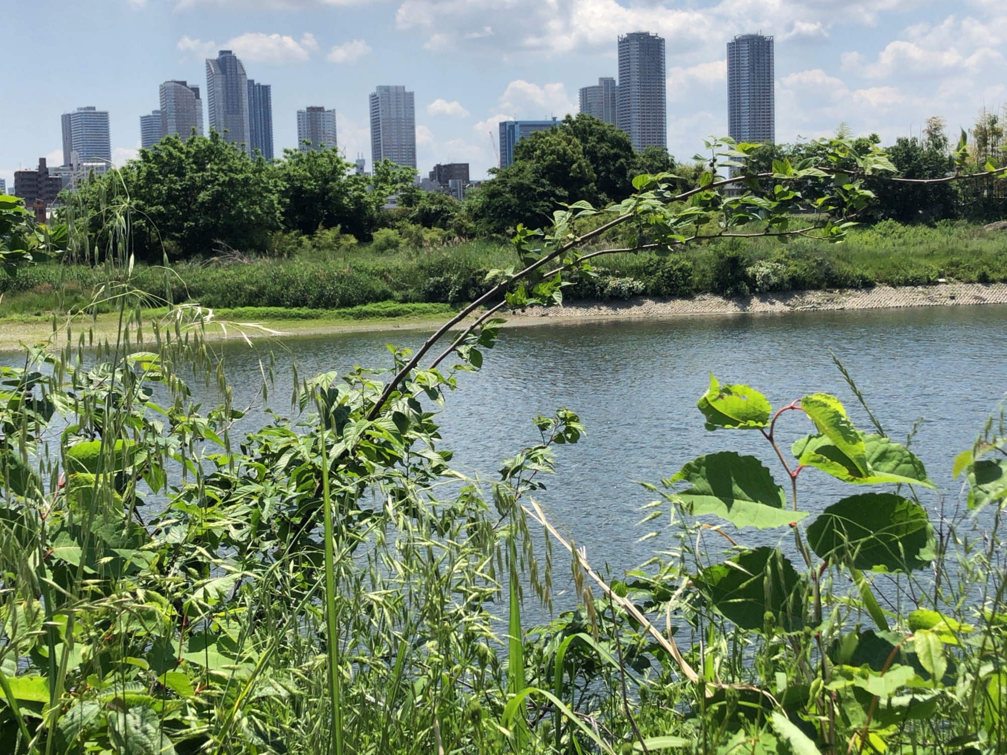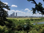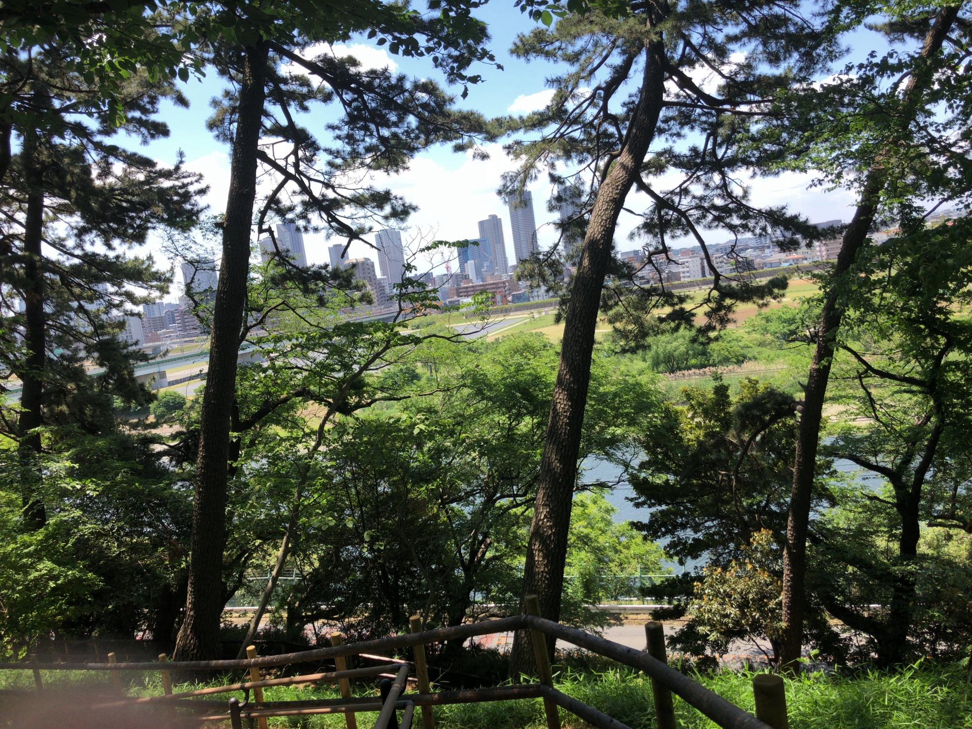 木間越しに・・・武蔵小杉のマンション群や多摩川が見えます。
