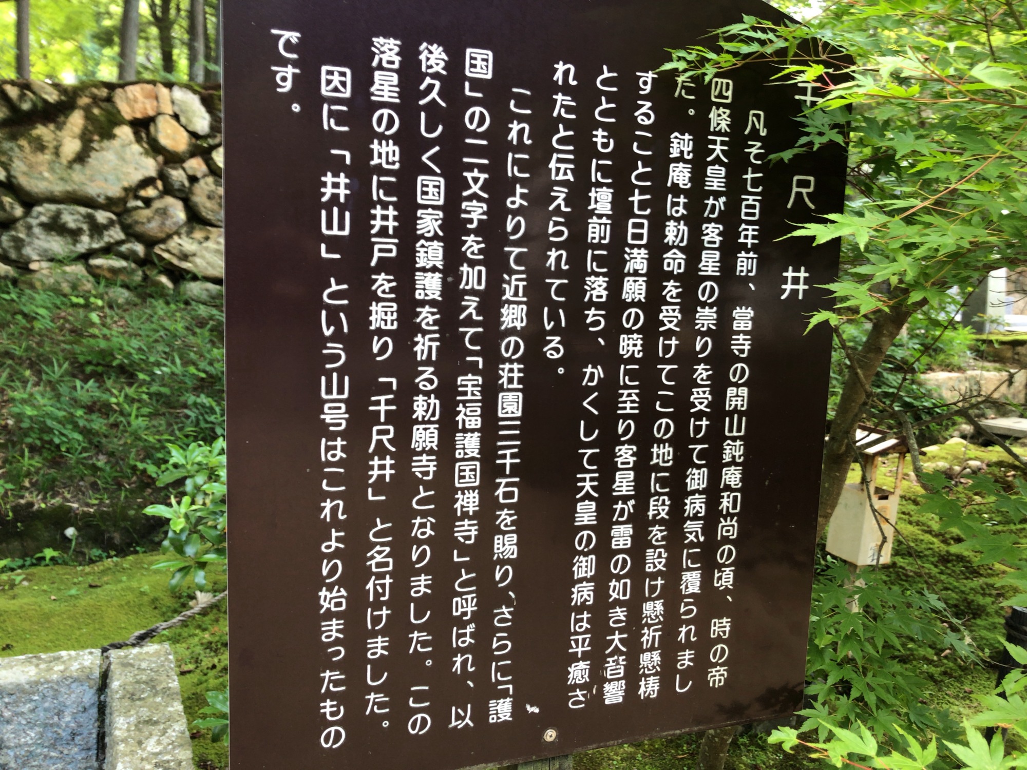 【当時の天皇であった四条天皇は病気となっていた。鈍庵が天皇の病気平癒のために祈祷を行ったところ、壇前に客星が落ち、天皇の病気は平癒したという。星が落ちた場所に井戸を掘り「千尺井」と名付けた。これが山号「井山」の由来となった。その後、寺院は天皇の勅願寺となり発展した。一時は塔頭・学院55、末寺300寺を数えるほどの巨刹となり隆盛を誇った。】