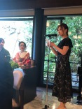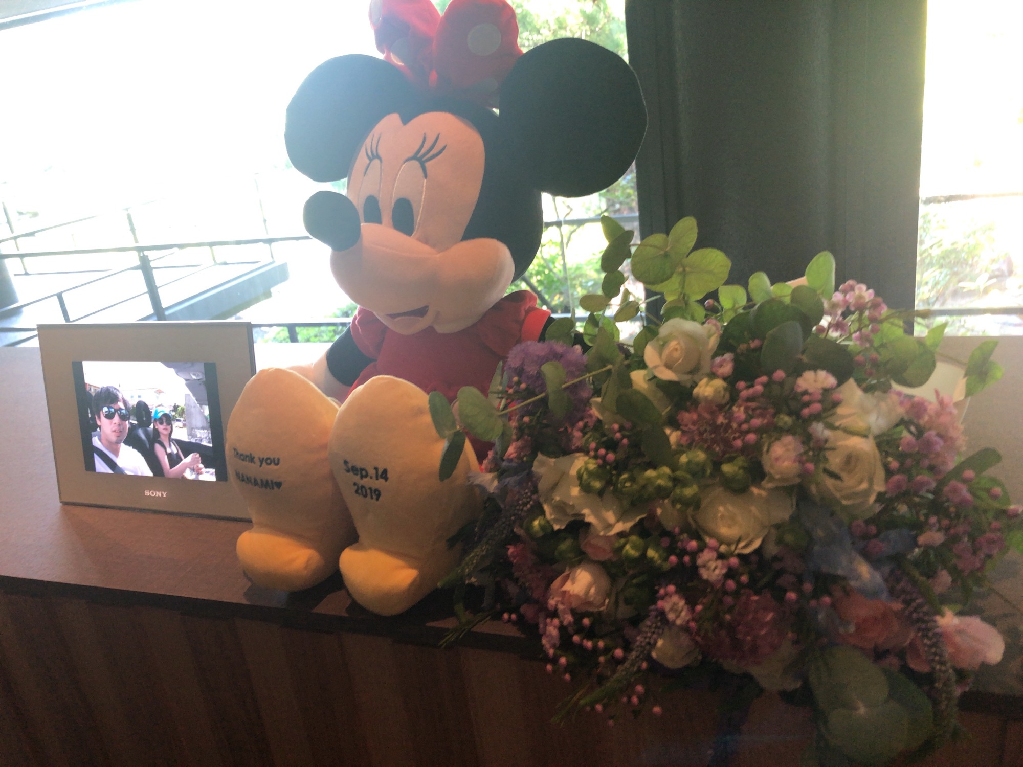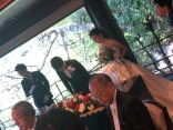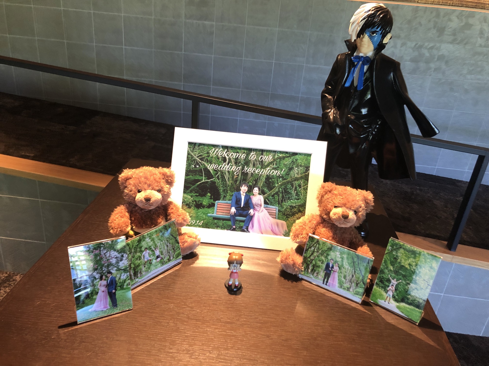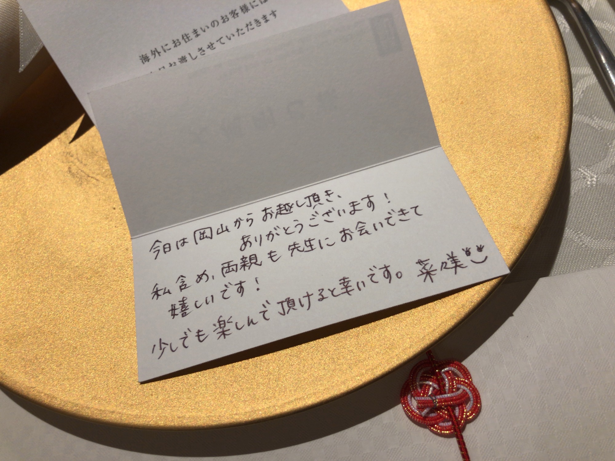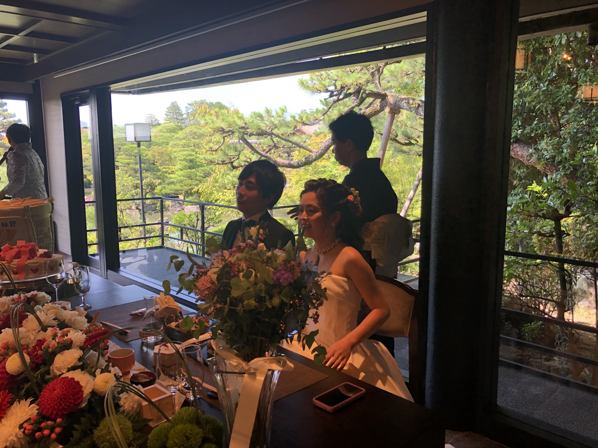 大学の同級生5人と同じテーブルで恐縮でしたが……。名札の背面に・・一人ずつ手書きのメッセージもありました。また、テーブルの花も石庭風の京風で、これも二人のアイデアだとか。