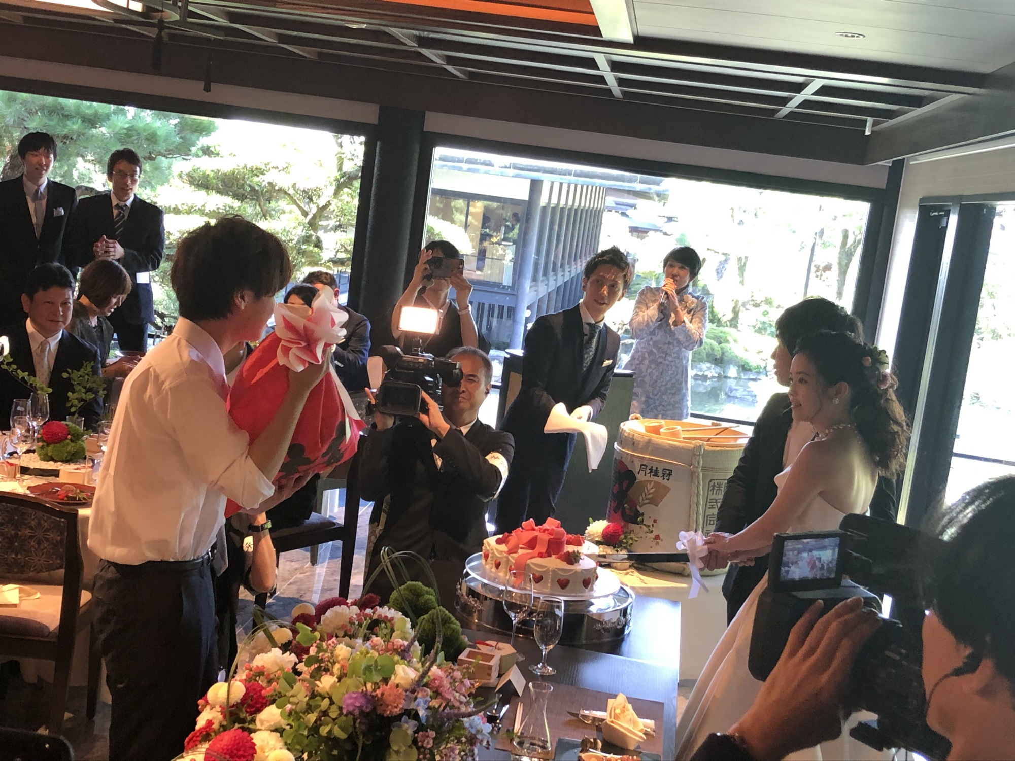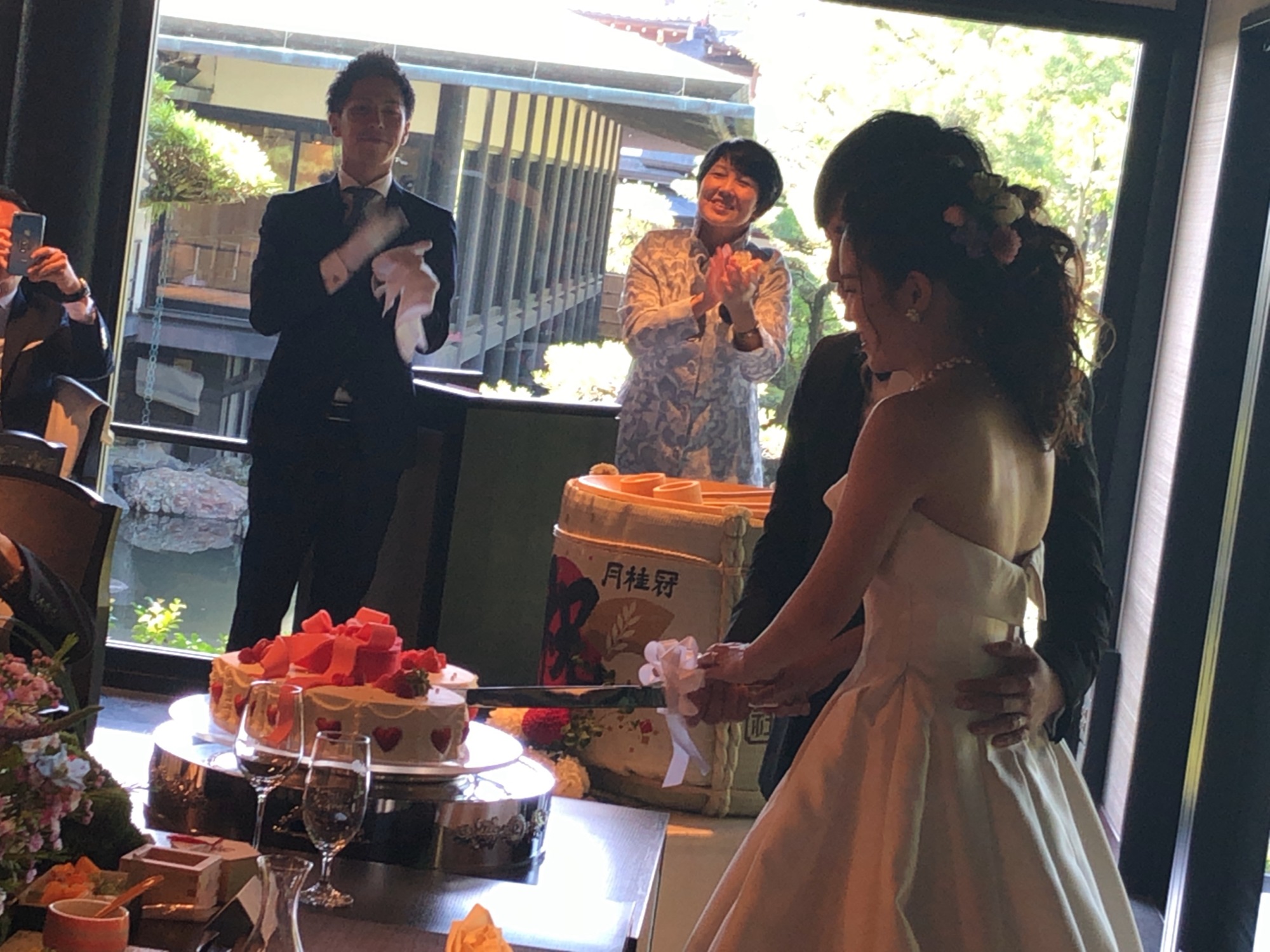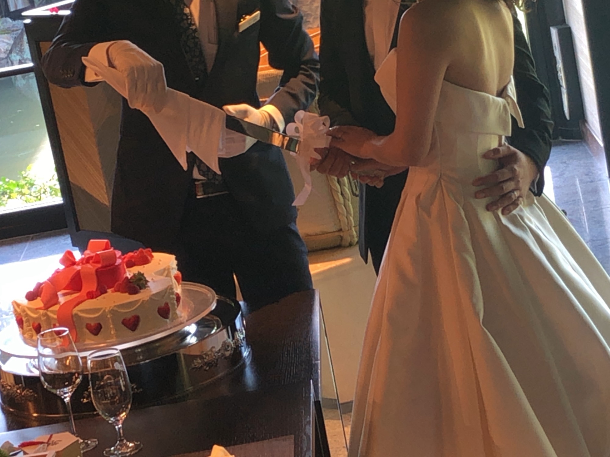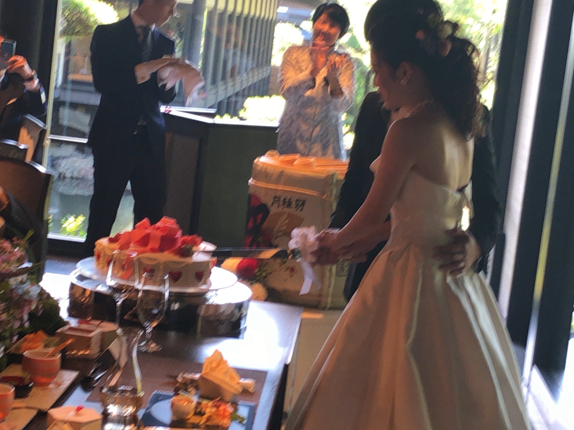 新婦父がサプライズで(当初予定は無かったそうですが)ウェディングケーキへの入刀です。