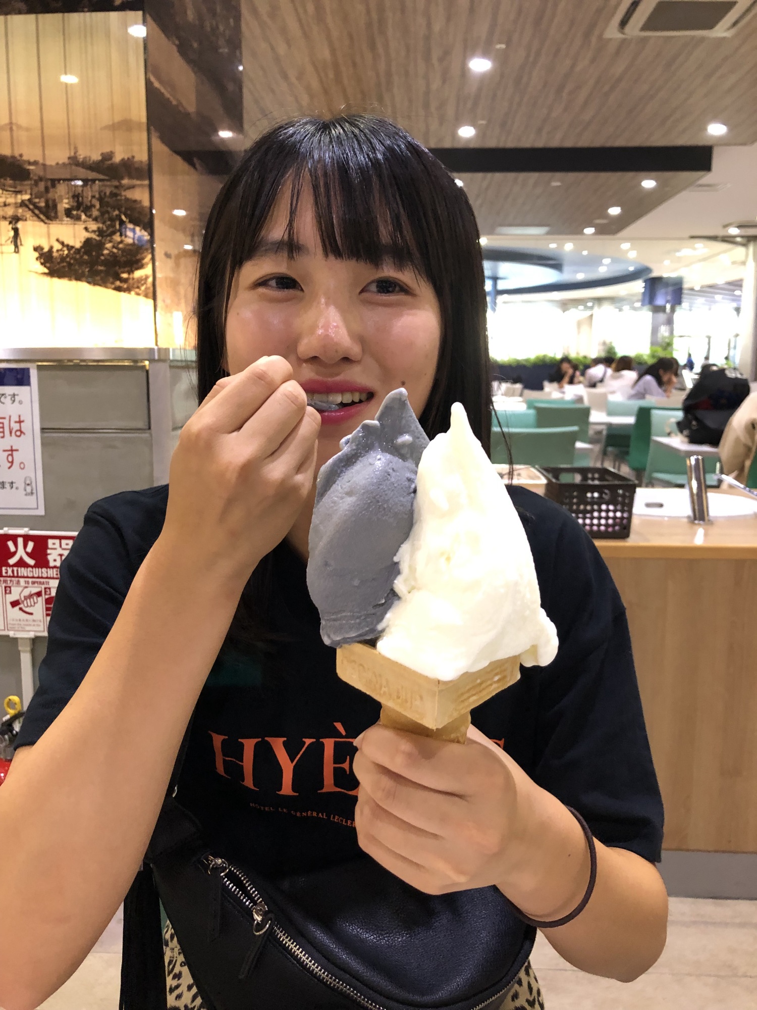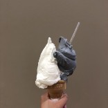 ジェラード、美味しい。竹炭きなことチーズの娘に対して、ボクはマロングラッセとアーモンドクランチ。美味しい、冷える、けど、早く食べないと、たれる‼️