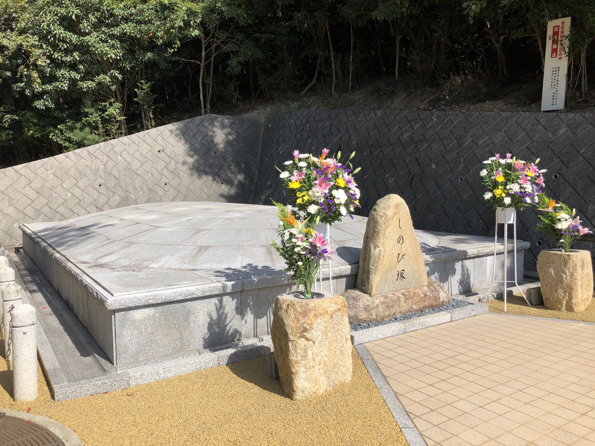 しのびづか公園:昔は死亡しても町の火葬場は紫陽させてもらえず、園内に火葬場があっったそうで、ここは、愛生園との共同利用だったそうです。そこに残骨が納められています。さらに胎児等の標本が49体見つかった(2002年)ことを受けて、その胎児等の鎮魂のために、慰霊の碑が出来て、自治体より花を絶やさないように、とのことだそうです。